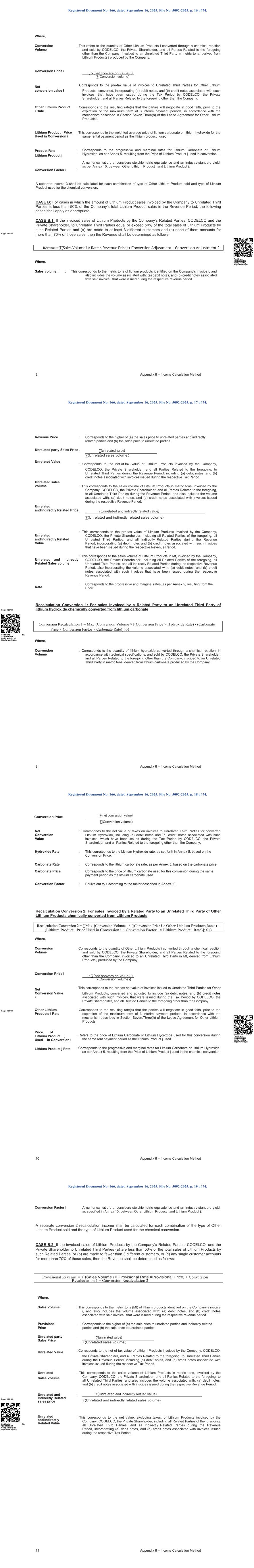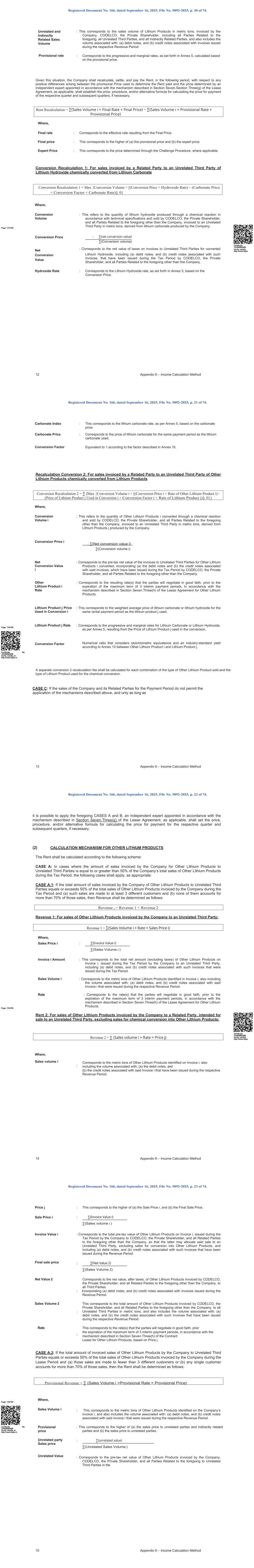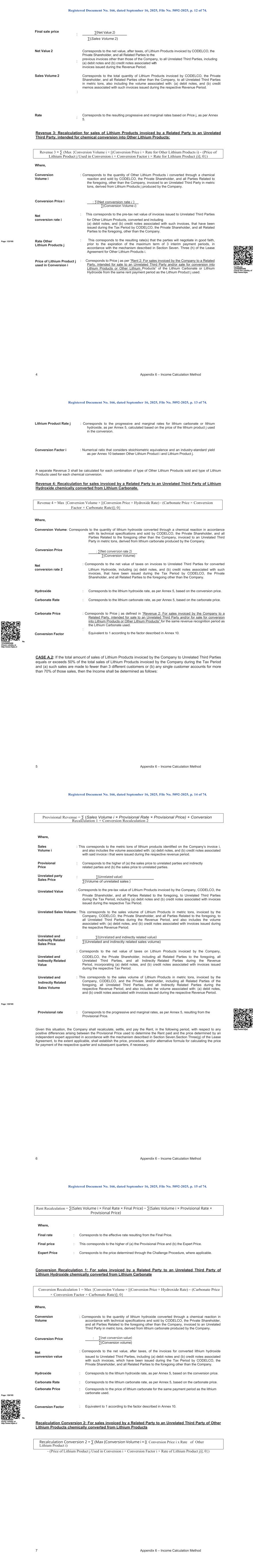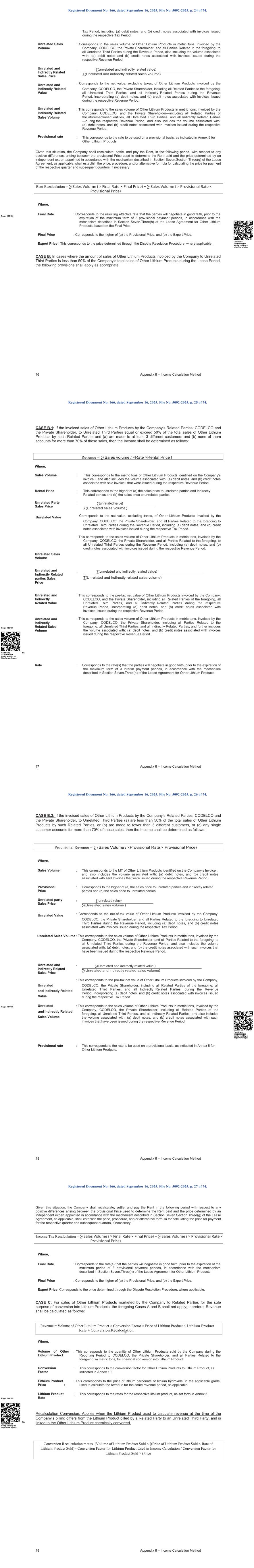 注册文件第166号,日期为2025年9月16日,档案编号5092-2025,第74页第20页。12附录6 –收入计算方法租金重新计算= ∑(销售量i ×最终价格×最终价格)− ∑(销售量i ×暂定价格×暂定价格)转换重新计算1 = Max {转换量× [(转换价格×氢氧化物比率)-(碳酸盐价格×转换系数×碳酸盐比率)];0 }不相关和间接相关的销售量:这对应的是以公吨为单位的锂产品销售量,由公司、CODELCO、私人股东、包括上述所有关联方、所有非关联第三方、所有间接关联方开具发票,并且还包括与以下相关的数量:(a)借方票据,以及(b)与在相应收入期间开具的发票相关的贷方票据。暂定费率:对应累进费率和边际费率,如附件5所述,按暂定价计算。鉴于这种情况,公司应在以下期间就用于确定已付租金的暂定价格与根据第七节所述机制任命的独立专家确定的价格之间产生的任何正差异重新计算、结算和支付租金。租赁协议第三(g)节(如适用)应确定计算相应季度和后续季度的支付价格的价格、程序和/或替代公式(如有必要)。其中,最终利率:对应最终价格产生的有效利率。最终价格:这对应于(a)暂定价格和(b)专家价格中的较高者。专家价格:这与适用时通过质疑程序确定的价格相对应。转换重新计算1:对于关联方向非关联第三方开具发票的由碳酸锂化学转化而来的氢氧化锂的销售,其中,page:131/185转换量:这是指私人股东CODELCO根据技术规范通过化学反应生产并由公司以外的所有前述相关方销售的氢氧化锂的数量,以公吨为单位向非关联第三方开具发票,源自公司生产的碳酸锂。转换价格:∑(净转换价值)证书123456865496净转换价值∑(转换量):对应于已转换氢氧化锂向非关联第三方开具的发票上的税项净值,包括(a)借方票据,以及(b)与此类发票相关的贷方票据,这些票据已由CODELCO、私人股东以及除公司之外的所有与上述相关的各方在纳税期间签发。验证有效性http://www.fojas。氢氧化率:对应于氢氧化锂率,如附件5所述,以换算价格为基础。注册文件第166号,日期为2025年9月16日,档案编号5092-2025,第74页第21页。13附录6 –收益计算方法换算重新计算2 = ∑(Max {换算量i × [(换算价i ×其他锂产品率i)-(换算所用锂产品j的价格i ×换算率i ×锂产品率j)];0 })碳酸盐指数:这对应的是碳酸锂比率,根据附件5,以碳酸盐价格为基础。碳酸盐价格:对应与所用碳酸锂相同付款期限的碳酸锂价格。根据附件10中描述的因子,相当于1的转换因子。重新计算换算2:对于由关联方向非关联第三方开具发票的从锂产品化学转化而来的其他锂产品的销售,其中,换算量i:这是指通过化学反应转化并由私人股东CODELCO和除公司之外的所有与上述相关的各方销售的其他锂产品i的数量,以公吨为单位向非关联第三方开具发票,源自公司生产的锂产品j。转换价格i:∑(净转换价值i)∑(转换量)净转换价值i:对应于I转换的其他锂产品给非关联第三方的发票的税前净值,包含(a)借方票据和(b)与上述发票相关的贷方票据,这些票据已在纳税期间由CODELCO、私人股东以及除公司之外的所有与上述相关的各方签发。其他锂产品i费率:对应各方将善意协商的结果费率,在3个临时付款期最长期限届满前, 根据其他锂产品租赁协议第七.三(h)节所述机制。转换i中使用的锂产品j价格:这对应的是与所使用的锂产品j相同租金支付期的碳酸锂或氢氧化锂的加权平均价格。page:132/185证号123456865496验证有效性http://www.fojas.cl锂产品j率换算系数:对应碳酸锂或氢氧化锂的累进率和边际率,根据附件5,由转换中使用的锂产品j的价格产生。其他锂产品i和锂产品j之间根据附件10考虑化学计量等效性和行业标准产率的数值比率。销售的其他锂产品类型和用于化学转化的锂产品类型的每一组合应分别计算转换2重新计算费。CASE C:如果公司及其关联方在付款期的销售不允许应用上述机制,并且只要注册文件第166号,日期为2025年9月16日,文件编号5092-2025,第74页第22页。14附录6 –收入计算方法收入a =收入1 +收入2收入1 = ∑(销售量i ×率×销售价格i)可以适用上述情况A和B,即根据第七节所述机制任命的独立专家。租赁协议三(g)(如适用)应确定相应季度和后续季度的价格、程序和/或计算价格的替代公式(如有必要)。(二)其他锂产品的计算机制租金按以下方案计算:案例A:公司就其他锂产品向非关联第三方开具的销售发票金额等于或大于公司该纳税期间其他锂产品销售总额的50%的情形,适用以下情形,视情况:CASE A.1:如果公司向非关联第三方开具发票的其他锂产品销售总额等于或超过公司在纳税期间开具发票的其他锂产品销售总额的50%且(a)该等销售是向至少3个不同的客户进行且(b)这些客户均不占该等销售的70%以上,则应按以下方式确定收入:收入1:对于公司向非关联第三方开具发票的其他锂产品销售:凡,销售价格i:rans(发票价值i)rans(销售量)发票i金额:这对应于公司在纳税期间向非关联第三方开具的发票i上的其他锂产品的总净额(不含税),包括(a)借方票据,以及(b)与在纳税期间开具的此类发票相关的贷方票据。销量i:对应于发票i中确定的其他锂产品的公吨,还包括与以下相关的销量:(a)借方票据,以及(b)在相应的收入期间签发的与上述发票i相关的贷方票据。Page:133/185费率:对应于根据《其他锂产品租赁协议》第七节所述机制,在3个临时付款期的最长期限届满之前,各方将本着诚意协商的费率。三(h)。租