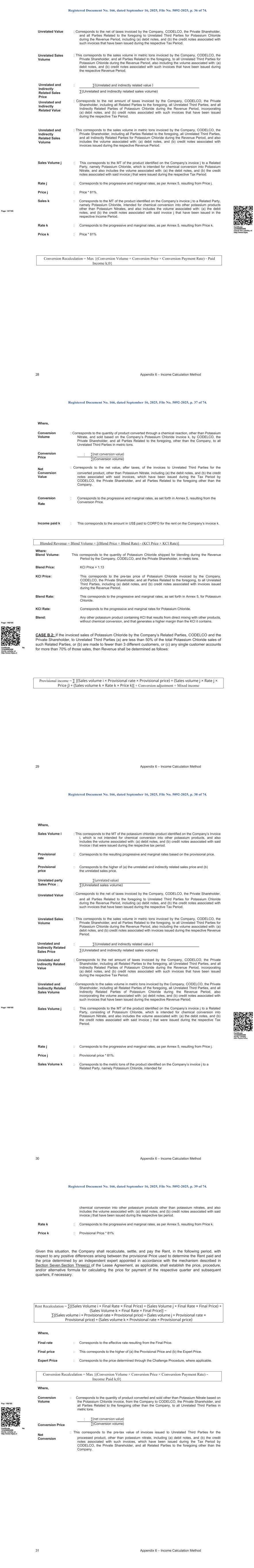 注册文件第166号,日期为2025年9月16日,档案编号5092-2025,第74页第36页。28附录6 –收益计算方法不相关价值:对应于公司、CODELCO、私人股东以及与上述相关的所有各方在收入期间就氯化钾向不相关的第三方开具发票的税后净额,包括(a)借方票据,以及(b)在相应的纳税期间已开具的与此类发票相关的贷方票据。非关联销售量:这对应于公司、CODELCO、私人股东以及与上述相关的所有各方在收入期间向所有非关联第三方开具的氯化钾发票的销售量(以公吨为单位),还包括与以下相关的销售量:(a)借方票据,以及(b)与已在相应收入期间开具的此类发票相关的贷方票据。:∑(非关联及间接关联价值)∑(非关联及间接关联销量):对应于公司、CODELCO、私人股东、包括上述所有关联方、所有非关联第三方、以及所有间接关联方在收入期间内开具的氯化钾发票的税项净额,其中包含(a)借方票据,以及(b)已在相应纳税期内开具的与该等发票相关的贷方票据。:这对应于公司、CODELCO、私人股东、包括与上述相关的所有各方、所有非关联第三方和所有间接关联方在收入期间就氯化钾开具发票的销量公吨,还包括与以下相关的销量:(a)借方票据,以及(b)与在相应收入期间开具的发票相关的贷方票据。销量j:这对应于公司发票j上确定的产品给关联方的MT,即氯化钾,用于化学转化为硝酸钾,还包括与以下相关的数量:(a)借方票据,以及(b)在相应的纳税期间签发的与上述发票j相关的贷方票据。率j:对应累进率和边际率,按附件5,由价格j产生。价格j:价格*81%.page:147/185销售额k:对应于公司发票j上确定的给关联方的产品的MT,即氯化钾,打算用于化学转化为硝酸钾以外的其他钾产品,还包括与以下相关的数量:(a)借方票据,以及(b)已在相应收入期间开具的与上述发票j相关的贷方票据。率k:对应累进率和边际率,按附件5,由价格k产生。价格k:价格*81%证123456865496查http://www.fojas有效性。转换重新计算= Max {(转换量×转换价格×转换付款率)-已付收入k;0 }不相关和间接相关的销售价格不相关和间接相关的价值不相关和间接相关的销售数量注册文件第166号,日期为2025年9月16日,文件编号5092-2025,第74页第37页。29附录6 –收入计算方法其中,转换量:对应于通过化学反应转化的产品数量,硝酸钾除外,并根据公司的氯化钾发票k,由CODELCO、私人股东和除公司之外的所有与上述相关的各方以公吨为单位销售给所有无关联第三方。转换价格:∑(净转换价值)净转换价值∑(转换量):对应于除硝酸钾以外的转换产品向非关联第三方开具的发票的税后净值,包括(a)借方票据,以及(b)与上述发票相关的贷方票据,这些票据已在纳税期间由CODELCO、私人股东以及除公司之外的所有与上述相关的各方签发。折算率:对应于累进和边际折算率,如附件5所述,由折算价产生。已付收入k:这对应于公司发票k上的租金支付给CORFO的美元金额。其中:混合量:这对应于公司、CODELCO和私人股东在收入期间为混合而发运的氯化钾数量,单位为公吨。混合价格:KCL价格× 1.13 KCL价格:这对应于公司、CODELCO、私人股东以及与上述相关的所有各方向所有非关联第三方开具的氯化钾发票的税前价格,包括(a)借方票据,以及(b)与在收入期间开具的发票相关的贷方票据。混合率:这对应于累进率和边际利率, 如附件5所述,为氯化钾。KCL率:对应氯化钾累进率和边际率。page:148/185证书编号123456865496验证有效性http://www.fojas.cl Blend:任何其他含有KCL的钾产品,其与其他产品直接混合产生,无需化学转化,且产生的毛利高于其所含的KCL。案例B.2:如果公司的关联方CODELCO和私人股东向非关联第三方销售氯化钾的开票销售额(a)低于该关联方氯化钾总销售额的50%,或(b)向少于3个不同客户进行,或(c)任何单一客户占该等销售额的70%以上,则收入按如下方式确定:混调收入=混调量× [(混调价格×混调率)-(KCL价格× KCL率)]暂设收入= ∑ [(销量i ×暂定率×暂定价)+(销量j ×率j ×价格j)+(销量k ×率k ×价格k)] +折算调整+混合收入登记文件第166号,日期为2025年9月16日,文件编号5092-2025,第74页第38页。30附录6 –收入计算方法,其中,销售量i:这对应于公司发票i上确定的氯化钾产品的MT,该产品不打算用于化学转化为其他钾产品,还包括与以下相关的数量:(a)借方票据,以及(b)在相应的纳税期间签发的与上述发票i相关的贷方票据。暂定费率:对应基于暂定价的所得累进和边际费率。暂定价格:对应(a)非关联、间接关联销售价格与(b)非关联销售价格两者中的较高者。非关联方销售价格:∑(非关联方价值)非关联方价值∑(非关联方销量):对应于公司、CODELCO、私人股东以及与上述相关的所有各方在收入期间就氯化钾向非关联第三方开具发票的税后净额,包括(a)借方票据,以及(b)已在相应纳税期间开具的与该等发票相关的贷方票据。:这对应于公司、CODELCO、私人股东以及与上述相关的所有各方在收入期间向所有无关联第三方开具的氯化钾发票的销量公吨,还包括与以下相关的销量:(a)借方票据,以及(b)与在相应收入期间开具的发票相关的贷方票据。:∑(非关联及间接关联价值)∑(非关联及间接关联销量):对应公司、CODELCO、私人股东、包括上述所有关联方、所有非关联第三方、以及所有间接关联方在收入期间内开具的氯化钾发票的税项净额,其中包含(a)借方票据,以及(b)在相应纳税期内已开具的与该等发票相关的贷方票据。
