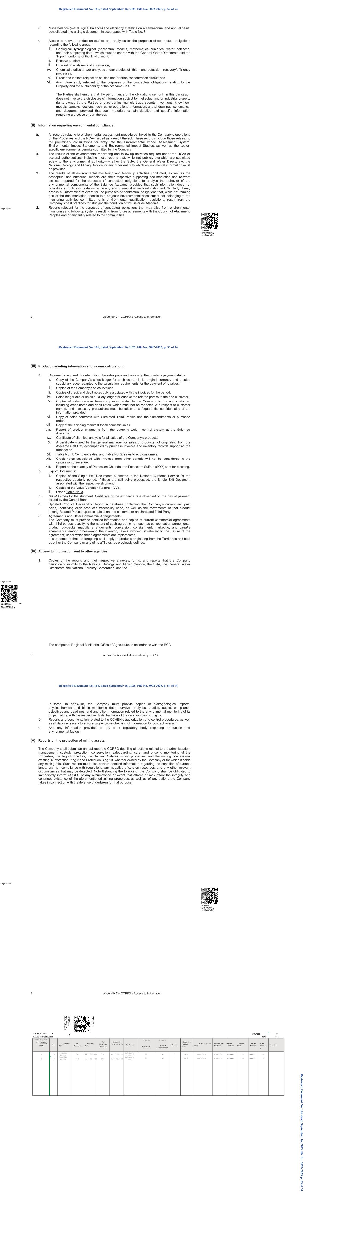 注册文件第166号,日期为2025年9月16日,档案编号5092-2025,第74页第52页。2附录7 – CORFO获取信息c.质量平衡(冶金平衡)和效率统计数据每半年和每年进行一次,根据表8合并为单一文件。d.为履行有关以下领域的合同义务而获取相关生产研究和分析:i.地质/水文地质(概念模型、数学-数值水平衡及其支持数据),必须与水务总局和环境监管局共享;ii。储备研究;三。勘探分析和信息;四。化学研究和/或锂和钾回收/效率过程的分析和/或研究;v.直接和间接回注研究和/或卤水浓度研究;和vi。任何与有关财产的合同义务的目的和阿塔卡马盐滩的可持续性相关的未来研究。缔约方应确保履行本款规定的义务不涉及披露受缔约方或第三方拥有的知识产权和/或工业产权约束的信息,即商业秘密、发明、专有技术、模型、样品、设计、技术或操作信息以及所有图纸、示意图和图表,前提是此类材料包含有关某一工艺或其部分的详细和具体信息。(ii)有关环境合规的信息:页码:163/185 a.与公司在物业上的运营相关的环境评估程序相关的所有记录以及因此而发布的RCA。这些记录包括与进入环境影响评估系统的初步磋商、环境影响陈述和环境影响研究有关的记录,以及公司提交的特定行业环境许可。b。RCA或部门授权要求的环境监测和后续活动的结果,包括那些虽然不公开,但仅提交给环境主管部门的报告——无论是SMA、水务总局、国家地质和矿务局,还是必须向其提供环境信息的任何其他实体。c。进行的所有环境监测和后续活动的结果,以及为分析阿塔卡马盐沼环境成分行为的合同义务目的而编制的概念和数值模型及其各自的证明文件和相关研究,前提是此类信息不构成任何环境或部门文书中确立的义务。同样,它可以为合同义务的目的访问所有相关信息,这些信息虽然不构成项目环境评估特定文件的一部分,也不属于环境资格决议中承诺的监测活动,但源于公司研究阿塔卡马盐沼状况的最佳做法。d.与未来与阿塔卡梅尼奥人民委员会和/或与社区相关的任何实体的协议所产生的环境监测和后续系统可能产生的合同义务目的相关的报告。证书123456865496验证有效性http://www.fojas。注册文件第166号,日期为2025年9月16日,档案编号5092-2025,第74页第53页。农业主管区域部长办公室,根据RCA3附件7 – CORFO获取信息(iii)产品营销信息和收入计算:页码:164/185证书编号123456865496在http://www.fojas.cl验证有效性a.确定销售价格和审查季度付款情况所需的文件:i.公司每个季度以其原始货币计算的销售分类账副本和适应支付特许权使用费计算要求的销售附属分类账。ii。公司销售发票复印件。三。与该期间发票适当关联的贷方和借方票据副本。四。各关联方对最终客户的销售分类账和/或销售辅助分类账。v与公司相关的公司对最终客户的销售发票副本,包括贷方票据和借方票据,不得针对客户名称进行编辑, 并采取必要的防范措施,对所提供的信息进行保密。六、与非关联第三方的销售合同及其修订或采购订单的副本。七。所有国内销售的运输舱单复印件。八、Salar de Atacama.ix出口重量控制系统的产品出货报告。公司产品全部销售化学分析证书。x。非源于阿塔卡马盐滩的产品销售,由总经理签署的凭证,并附有支持交易的采购发票和库存记录。xi。表1:公司销售额,表2:对终端客户销售额。xii。与其他期间的发票相关联的贷方票据将不在收入计算中考虑。十三。氯化钾和硫酸钾(SOP)送配数量报告。b.出口单证:i.向国家海关总署提交的各季度单次出境单证副本。如果这些仍在处理中,则与相应货物相关的单一出口文件。ii。价值变动报告(IVV)的副本。iii。出口表3号c.装运提单。央行签发的付款当天观察到的汇率证明。d.更新的产品溯源报告:包含公司当前和过去销售情况的数据库,识别每个产品的溯源码,以及该产品在关联方之间的移动,直至其销售给最终客户或不相关的第三方。e.协议和其他商业安排:公司必须提供与第三方的当前商业协议的详细信息和副本,具体说明此类协议的性质——例如补偿协议、产品回购、maquila安排、转换、寄售、营销,和承购协议等——以及所涉及的库存水平,如果与协议的性质相关,这些协议是根据这些协议执行的。据了解,上述规定应适用于原产于领土并由公司或其任何关联公司销售的产品,如先前定义。(iv)获取发送给其他机构的信息:a.公司定期向国家地质和矿务局、SMA、水务总局、国家林业公司提交的报告及其各自的附件、表格和报告的副本,以及日期为2025年9月16日的第166号注册文件,文件编号为5092-2025,第54页,共74页。4附录7 – CORFO获得有效信息。特别是,公司必须提供水文地质报告、物理化学和生物监测数据、调查、分析、研究、审计、合规目标和截止日期的副本,以及与其项目环境监测相关的任何其他信息,以及数据来源或来源的相应数字备份。b.与CCHEN授权和控制程序相关的报告和文件,以及确保对合同监督信息进行适当交叉检查所需的所有数据。c.以及向任何其他监管机构提供的有关生产和环境因素的任何信息。(v)关于保护采矿资产的报告:公司应向CORFO提交一份年度报告,详细说明与财产、Rigo财产、Sal和Salares采矿财产以及Protection Ring 2和Protection Ring 10中存在的采矿特许权有关的行政、管理、保管、保护、保护、保护、维护和持续监测的所有行动,无论