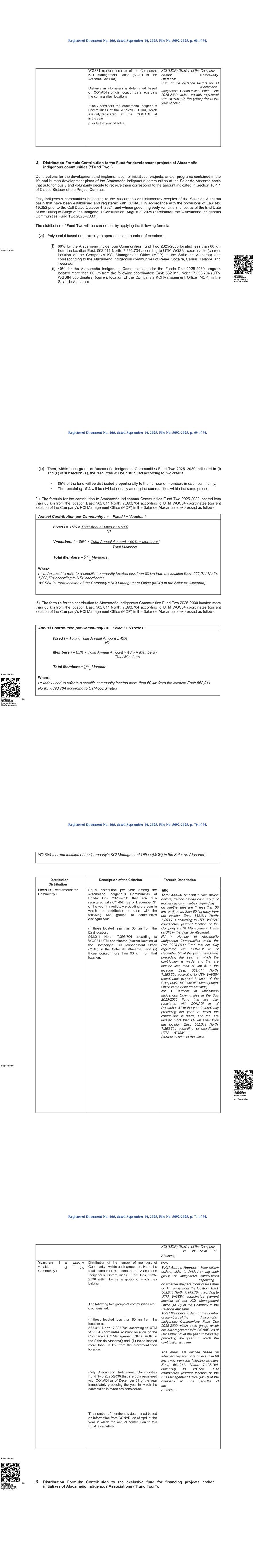 注册文件第166号,日期为2025年9月16日,档案编号5092-2025,第74页第68页。WGS84(目前公司KCL管理办公室(MOP)在阿塔卡马盐滩的位置)。以公里为单位的距离是根据CONADI关于社区位置的官方位置数据确定的。它只考虑2025-2030基金的Atacame ñ o土著社区,这些社区在销售前一年在CONADI正式注册。公司KCL(MOP)分部。Factor社区距离:所有Atacame ñ o土著社区Fund One 2025-2030的距离因素总和,在销售前一年在CONADI正式注册。2.对Atacame ñ o土著社区发展项目基金(“基金二”)的分配公式捐款。为自主自愿决定接收的Salar de Atacama盆地Atacame ñ o土著社区生活和人类发展计划所载倡议、项目和/或方案的制定和实施所作的贡献,对应于项目合同第16条第16.4.1节所示的数额。只有属于Salar de Atacama盆地Atacame ñ o或Lickanantay民族的土著社区,在召集日期(2024年10月4日)之前根据第19,253号法律的规定在CONADI建立和登记,并且其理事机构在土著协商对话阶段结束日期(2025年8月8日)仍然有效(以下简称“Atacame ñ o土著社区基金二2025 – 2030”)。基金二的分配将采用以下公式进行:(a)基于与业务的接近程度和成员人数的多项式:page:179/185(i)60%的Atacame ñ o土著社区基金二2025-2030位于距离地点不到60公里的东部:56 2.011北部:7.39 3.704根据UTM WGS84坐标(公司KCL管理办公室(MOP)在Salar de Atacama的当前位置)并对应于Peine、Socaire、Camar、Talabre和Toconao的Atacame ñ o土著社区。(ii)Fondo DOS 2025-2030计划下位于以下坐标60公里以上的Atacame ñ o土著社区的40%:东部:56 2.011,北部:7.39 3.704(UTM WGS84坐标)(公司KCL管理办公室(MOP)目前位于Salar de Atacama的位置)。证书123456865496验证有效性http://www.fojas。注册文件第166号,日期为2025年9月16日,档案编号5092-2025,第74页第69页。页码:180/185证书编号123456865496 http://www.fojas.cl(b)然后,在(a)小节(i)和(ii)中所示的Atacame ñ o土著社区基金二2025 – 2030的每一组内,将根据两个标准分配资源:-基金的85%将按每个社区的成员人数按比例分配。-剩余的15%将由同一群体内的社区平均分配。1)公式根据UTM WGS84坐标(公司KCL Management Office(MOP)在Salar de Atacama的当前位置)对位于距离位置不到60公里的Atacame ñ o土著社区基金二2025-2030的贡献表示:东:56 2.011北:7,393,704如下:每个社区的年度贡献i =固定i + VSocios i固定i = 15% ×年度总金额× 60% N1 VMembers i = 85% ×年度总金额× 60% × Members i总成员总数= ∑ N1 Members i i = 1其中:i =指数用于指距离该位置不到60公里的特定社区东:562,011北:7,393,704根据UTM坐标WGS84(公司KCL管理办公室(MOP)在Salar de Atacama的当前位置)。2)公式根据UTM WGS84坐标(公司KCL Management Office(MOP)在Salar de Atacama的当前位置)对位于60多公里的Atacame ñ o土著社区基金二2025-2030的贡献表示:东:56 2.011北:7.39 3.704如下:在每个社区年度贡献时检查有效性i =固定i + VSocios i固定i = 15% x年度总金额x40 % N2成员i = 85% ×年度总金额× 40% ×成员i总成员总数= ∑ N2成员i i = 1其中:i =用于指距离该地点60公里以上的特定社区的指数东:562,0 11北:7,393,704根据UTM坐标注册文件第166号,日期为2025年9月16日,文件编号5092-2025, 第70页,共74. http://www.fojas。Page:181/185 Certificate 123456865496 WGS84(current location of the Company’s KCL Management Office(MOP)in the Salar de Atacama)。验证有效性分配分配说明标准公式说明固定i =社区固定金额i。截至作出贡献的前一年的12月31日在CONADI正式注册的Fondo DOS 2025-2030的Atacame ñ o土著社区之间每年平均分配,与以下两组社区区分:(i)那些位于距离东部位置不到60公里的社区:56 2.011北:根据WGS84 UTM坐标(公司KCL管理办公室(MOP)在Salar de Atacama的当前位置)7,393,704;以及(ii)那些位于距离该位置超过60公里的社区。15%年度总金额= 900万美元,根据是否(i)小于60公里,或(ii)超过60公里的位置,根据UTM WGS84坐标(公司KCL管理办公室(MOP)在Salar de Atacama的当前位置),在每组土著社区之间分配:东部:562,0 11北部:7,393,704。N1 =根据UTM WGS84坐标(公司KCL(MOP)管理办公室目前位于Salar de Atacama),截至作出捐款的前一年12月31日在CONADI正式注册的、且距离东:56 2.011北:7,393,704地点不到60公里的DOS 2025-2030基金下的Atacame ñ o土著社区的数量。N2 = DOS 2025-2030基金中截至作出捐款的前一年12月31日在CONADI正式登记的Atacame ñ o土著社区的数量,且根据坐标UTM WGS84,位于距离东:56 2.011北:7.39 3.704公里以上的位置(该办公室登记的当前位置,日期为2025年9月16日的第166号文件,文件编号5092-2025,第74页第71页。KCL(MOP)分部的公司在Atacama的Salar)。Vpartners i变量Community i. = of amount每组内Community i成员数量的分布,相对于他们所属的同一组内Atacame ñ o土著社区基金DOS 2025-2030成员总数。区分以下两组社区:(i)位于距离位置不到60公里的区域:56 2.011 North:7.39 3.704根据UTM WGS84坐标(公司KCL管理办公室(MOP)在Salar de Atacama的当前位置);以及,(ii)位于距离上述位置60公里以上的区域。只有Atacame ñ o土着社区基金2 2025-2030年,截至作出捐款的前一年的12月31日在CONADI正式注册,才被考虑。成员人数根据CONADI截至计算本基金年度缴款当年4月的信息确定。85%年度总金额= 900万美元,根据距离所在地60公里以上或以下,由每组土著社区分成:东部:562,0 11北部:7,393,704根据UTM WGS84坐标(公司KCL管理办公室(MOP)目前位于Salar de Atacama的位置)。成员总数=每个群体内Atacame ñ o土著社区基金DOS 2025-2030成员人数的总和,这些成员截至捐款发生前一年的12月31日在CONADI正式登