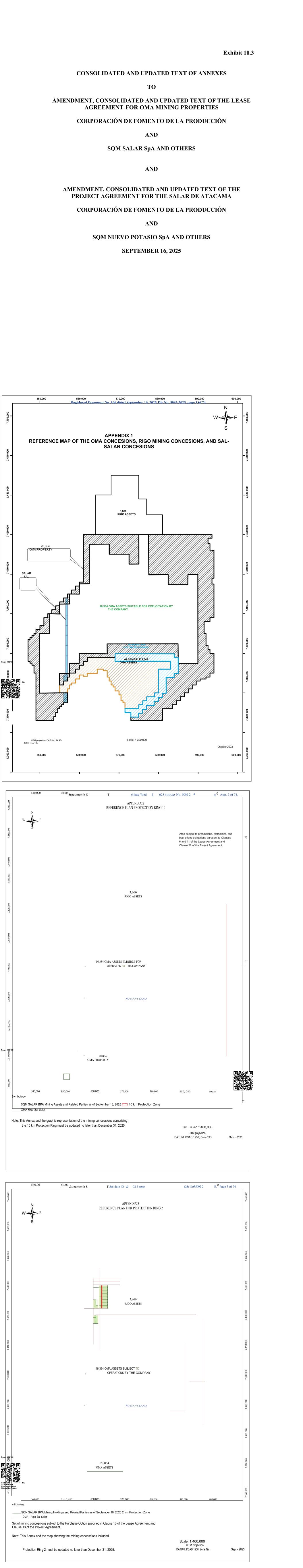 附件 10.3 OMA Mining Properties CORPORACi ó n de FOMENTO de LA Producci ó n和SQM SALAR Spa及其他的租赁协议OMAP0F的修订、合并和更新文本的合并和更新文本以及Salar de ATACAMA CORPORACi ó n de FOMENTO de LA Producci ó n和SQM NUEVO POTASIO Spa和ODM的项目协议的修订、合并和更新文本附录1 OMA特许、RIGO采矿特许、SAL-SALAR特许的参考地图3,660 RIGO资产28,054 OMA财产SALAR SAL 16,384 OMA资产适合公司开发无人土地1,370 OMA属地页码:112/185 ALBEMARLE 3,344 OMA资产证号123456865496查有效性http://www.fojas.cl UTM投影数据:PASD 1956,HSO19S规模:1,300,0002023年10月550000560,000570,000570,000580,000590,000590,000600,0000007,430,0007,440,0007,450,0007,360,0007,370,0007,380,0007,390,0007,400,0007,410,0007,420,0007,430,0007,440,0007,450,0007,370,000540,00055000 & ocumentb $ T6 date Wed-$ 025 issue No. 5092-2 $ 0 Aug. 2 of 74。附录2参考计划保护环10 N W E S区域须遵守租赁协议第6和11条以及项目协议第22条规定的禁止、限制和尽最大努力义务。3,660 RIGO资产16,384 OMA资产资格”“由公司经营—“无人土地页:113/185 '”28,054 OMA产权证书123456865496验证有效性,网址为http://www.fojas。Symbology 540,000 SSO,000560,000570,000570,000580,000590,000600,000 SQM SALAR双酚A采矿资产和截至2025年9月16日的关联方f“”“”l 10公里保护区OMA-Rigo-Sal-Salar注:本附件以及包含10公里保护环的采矿特许权的图形表示必须在2025年12月31日之前更新。SC规模:1:400,000 UTM投影数据:PSAD 1956,Zone 19S Sep.-2025 360,0007,380,0007,400,0007,450,0007,460,0007,390,0007,410,0007,420,0007,430,0007,440,00060,000540.00 55000 & ocumenth $ T & 6 date l ó-& 025 repe Q & No. 5092-2 É,0 page 3 of 74。附录3保护环参考计划2 e 3,660 RIGO资产16,384 OMA资产受制于,由公司运营"无人土地页:114/18528,054 OMA资产证号123456865496查有效性http://www.fojas.cl u i i iuology540,000/or 0.000560,000560,000570,000580,000580,00059,000600,000 SQN SALAR BPA矿业控股及关联方截至2025年9月16日2公里保护区OMA — Rigo-Sal-Salar一套采矿特许权受制于租赁协议第10条和项目协议第13条规定的购买选择权。注:本附件和显示采矿特许权的地图包含比例尺:1:400,000 UTM投影保护环2必须不迟于2025年12月31日更新。DATPU:PSAD 1956,Zone 19s Sep.-2025 000‘0 Bt’丨7,430,0007,390,0007,400,0007,410,0007,420,0007,440,0007,440,0007,450,0007,460,0007,390,0007,400,0007,410,0007,420,0007,430,0007,360,0007,370,0007,380,0007,440,0007,45 0, 00 0 7, 46 0, 00 0