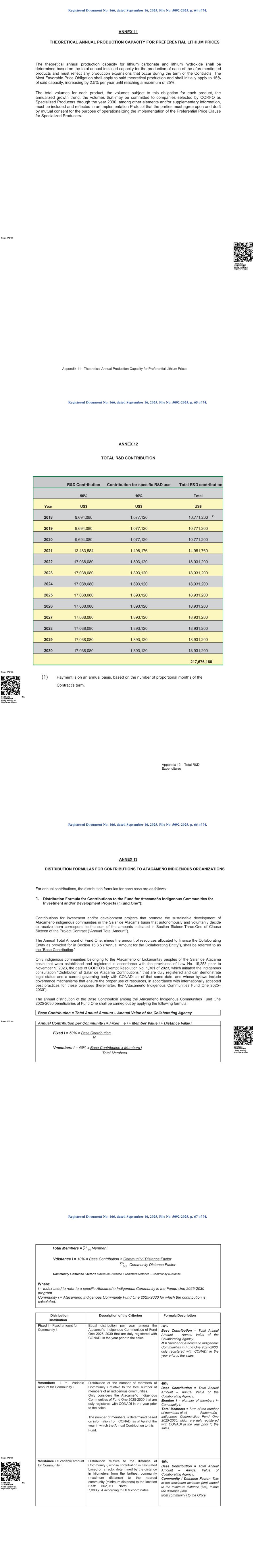 注册文件第166号,日期为2025年9月16日,档案编号5092-2025,第74页第64页。附录11-优惠锂价的理论年产能附件11优惠锂价的理论年产能碳酸锂和氢氧化锂的理论年产能应根据上述每种产品生产的年总装机容量确定,并必须反映合同期限内发生的任何生产扩张。最优惠价格义务适用于所述理论生产,最初适用于所述产能的15%,每年增加2.5%,直至达到最高25%。每种产品的总量、每种产品受此义务约束的数量、年化增长趋势、到2030年可能承诺给CORFO选定为专门生产者的公司的数量,以及其他要素和/或补充信息,必须包括并反映在一份实施议定书中,各方必须商定并通过相互同意起草该议定书,以便实施专门生产者优惠价格条款。page:175/185证书123456865496验证有效性http://www.fojas。注册文件第166号,日期为2025年9月16日,档案编号5092-2025,第74页第65页。附录12 –研发支出总额附件12研发贡献总额特定研发用途的研发贡献总额90% 10%年度总额US $ 20189,694,0801,077,120110,771,200(1)20199,694,0801,077,120110,771,20020209,694,0801,077,120110,771,200202113,483,5841,498,17614,981,760202217,038,0801,893,12018,931,200202317,038,0801,893,120118,931,200202417,038,0801,893,120118,931,200202617,038,0801,893,120118,931,200202以合同期限的比例月数为准。注册文件第166号,日期为2025年9月16日,档案编号5092-2025,第74页第66页。基数贡献=年度总金额–合作机构年度价值每个社区年度贡献i =固定e i +会员值i +距离值i附件13向ATACAM ñ o土著组织捐款的年度贡献的分配公式,每个案例的分配公式如下:1。用于投资和/或发展项目的Atacame ñ o土著社区基金捐款分配公式(“基金一”):用于促进Salar de Atacama流域Atacame ñ o土著社区可持续发展的投资和/或发展项目的捐款,如果自主自愿决定接收,则对应于项目合同第16条第3款(“年度总金额”)中所示金额的总和。基金一的年度总额减去第16.3.5节规定的分配给合作实体的资金数额(“合作实体的年度数额”),应称为“基础缴款”。只有属于Salar de Atacama盆地Atacame ñ o或Lickanantay民族的土著社区,这些社区是在2023年11月9日(CORFO 2023年第1361号豁免决议日期)之前根据第19,253号法律的规定建立和登记的,该决议启动了土著协商“Salar de Atacama捐款的分配”,根据国际公认的用于这些目的的最佳做法(以下简称“Atacame ñ o土着社区基金One 2025 – 2030”),经正式注册并能够证明其法律地位和截至同日在CONADI的现有理事机构,其章程包括确保适当使用资源的治理机制。page:177/185基金一的Atacame ñ o土着社区基金一2025-2030受益人之间每年的基金缴款分配采用以下公式进行:固定i = 50% ×基金缴款N VMembers i = 40% x基金缴款x Members i总会员证书123456865496检查有效性http://www.fojas。2025年9月16日第166号注册文件,第5092-2025号文件, 第74页,第67页。page:178/185证书编号123456865496 http://www.fojas.cl total members = ∑ n member ii = 1 vdistance i = 10% × base contribution × community i distance factor ∑ = 1 community distance factor community i distance factor = maximum distance + minimum distance – community i distance where:i = index used to refer to a specific atacame ñ o indigenous community in the Fondo Uno 2025-2030 program。Community i = Atacame ñ o土着社区基金一2025-2030年,其贡献计算。在分配分配时验证有效性标准公式说明固定i =社区i的固定金额。在销售前一年在CONADI正式注册的Fund One 2025 – 2030的Atacame ñ o土著社区之间每年平均分配。50%基数贡献=年度总金额–协作机构年度价值。N = Fund One 2025-2030中Atacame ñ o土著社区的数量,在出售前一年在CONADI正式注册。VMembers i =社区i的可变金额。社区i的成员数量相对于所有土著社区成员总数的分布。仅考虑在销售前一年在CONADI正式注册的Fund One 2025-2030的Atacame ñ o土著社区。成员人数是根据CONADI截至该基金年度捐款当年4月的信息确定的。40%基数贡献=年度总金额–协作机构年度价值。成员i =社区成员数i.成员总数=所有Atacame ñ o土著社区基金一2025-2030年成员数的总和,该基金在出售前一年在CONADI正式注册。Vdistance i = variable amount for community i. distribution relatively to the distance of community i,which contribution is calculated based on a factor determined by the distance in km from the farest community(maximum distance)to the nearest community(maximum distance)to the location east:562,0 11 North:7,393,704 accord社区i距离系数:这是最大距离(km)加上最小距离(km),减去社区i到办公室的距离(km)