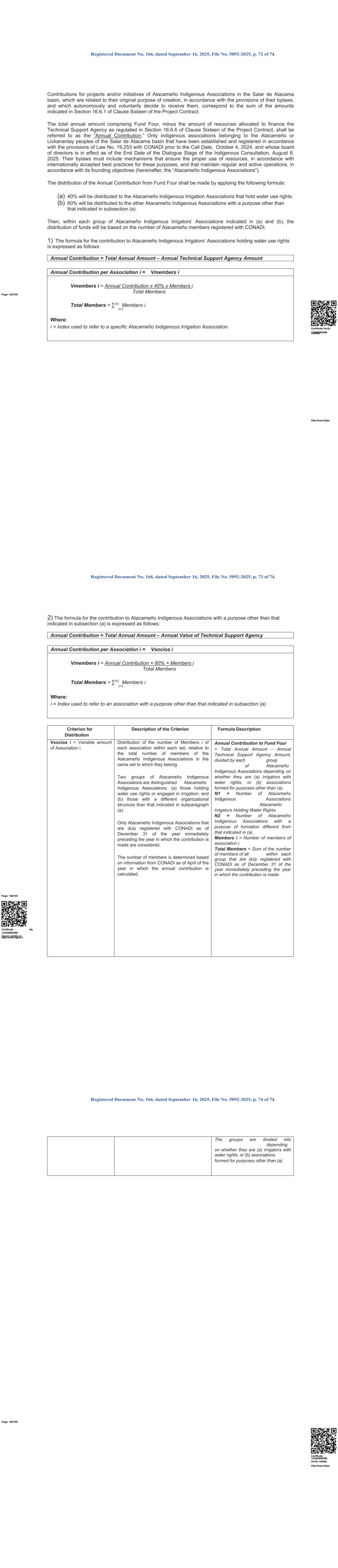 注册文件第166号,日期为2025年9月16日,档案编号5092-2025,第74页第72页。http://www.fojas。123456865496年度捐款=年度总额–年度技术支持机构对Salar de Atacama盆地Atacame ñ o土著协会的项目和/或倡议的捐款,这些项目和/或倡议与其最初的创建目的有关,根据其章程的规定,并自主和自愿决定接收,对应于项目合同第16条第16.6.1节所示金额的总和。由基金四组成的年度总金额,减去项目合同第16条第16.6.6节规定的分配给技术支持机构的资源金额,应称为“年度捐款”。只有属于Salar de Atacama盆地Atacame ñ o或Lickanantay民族的土著协会,在召集日期(2024年10月4日)之前根据第19,253号法律的规定与CONADI建立和登记,其董事会自土著协商对话阶段结束日期(2025年8月8日)起生效。它们的章程必须包括根据国际公认的这些目的的最佳做法确保适当使用资源的机制,并根据其创始目标保持定期和积极的运作(以下简称“Atacame ñ o土着协会”)。基金四的年度捐款的分配应采用以下公式:(a)40%将分配给持有用水使用权的Atacame ñ o土著灌溉协会。(b)60%将分配给其他Atacame ñ o土着协会,其目的不在(a)款所示。然后,在(a)和(b)中指出的每组Atacame ñ o土着灌溉者协会内,资金的分配将基于在CONADI注册的Atacame ñ o成员的数量。1)对持有用水权的Atacame ñ o土着灌溉者协会的贡献公式表述如下:page:183/185证书验证有效性每个协会的年度贡献i = VMembers i VMembers i =年度贡献x 40% x Members i Total Members Total Members = ∑ N1 Members i i = 1其中:i =用于指特定Atacame ñ o土着灌溉协会的指数。注册文件第166号,日期为2025年9月16日,档案编号5092-2025,第74页第73页。年度贡献=年度总金额–技术支持机构年度价值2)对具有(a)小节所示目的以外的Atacame ñ o土著协会的贡献公式表述如下:每个协会的年度贡献i = VSocios i VMembers i =年度贡献× 60% ×会员i会员总数会员总数= ∑ N2会员i i = 1其中:i =用于指具有(a)小节所述目的以外的协会的指数。页码:184/185123456865496 http://www.fojas.cl证号在分配标准下检查有效性标准公式描述VSocios i =可变数量的协会i。每个协会的成员数量i在每个集合内的分布,相对于他们所属的同一集合中的Atacame ñ o土著协会的成员总数。有两组Atacame ñ o土着人协会被区分为Atacame ñ o土着人协会:(a)持有用水权或从事灌溉的人,以及(b)组织结构与(a)项所示不同的人。仅考虑截至作出捐款的前一年12月31日在CONADI正式注册的Atacame ñ o土着协会。成员人数是根据CONADI截至计算年度贡献当年4月的信息确定的。对基金四的年度捐款=年度总金额–年度技术支持机构金额,除以每组Atacame ñ o土著协会,取决于他们是(a)拥有水权的灌溉者,还是(b)为(a)以外的目的而成立的协会。N1 =持有水权的Atacame ñ o土著协会Atacame ñ o灌溉者的数量。N2 = Atacame ñ o土著协会的数量,其成立目的与(a)中所示的不同。会员i =协会会员数i.会员总数=截至作出贡献的前一年的12月31日在CONADI正式注册的每个集团内的所有会员人数之和。2025年9月16日第166号注册文件,第5092-2025号档案, 第74页,共74. http://www.fojas。根据他们是(a)拥有水权的灌溉者,还是(b)为(a)以外的目的而成立的协会,将这些团体分为几类。page:185/185证书123456865496验证有效性
