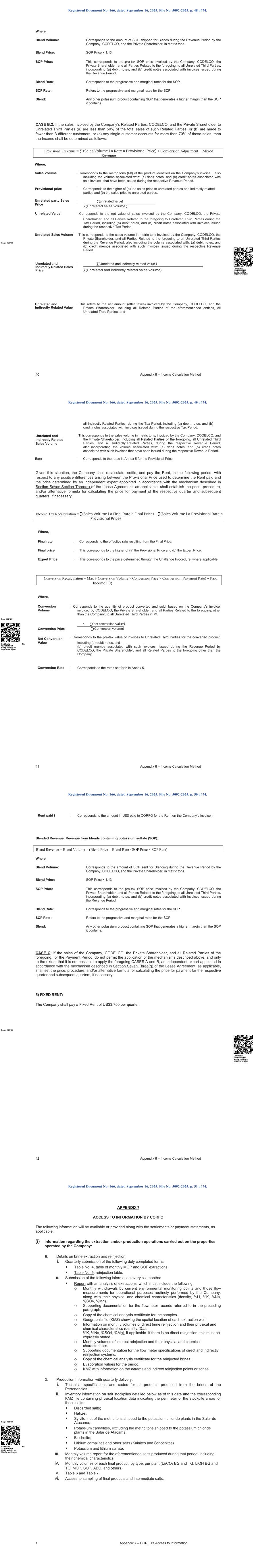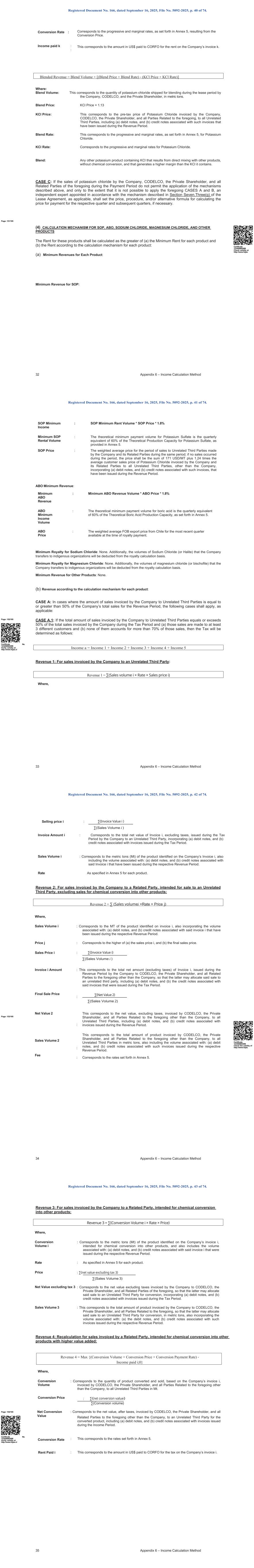 注册文件第166号,日期为2025年9月16日,档案编号5092-2025,第74页第48页。40附录6 –收入计算方法暂定收入= ∑(销量i ×率×暂定价格)+转换调整+混合收入其中,混合量:对应于公司、CODELCO和私人股东在收入期间为混合料发运的SOP数量,单位为公吨。Blend价格:SOP价格× 1.13 SOP价格:这对应于公司、CODELCO、私人股东以及与上述相关的所有各方向所有无关联第三方开具的税前SOP价格,其中包含(a)借方票据,以及(b)与在收入期间开具的发票相关的贷方票据。混合率:对应于SOP的累进率和边际率。SOP费率:指SOP的累进费率和边际费率。Blend:任何其他含有SOP的钾产品,其产生的利润高于其所含SOP。案例B.2:如果公司关联方CODELCO和私人股东向非关联第三方开具的销售发票(a)低于该关联方销售总额的50%,或(b)向少于3个不同的客户进行,或(c)任何单一客户占该等销售的70%以上,则应按以下方式确定收入:其中,:对应于公司发票i上标识的产品的公吨(MT),还包括与以下相关的数量:(a)借方票据,及(b)与上述发票i有关并已于有关收入期间发出的信贷票据。:对应于(a)向非关联方和间接关联方的销售价格与(b)向非关联方的销售价格两者中的较高者。page:159/185:∑(非关联值)∑(非关联销售量):对应于公司、CODELCO、私人股东以及与上述相关的所有各方在纳税期间向非关联第三方开具的销售发票净值,包括(a)借方票据,以及(b)与在相应纳税期间开具的发票相关的贷方票据。:这对应于公司、CODELCO、私人股东以及与上述相关的所有各方在收入期间向所有非关联第三方开具的以公吨为单位的销售数量,还包括与以下相关的数量:(a)借方票据,以及(b)与在相应收入期间开具的此类发票相关的贷方备忘。:∑(非关联及间接关联值)∑(非关联及间接关联量)证书123456865496验证有效性http://www.fojas。:指公司、CODELCO、私人股东包括上述实体的所有关联方、所有非关联第三方、销售数量i暂定价格非关联方销售价格非关联价值非关联销售数量非关联和间接关联销售价格非关联和间接关联价值登记的净额(税后),日期为2025年9月16日,文件编号5092-2025,第74页,第49页。41附录6 –收入计算方法所得税重新计算= ∑(销售量i ×最终税率×最终价格)− ∑(销售量i ×暂定税率×暂定价格)转换重新计算= Max {(转换量×转换价格×转换支付率)-已付收入i;0 }所有间接关联方,在纳税期间,包括(a)借方票据,以及(b)与在相应纳税期间开具的发票相关的贷方票据。:这对应于公司、CODELCO和私人股东(包括上述所有关联方、所有非关联第三方和所有间接关联方)在各自收入期间开具的以公吨为单位的销售量,还包括与以下相关的数量:(a)借方票据,以及(b)在各自收入期间已开具的与此类发票相关的贷方票据。非关联及间接关联销售容量率:对应暂定价格附件5中的费率。鉴于这种情况,公司应在以下期间就用于确定已付租金的暂定价格与根据第七节所述机制任命的独立专家确定的价格之间产生的任何正差异重新计算、结算和支付租金。租赁协议第三(g)节(如适用)应确定计算相应季度和后续季度的支付价格的价格、程序和/或替代公式(如有必要)。其中,最终利率:对应最终价格产生的有效利率。最终价格:这对应于(a)暂定价格和(b)专家价格中的较高者。专家价格:这对应通过质疑程序确定的价格, 在适用的情况下。其中,PAG:160/185证书编号123456865496在http://www.fojas.cl验证有效性换算量换算价净换算值换算率:对应于转换销售的产品数量,基于公司的发票,由CODELCO、私人股东以及除公司之外的所有与前述相关的各方向MT.的所有非关联第三方开具发票:∑(净换算值)∑(换算量):对应于转换后的产品向非关联第三方开具的发票的税前价值,包括(a)借方票据,以及(b)与此类发票相关的贷记备忘,营收期由民营股东CODELCO及除公司以外的前述所有关联方发行。:对应附件5规定的费率。注册文件第166号,日期为2025年9月16日,档案编号5092-2025,第74页第50页。42附录6 –收入计算方法Blend revenue = blend volume ×(blend price × blend rate-SOP price × SOP rate)Rent paid i:对应于公司发票上的租金支付给CORFO的美元金额i. Blended revenue:revenue from blends from containing potassium sulfate(SOP)(SOP):where,blend volume:对应于公司、CODELCO和私人股东在收入期间发送给blending的SOP数量,单位为公吨。混合价格:SOP价格× 1.13 SOP价格:这对应于公司、CODELCO、私人股东以及与上述相关的所有各方向所有非关联第三方开具的税前SOP价格,其中包含(a)借方票据,以及(b)与在收入期间开具的发票相关的贷方票据。混合率:对应SOP的累进率和边际率。SOP费率:指SOP的累进费率和边际费率。Blend:任何其他含有SOP的钾产品,其产生的毛利高于其所含SOP。案例C:如果公司、CODELCO、私人股东以及上述所有关联方的销售在付款期内不允许应用上述机制,并且仅在无法应用上述A和B案例的情况下,根据第七节所述机制任命的独立专家(如适用)。如有必要,租赁协议的第三(g)条应设定相应季度和随后季度的支付价格的价格、程序和/或计算价格的替代公式。5)固定租金:公司每季度应支付固定租金3750美元。page:161/185证书123456865496验证有效性http://www.fojas。注册文件第166号,日期为2025年9月16日,档案编号5092-2025,第74页第51页。1附录7 – CORFO获取信息附录7 CORFO获取信息将随结算或付款报表(如适用)一起提供或提供以下信息:页码:162/185证书编号123456865496在h