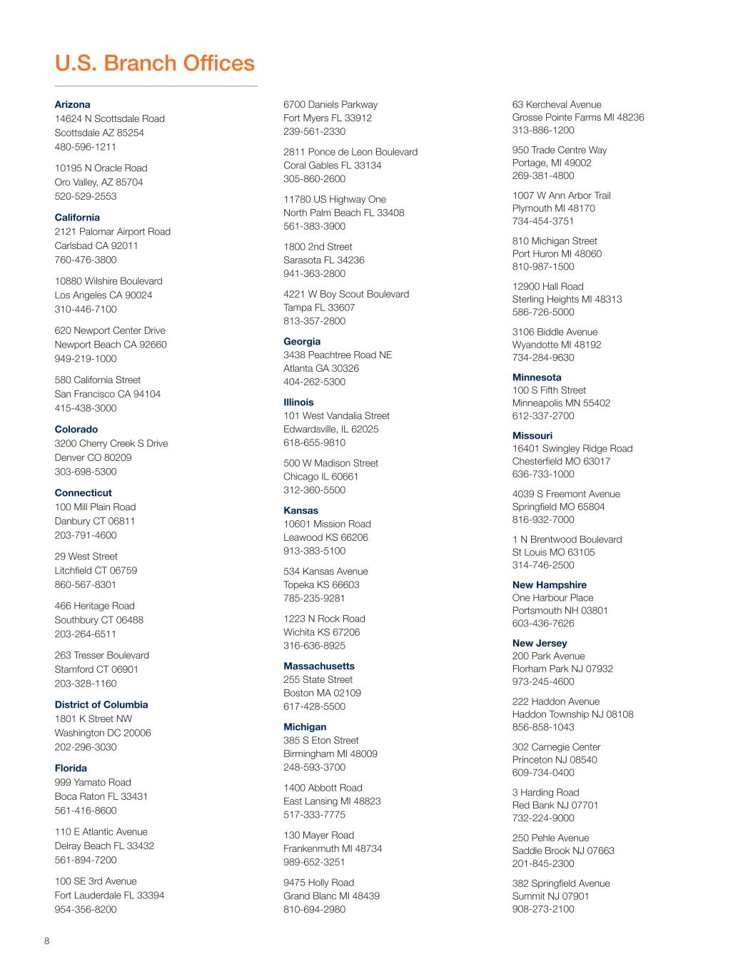 亚利桑那州14624 N Scottsdale Road Scottsdale AZ 85254 480-576-1211 10195 N Oracle Road Oro Valley,AZ 85704 520-529-2553加利福尼亚州2121 Palomar机场路Carlsbad 加利福尼亚州 92011 760-476-3800 10880 Wilshire Boulevard Los Angeles 丨加利福尼亚州 90024 310-446-7100 620 Newport Center Drive Newport Beach 丨加利福尼亚州 92660 949-219-1000 580 California Street San Francisco 丨加利福尼亚州 94104 415-438-3000 Colorado 3200 Cherry Creek S Drive Denver CO 80209 303-698-5300 Connecticut 100 Mill Plain Road Danbury CT 06811 203-791-4600 29 West Street Litchfield CT 06759 860-567-8301 466 Heritage Road Southbury CT 06488 203-264-6511 263 Tresser Boulevard Stamford CT 06901 203Avenue Delray Beach FL 33432 561-894-7200 100 SE 3rd Avenue Fort Lauderdale FL 33394 954-356-8200 6700 Daniels Parkway Fort Myers FL 33912 239-561-2330 2811 Ponce de Leon Boulevard Coral Gables FL 33134 305-860-2600 11780 US Highway One North Palm Beach FL 33408 561-383-3900 1800 2nd Street Sarasota FL 34236 941-363-2800 4221 W Boy Scout Boulevard Tampa FL 33607 813-357-2800 Georgia 3438 Peachtree Road NE Atlanta GA 30326 404-262-5300 Illinois 101 West Vandalia Street Edwardsville,IL 62025 618-655-9810 500 W Madison Street Chicago IL 60661 312-360-5500 Kansas 10601 Mission Road Leawood KS 66206 913-383-5100 534 Kansas Avenue Topeka KS 66603 785-235-9281 1223 N Rock Road Wichita KS 67206 316-636-8925 Massachusetts 255 道富 Boston MA 02109 617-428-5500 Michigan 385 S Eton Street Birmingham MI 48009 248-593-3700 1400 Abbott Road East Lansing MI 48823 517-333-7775 130 Mayer Road Frankenmuth MI 48734 989-652-3251 9475 Holly Road Grand Blanc MI 48439 810-694-2980 63 Kercheval Avenue Grosse PoMI 49002 269-381-4800 1007 W Ann Arbor Trail Plymouth MI 48170 734-454-3751 810 Michigan Street Port Huron MI 48060 810-987-1500 12900 Hall Road Sterling Heights MI 48313 586-726-5000 3106 Biddle Avenue Wyandotte MI 48192 734-284-9630 Minnesota 100 S Fifth Street Minneapolis MN 55402 612-337-2700 Missouri 16401 Swingley Ridge Road Chesterfield MO 63017 636-733-1000 4039 S Freemont Avenue Springfield MO 65804 816-932-7000 1 N Brentwood Boulevard St Louis MO 63105 314-746-2500 New Hampshire One Harbour Place Portsm普林斯顿NJ 08540 609-734-0400 3 Harding Road Red Bank NJ 07701 732-224-9000 250 Pehle Avenue Saddle Brook NJ 07663 201-845-2300 382 Springfield Avenue Summit NJ 07901 908-273-2100美国分公司8