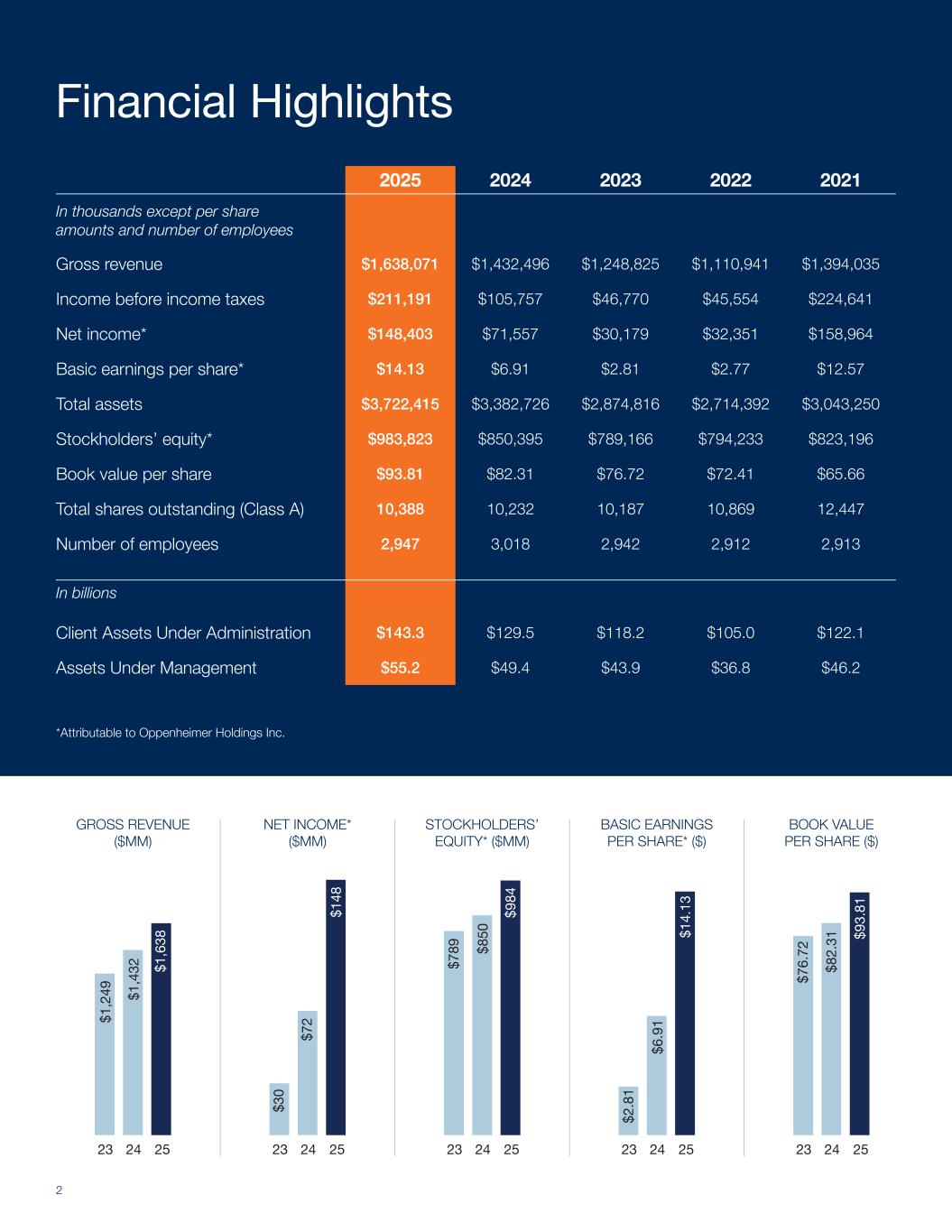 252423 $8 2.31 $9 3.81 $7 6.7220252024202320222021以千为单位,每股金额除外和员工人数总收入1,638,071美元1,432,496美元1,248,825美元1,110,941美元1,394,035美元收入所得税前$ 211,191 $ 105,757 $ 46,770 $ 45,554 $ 224,641净收入*148,403美元71,557美元30,179美元32,351美元158,964美元每股基本收益*$ 14.13 $ 6.91 $ 2.81 $ 2.77 $ 12.57总资产$ 3,722,415 $ 3,382,726 $ 2,874,816 $ 2,714,392 $ 3,043,250股东权益*$ 983823 $ 850,395 $ 789,166 $ 794,233 $ 823,196每股帐面价值$ 93.81 $ 82.31 $ 76.72 $ 72.41 $ 65.66已发行股份总数(A类)10,38810,23210,18710,86912,447员工人数2,9473,0182,9422,9122,913十亿管理下的客户资产$ 143.3 $ 129.5 $ 118.2 $ 105.0 $ 122.1管理下的资产$ 55.2 $ 49.4 $ 43.9 $ 36.8 $ 46.2财务摘要总收入($ mm)净收入*($ mm)基本每股收益*($)股东权益*($ mm)*归属于Oppenheimer Holdings Inc.的每股账面价值(美元)252423美元72美元30美元148252423美元850美元984美元789美元252423美元6.91美元14。13 $2 .8 1 252423 $1 ,6 38 $1 ,4 32 $1 ,2 49 2