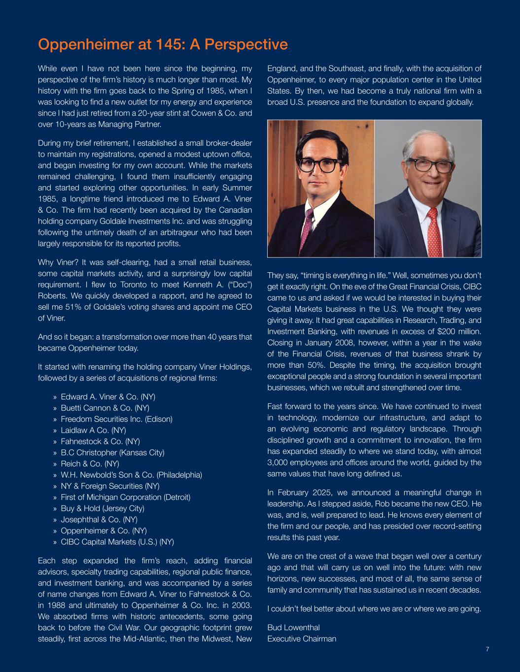 虽然从一开始我就没有来过这里,但我对这家公司历史的看法比大多数人都要长得多。我在这家公司的历史可以追溯到1985年春天,那时我刚刚从高宏集团公司工作了20年并担任了10多年管理合伙人的工作中退休,当时我正寻求为我的精力和经验寻找一个新的出口。在我短暂退休期间,我成立了一家小型经纪自营商来维持我的注册,开设了一家不起眼的住宅区办事处,并开始为自己的账户进行投资。虽然市场仍然充满挑战,但我发现它们的吸引力不足,并开始探索其他机会。1985年初夏,一位老朋友向我介绍了Edward A. Viner & Co。该公司最近被加拿大控股公司Goldale Investments Inc.收购,并在一位对其报告的利润负有主要责任的套利者英年早逝后陷入困境。为什么是Viner?它是自我清算的,零售业务很小,有一些资本市场活动,资本要求低得惊人。我飞到多伦多去见Kenneth A.(“医生”)罗伯茨。我们很快建立了融洽的关系,他同意向我出售Goldale 51%的有投票权的股份,并任命我为Viner的首席执行官。就这样开始了:40多年的转变,今天变成了奥本海默。它始于将控股公司Viner Holdings更名,随后是对区域公司的一系列收购:» Edward A. Viner & Co.(NY)» Buetti Cannon & Co.(NY)» Freedom Securities Inc.(Edison)» Laidlaw A Co.(NY)» Fahnestock & Co.(NY)» B.C Christopher(Kansas City)» Reich & Co.(NY)» W.H. Newbold’s Son & Co.(Philadelphia)» NY & Foreign Securities(NY)» First of Michigan Corporation(Detroit)» Buy & Hold(Jersey City)» Josephthal & Co.(NY)» Oppenheimer & Co.(NY)» CIBC Capital Markets(U.S.)(NY)每一步都扩大专业交易能力、区域公共财政和投资银行业务,并伴随着从Edward A. Viner于1988年更名为Fahnestock & Co.,并最终于2003年更名为Oppenheimer & Co. Inc.的一系列更名。我们吸收了有历史先例的公司,有些可以追溯到内战前。我们的地理足迹稳步增长,先是横跨中大西洋,然后是中西部、新英格兰和东南部,最后,随着奥本海默的收购,到达了美国的每一个主要人口中心。到那时,我们已经成为一家真正的全国性公司,在美国拥有广泛的存在,并拥有在全球扩张的基础。他们说,“时间就是生活的一切。”嗯,有时候你做的不完全对。在大金融危机前夕,加拿大帝国商业银行来找我们,询问我们是否有兴趣购买他们在美国的资本市场业务。我们以为他们在送人。它在研究、交易和投资银行方面拥有强大的能力,收入超过2亿美元。然而,在金融危机后的一年内,该业务的收入在2008年1月关闭,缩水了50%以上。尽管时机成熟,但这次收购带来了杰出的人才和几个重要业务的强大基础,我们随着时间的推移重建和加强了这些业务。快进到此后的岁月。我们继续投资于技术,使我们的基础设施现代化,并适应不断变化的经济和监管环境。通过有纪律的增长和对创新的承诺,该公司稳步扩张到我们今天所处的位置,在世界各地拥有近3,000名员工和办事处,遵循长期以来定义我们的相同价值观。2025年2月,我们宣布了一次有意义的领导层变动。当我退位时,罗布成为了新的首席执行官。他过去、现在都做好了领导的充分准备。他了解公司和我们员工的每一个元素,并在过去一年主持了创纪录的结果。我们正处于一个多世纪前开始的浪潮的顶峰,这一浪潮将把我们带到未来:带着新的视野、新的成功,最重要的是,近几十年来支撑我们的同样的家庭和社区意识。我对我们所处的位置或我们将要去的地方感到非常满意。Bud Lowenthal执行主席奥本海默在145:一个视角7