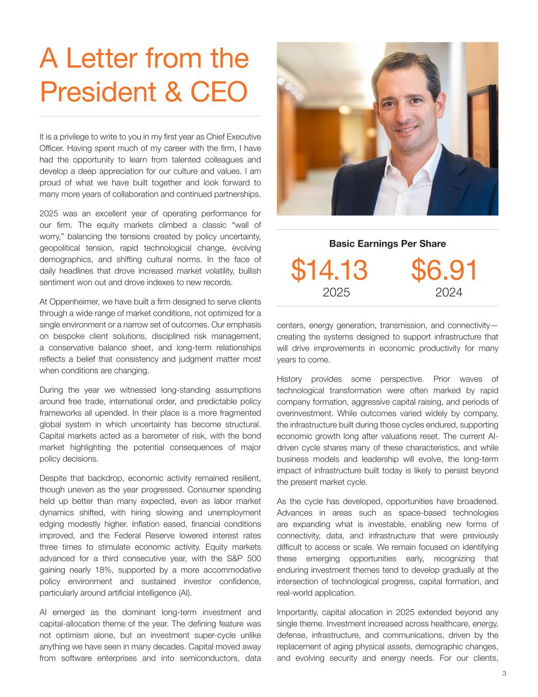 总裁兼首席执行官的一封信每股基本收益14.13美元20256.9 12024美元3很荣幸在我担任首席执行官的第一年给你写信。在公司度过了我职业生涯的大部分时间后,我有机会向有才华的同事学习,并对我们的文化和价值观产生了深刻的欣赏。我为我们共同建立的东西感到自豪,并期待着更多年的合作和持续的伙伴关系。2025年是我所经营业绩表现优异的一年。股市爬上了一堵经典的“担忧之墙”,平衡了政策不确定性、地缘政治紧张局势、快速的技术变革、不断演变的人口结构以及不断变化的文化规范所造成的紧张局势。面对推动市场波动加剧的每日头条新闻,看涨情绪胜出,并推动指数创下新纪录。在奥本海默,我们建立了一家公司,旨在通过广泛的市场条件为客户提供服务,而不是针对单一环境或一系列狭窄的结果进行优化。我们对定制客户解决方案、严格的风险管理、保守的资产负债表和长期关系的重视,反映了一种信念,即当条件发生变化时,一致性和判断力最为重要。在这一年里,我们目睹了围绕自由贸易、国际秩序和可预测的政策框架的长期假设都被颠覆了。取而代之的是一个更加分散的全球体系,在这个体系中,不确定性变成了结构性的。资本市场充当了风险的晴雨表,债券市场凸显了重大政策决定的潜在后果。尽管存在这种背景,但经济活动仍保持韧性,尽管随着时间的推移不均衡。消费者支出的表现好于许多人的预期,尽管劳动力市场动态发生了变化,招聘放缓,失业率小幅走高。通胀缓解,金融状况改善,美联储三次降低利率以刺激经济活动。股市连续第三年上涨,标普 500指数上涨近18%,这得益于更加宽松的政策环境和持续的投资者信心,尤其是围绕人工智能(AI)的信心。人工智能成为年度主导的长期投资和资本配置主题。其决定性特征不仅仅是乐观,而是一个投资超级周期,这与我们几十年来所看到的任何情况都不一样。资本从软件企业转移到半导体、数据中心、能源生产、传输和连接——创造了旨在支持基础设施的系统,这些系统将在未来很多年推动经济生产力的提高。历史提供了一些视角。此前的技术变革浪潮往往以快速组建公司、激进的资本筹集和过度投资时期为特征。虽然各公司的结果差异很大,但在这些周期中建设的基础设施经久不衰,在估值重置很久之后就支持了经济增长。当前人工智能驱动的周期具有许多这些特征,虽然商业模式和领导力将不断演变,但今天所构建的基础设施的长期影响很可能会持续到当前的市场周期之后。随着周期的发展,机会变得更加广阔。天基技术等领域的进展正在扩大可投资的领域,从而实现以前难以获得或扩大规模的新形式的连通性、数据和基础设施。我们仍然专注于及早发现这些新兴机会,认识到经久不衰的投资主题往往会在技术进步、资本形成和实际应用的交叉点上逐渐发展。重要的是,2025年的资本配置超出了任何单一主题。医疗保健、能源、国防、基础设施和通信领域的投资增加,这是由老化的有形资产更替、人口结构变化以及不断变化的安全和能源需求推动的。对于我们的客户来说,