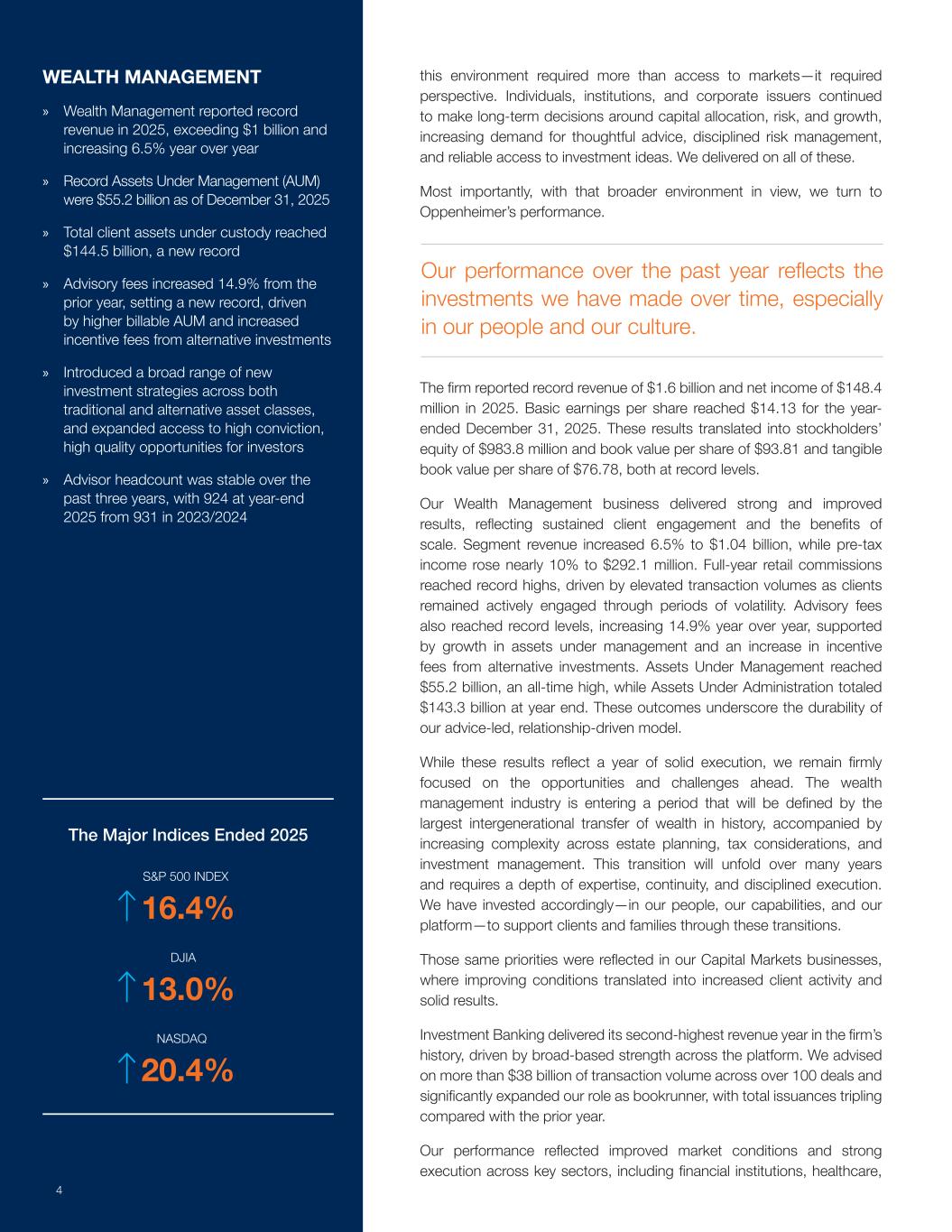 这种环境需要的不仅仅是市场准入——它还需要有远见。个人、机构和企业发行人继续围绕资金配置、风险和增长做出长期决策,对周到建议、纪律严明的风险管理、可靠获取投资理念的需求不断增加。我们兑现了所有这些。最重要的是,考虑到更广泛的环境,我们转向奥本海默的表现。该公司报告称,2025年的收入达到创纪录的16亿美元,净收入为1.484亿美元。截至2025年12月31日止年度,每股基本盈利达14.13美元。这些结果转化为9.838亿美元的股东权益,每股账面价值为93.81美元,每股有形账面价值为76.78美元,均处于创纪录水平。我们的财富管理业务取得了强劲和改善的业绩,反映了持续的客户参与和规模效益。分部收入增长6.5%至10.4亿美元,税前收入增长近10%至2.921亿美元。全年零售佣金达到历史新高,这是由于客户在波动期间保持积极参与,交易量增加所推动的。咨询费也达到创纪录水平,同比增长14.9%,这得益于管理资产的增长和另类投资激励费用的增加。管理下的资产达到552亿美元,创下历史新高,而截至年底,管理下的资产总额为1433亿美元。这些结果凸显了我们以建议为主导、以关系为驱动的模式的持久性。虽然这些成果反映了一年的扎实执行,但我们仍然坚定地专注于未来的机遇和挑战。财富管理行业正在进入一个时期,其定义将是历史上最大规模的财富代际转移,同时伴随着跨越遗产规划、税收考虑和投资管理的日益复杂。这一转变将持续多年,需要有深度的专业知识、连续性和纪律严明的执行力。我们进行了相应的投资——投资于我们的员工、我们的能力和我们的平台——以支持客户和家庭度过这些过渡。这些相同的优先事项反映在我们的资本市场业务中,在这些业务中,条件的改善转化为客户活动的增加和稳健的结果。在整个平台基础广泛的实力的推动下,投资银行业务实现了该公司历史上第二高的收入年度。我们在100多笔交易中为超过380亿美元的交易量提供咨询,并显着扩大了我们作为账簿管理人的角色,发行总额比去年增加了两倍。我们的业绩反映了市场状况的改善以及包括金融机构、医疗保健、财富管理在内的关键行业的强劲执行能力»财富管理公司报告称,2025年的收入达到创纪录水平,超过10亿美元,同比增长6.5% »截至2025年12月31日,管理资产(AUM)为创纪录的552亿美元»托管的客户资产总额达到1445亿美元,再创新纪录»咨询费较上年增长14.9%,创下新纪录,受更高的可结算AUM和另类投资增加的激励费用的推动»在传统和另类资产类别中引入了广泛的新投资策略,并为投资者扩大了获得高信念、高质量机会的机会的机会»过去三年,顾问人数稳定,到2025年底为924人,而2023/2024年为931人。截至2025年底的主要指数标普 500指数16.4%道指13.0%纳斯达克20.4%我们过去一年的表现反映了我们随着时间的推移所做的投资,尤其是在我们的员工和我们的文化方面。4