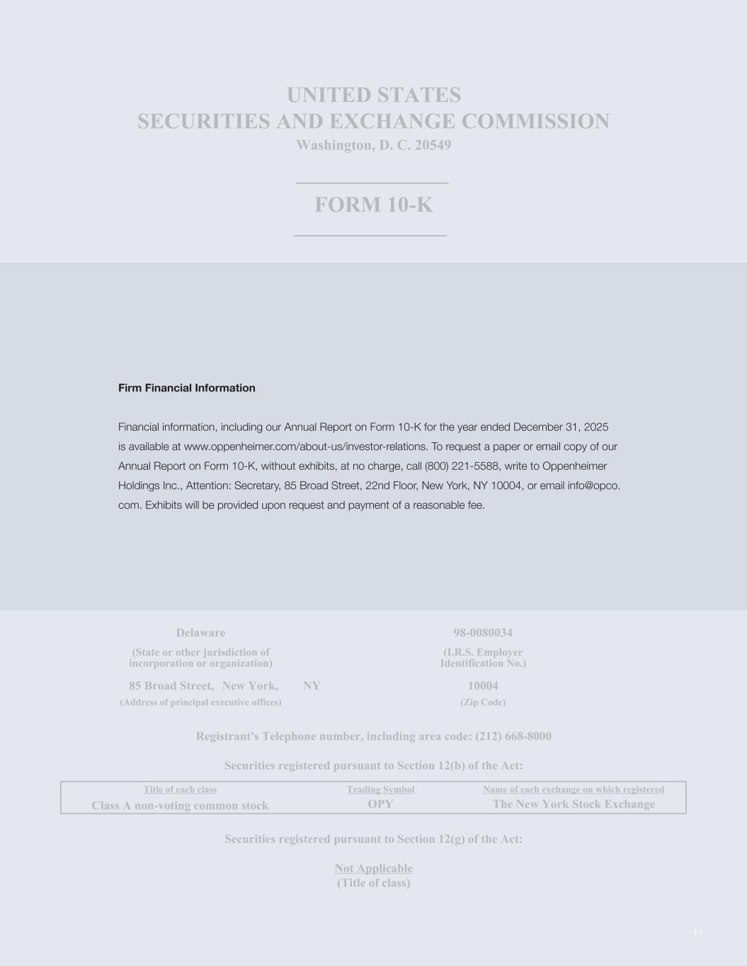 正如2022年2月28日向美国证券交易委员会提交的那样,根据1934年《证券交易法》第13或15(d)条,根据截至12月31日的财政年度,美国华盛顿特区证券交易委员会20549表格10-K(Mark One)x年度报告,2021年或o根据1934年《证券交易法》第13或15(d)条提交的过渡报告,内容涉及从委托文件编号1-12043 OPPENHEIMER HOLDINGS INC.(注册人的确切名称,在其章程中指定)Delaware 98-0080034(州或公司或组织的其他司法管辖区)(I.R.S.雇主识别号)85 Broad Street,New York,NY 10004(主要行政办公室地址)(邮编)注册人的电话号码,包括区号:(212)668-8000根据该法案第12(b)节注册的证券:各类名称交易代码注册A类无投票权普通股的每个交易所名称OPY根据该法案第12(g)节注册的纽约证券交易所证券:不适用(类别名称)目录公司财务信息财务信息,包括我们截至2025年12月31日止年度的10-K表格年度报告,请访问www.oppenheimer.com/about-us/investor-relations。如需免费索取我们的10-K表格年度报告的纸质或电子邮件副本,无需出示展品,请致电(800)221-5588,致函Oppenheimer Holdings Inc.,收件人:Secretary,85 Broad Street,22nd Floor,New York,NY 10004,或发送电子邮件至info @ opco. com。展品将应要求提供并支付合理费用。11