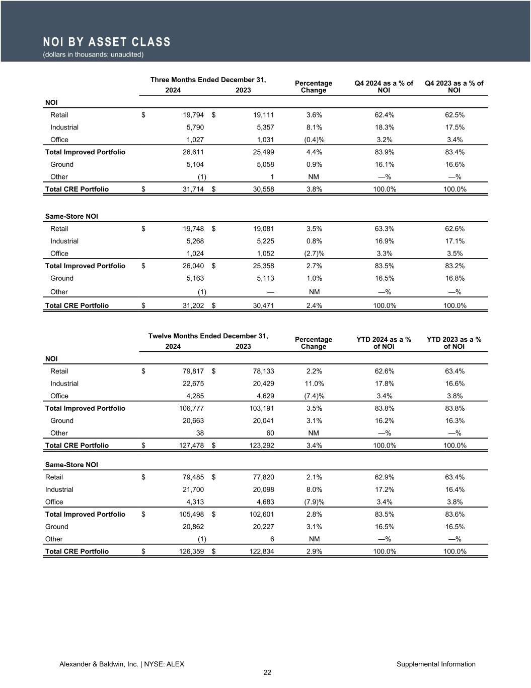 按资产类别划分的NOI(千美元;未经审计)截至12月31日的三个月,2024年第四季度占2023年第四季度NOI的百分比变化占NOI2024的百分比2023 NOI Retail $ 19,794 $ 19,1113.6% 62.4% 62.5% Industrial 5,7905,3578.1% 18.3% 17.5% Office 1,0271,031(0.4)% 3.2% 3.4% Total Improved Portfolio 26,61125,4994.4% 83.9% 83.4% Ground 5,1045,0580.9% 16.1% 16.6% Other(1)1 NM —% —% Total CRE Portfolio $ 31,714 $ 30,5583.8% 100.0% 100.0% Same-Store NOI Retail $ 19,748 $ 19,0813.5% 63.3% 62.6% Industrial 5,2685,2250.8% 16.9% 17.1% Office 1,0 241,052(2.7)% 3.3% 3.5% Total Improved Portf—% CRE投资组合总额$ 31,202 $ 30,4712.4% 100.0% 100.0%截至12月31日的十二个月,2024年年初至今占2023年年初至今NOI的百分比变化占NOI2024的百分比2023 NOI Retail $ 79,817 $ 78,1332.2% 62.6% 63.4% Industrial 22,67520,42911.0% 17.8% 16.6% Office 4,2854,629(7.4)% 3.4% 3.8% Total Improved Portfolio 106,777103,1913.5% 83.8% Ground 20,66320,0413.1% 16.2% 16.3% Other 3860 NM —% —% Total CRE Portfolio $ 127,478 $ 123,2923.4% 100.0%同店NOI Retail $ 79,485 $ 77,8202.1% 62.9% 63.4% Industrial 21,70020,0988.0% 17.2% 16.4% Office 4,3134,683(7.9)% 3.4% 3.8% Total Improved Portfolio $ 105,—% CRE投资组合总额126,359美元122,8342.9% 100.0% 100.0% Alexander & Baldwin, Inc. | NYSE:ALEX补充信息22
