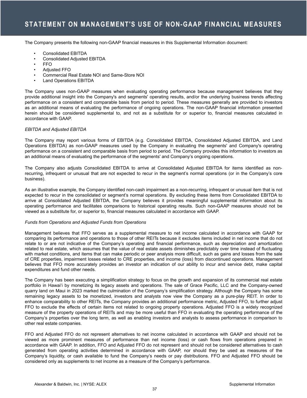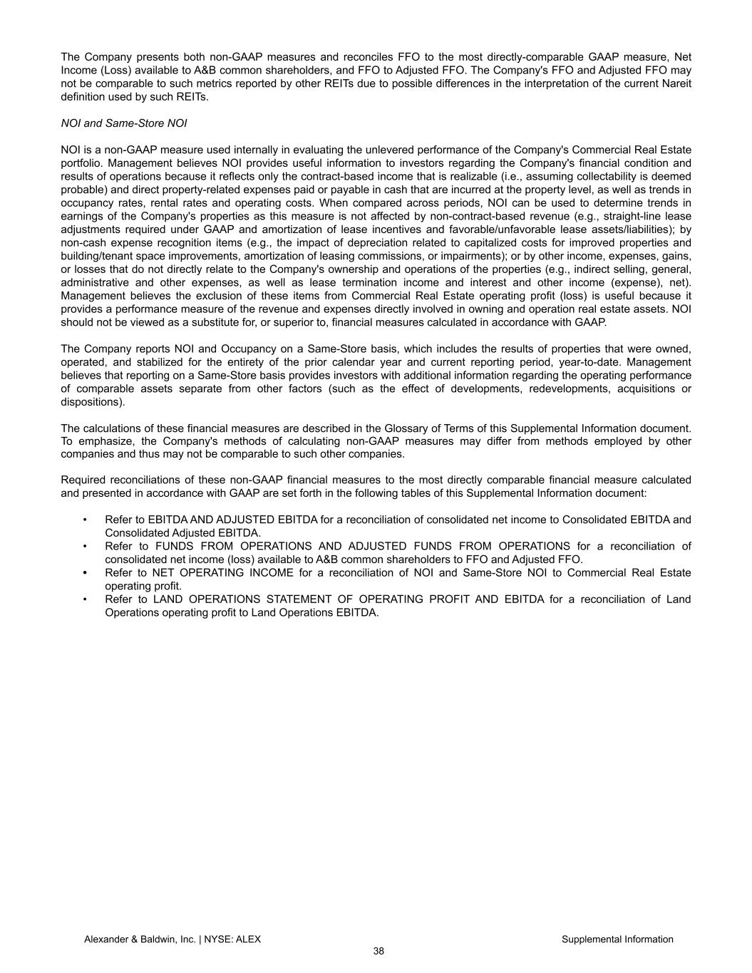 关于管理层使用非公认会计准则财务指标的声明公司在本补充信息文件中提出了以下非公认会计准则财务指标:•合并EBITDA •合并调整后EBITDA • FFO •调整后FFO •商业地产NOI和同店NOI •土地运营EBITDA公司在评估经营业绩时使用非公认会计准则指标,因为管理层认为它们提供了对公司和分部经营业绩的额外洞察,和/或在不同时期的一致和可比基础上影响业绩的基本业务趋势。这些措施一般提供给投资者,作为评估持续经营业绩的额外手段。此处提供的非GAAP财务信息应被视为对根据GAAP计算的财务指标的补充,而不是替代或优于。EBITDA和调整后EBITDA公司可能会报告各种形式的EBITDA(例如合并EBITDA、合并调整后EBITDA和土地运营EBITDA),作为公司在不同时期以一致和可比的基础评估分部和公司经营业绩时使用的非公认会计原则衡量标准。公司向投资者提供这些信息,作为评估分部业绩和公司持续经营的额外手段。公司还对合并EBITDA进行调整,以得出被确定为非经常性、不经常或不寻常的项目的合并调整后EBITDA,这些项目预计不会在该部门的正常运营(或公司的核心业务)中重复发生。作为一个说明性的例子,公司将非现金减值确定为预计不会在合并或分部的正常运营中再次发生的非经常性、不经常或不寻常的项目。通过将这些项目从合并EBITDA中剔除以得出合并调整后EBITDA,公司认为这提供了有关其经营业绩的有意义的补充信息,并有助于与历史经营业绩进行比较。此类非公认会计原则措施不应被视为替代或优于根据公认会计原则计算的财务措施。来自运营的资金和来自运营管理部门的调整后资金认为,FFO可作为根据GAAP计算的净收入的补充衡量标准,用于将其业绩和运营与其他REITs的业绩和运营进行比较,因为它不包括净收入中包含的与公司运营和财务业绩无关或不具有指示性的项目,例如与房地产相关的折旧和摊销,其中假设房地产资产的价值随着时间的推移而可预测地减少,而不是随市场情况波动,以及可能使定期或同行分析更加困难的项目,例如出售CRE物业的损益、与CRE物业相关的减值损失以及终止经营业务的收入(亏损)。管理层认为,FFO更准确地向投资者提供了我们承担和偿还债务、进行资本支出和为其他需求提供资金的能力的指标。该公司一直在执行简化战略,通过将其遗留资产和运营货币化,专注于其在夏威夷的商业房地产投资组合的增长和扩张。2023年出售Grace Pacific,LLC和公司在毛伊岛拥有的采石场土地标志着公司简化战略的高潮。尽管该公司还有一些剩余的遗留资产需要货币化,但投资者和分析师现在将该公司视为一家纯粹的房地产投资信托基金。为了增强与其他REITs的可比性,该公司提供了一个额外的绩效指标,即调整后的FFO,以进一步调整FFO以排除与正在进行的物业运营无关的某些项目的影响。调整后的FFO是一种被广泛认可的衡量REITs物业运营的指标,在评估公司物业的长期运营业绩方面可能比FFO更有用,并使投资者和分析师能够评估与其他房地产公司相比的业绩表现。FFO和调整后的FFO不代表根据GAAP计算的净收入的替代方案,不应被视为比根据GAAP编制的净收入(亏损)或运营现金流更突出的业绩衡量标准。此外,FFO和调整后的FFO不代表也不应被视为根据公认会计原则确定的经营活动产生的现金的替代品,也不应将其用作公司流动性的衡量标准,或可用于为公司需求提供资金或支付分配的现金。FFO和调整后的FFO应仅被视为作为衡量公司业绩的净收入的补充。Alexander & Baldwin, Inc. | NYSE:ALEX补充信息37