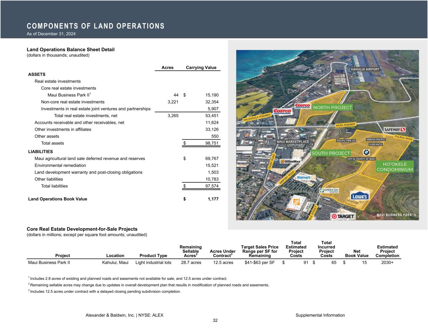 截至2024年12月31日的土地运营构成部分土地运营资产负债表明细(单位:千美元;未经审计)英亩账面价值资产房地产投资核心房地产投资毛伊岛商业园II 4415,190美元非核心房地产投资3,22132,354对房地产合资企业和合伙企业的投资5,907房地产投资总额,净额3,26553,451应收账款和其他应收款,净额11,624对附属公司的其他投资33,126其他资产550总资产98,751美元负债毛伊岛农地出售递延收入和准备金69,767美元环境整治15,521土地开发保修和交割后义务1,503其他负债10,783总负债97,574美元土地运营账面价值1,177美元核心房地产开发待售项目(百万美元;每平方英尺金额除外;未经审计)项目地点产品类型剩余可销售面积2英亩根据合同3目标销售价格范围每平方英尺剩余估计项目总成本总已发生项目成本账面净值估计项目完成毛伊岛商业园II Kahului,毛伊岛轻工业地块28.7英亩12.5英亩$ 41-63每SF $ 91 $ 65 $ 152030 + 1包括2.8英亩现有和规划中的道路和地役权不可出售,以及12.5英亩的合同。2剩余的可售英亩可能会因整体开发计划的更新而发生变化,从而导致对规划道路和地役权的修改。3包括12.5英亩的合同,延迟关闭等待细分完成。Alexander & Baldwin, Inc. | NYSE:ALEX补充资料32 MAUI BUSINESS PARK I I