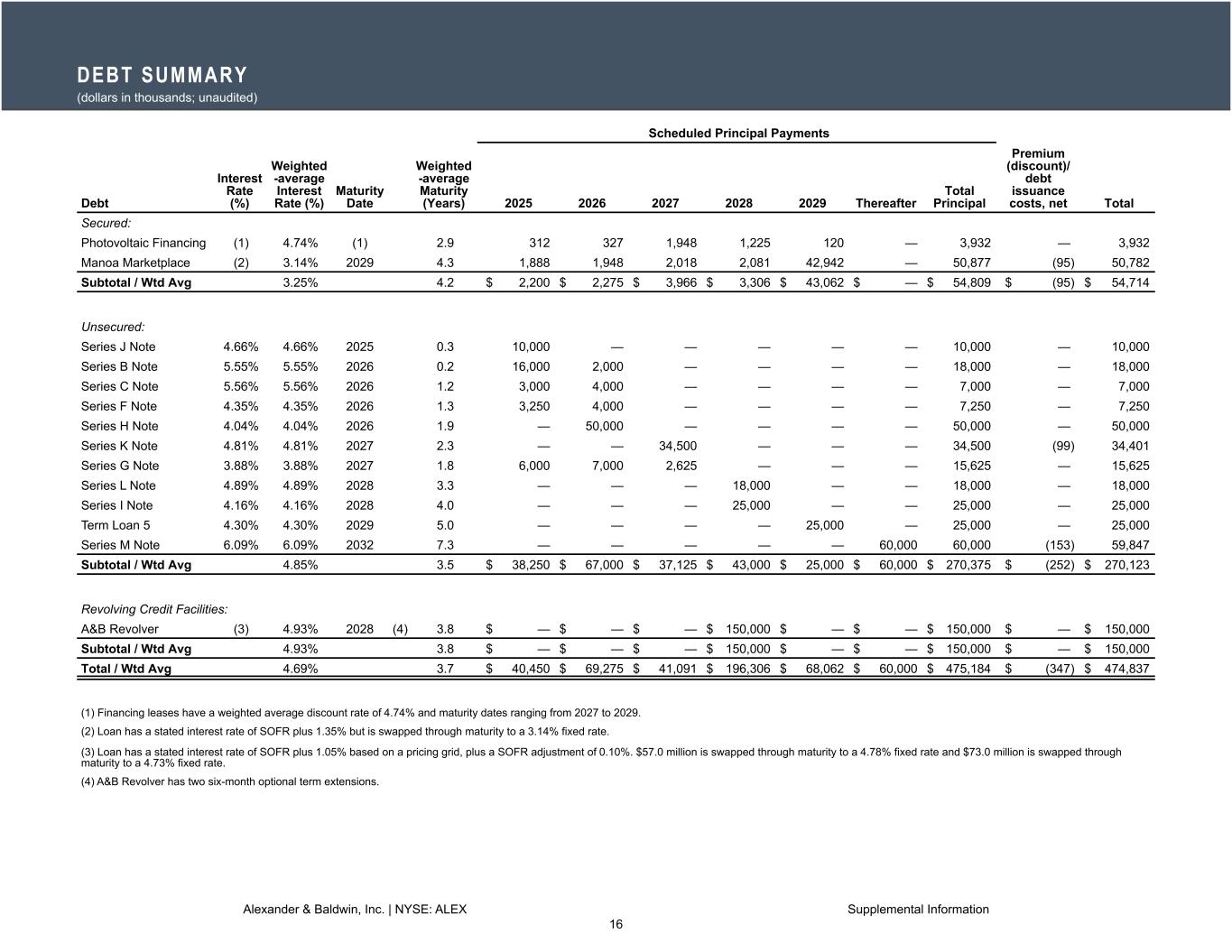 债务摘要(千美元;未经审计)预定本金支付债务利率(%)加权-平均利率(%)到期日加权-平均期限(年)20252026202720282029此后本金总溢价(折价)/债务发行成本,有担保净总额:光伏融资(1)4.74%(1)2.93 123271,9481,225120 — 3,932 — 3,932 Manoa Marketplace(2)3.14% 20294.31,8881,9482,0 182,08142,942 — 50,877(95)50,782小计/WTD平均3.25% 4.2 $ 2,200 $ 2,275 $ 3,966 $ 3,306 $ 43,062 $ — $ 54,809 $(95)$ 54,714无担保:J系列票据4.66% 20250.310,000 ———— 10,000 — 10,000 B系列票据5.55% 5.55% 20260.21,0002,000 ———— 18,000 — 18,000 C系列票据5.56% 5.56% 20261.23,0004,000 ————— 7,000 — 7,000系列F票据4.35% 4.35% 20261.33,2504,000 ———— 7,250 — 7,250系列H票据4.04% 4.04% 20261.9 — 50,000 ———— 50,000 — 50,000系列K票据4.81% 4.81% 2027 2.3 —— 34,500 ———— 34,500(99)34,401系列G票据3.88% 3.88% 2027,0007,0002,625 ———— 15,625 — 15,625系列L票据4.89% 4.89% 20283.3 ———— 18,000 —— 18,000 —— 18,000系列I票据4.16% 4.16% 20284.0 ———— 25,000 ——25,000 — 25,000定期贷款54.30% 4.30% 20295.0 ———— 25,000 — 25,000 — 25,000系列M票据6.09% 6.09% 20327.3 ———— 60,00060,000(153)59,847小计/WTD平均4.85% 3.5 $ 38,250 $ 67,000 $ 37,125 $ 43,000 $ 25,000 $ 60,000 $ 270,375 $(252)$ 270,123循环信贷便利:A & B Revolver(3)4.93% 2028(4)3.8 $ — $ — $ 150,000 $ — $ 150,000 $ — $ 150,000小计/WTD平均4.93% 3.8 $ — $ — $ —$ 150,000 $ — $ — $ 150,000 $ — $ 150,000 Total/WTD Avg 4.69% 3.7 $ 40,450 $ 69,275 $ 41,091 $ 196,306 $ 68,062 $ 60,000 $ 475,184 $(347)$ 474,837(1)融资租赁的加权平均贴现率为4.74%,到期日为2027年至2029年。(2)贷款的规定利率为SOFR加1.35%,但通过到期互换为3.14%的固定利率。(3)贷款以定价网格为基础,规定利率为SOFR加1.05%,再加上0.10%的SOFR调整。5700万美元通过到期互换为4.78%的固定利率,7300万美元通过到期互换为4.73%的固定利率。(4)A & B Revolver有两个六个月的可选任期延长。Alexander & Baldwin, Inc. | NYSE:ALEX补充资料16