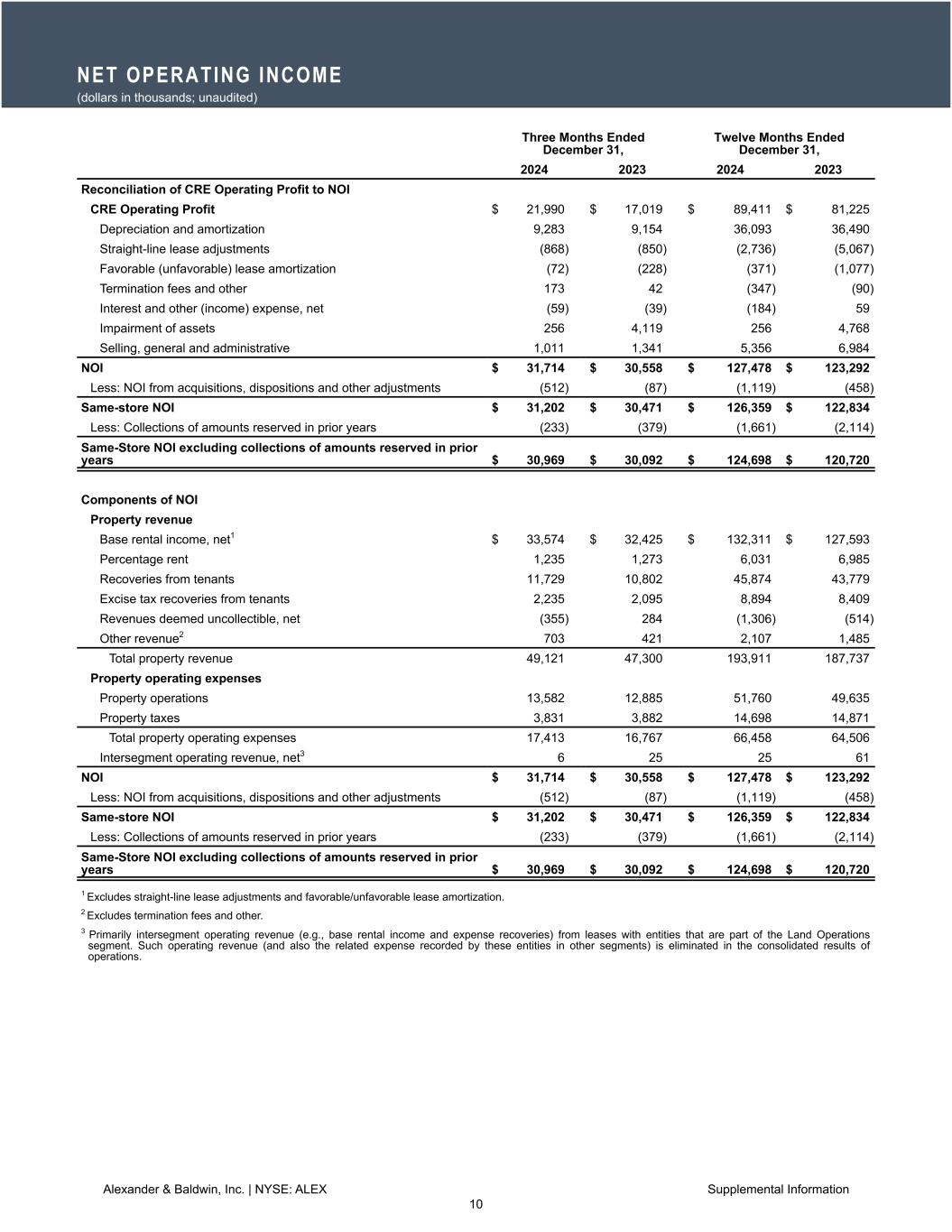 净营业收入(千美元;未经审计)截至12月31日的三个月、截至12月31日的十二个月、2024202320242023 CRE营业利润与NOI CRE营业利润的对账21,990美元17,019美元89,411美元81,225美元折旧和摊销9,2839,15436,09336,490直线租赁调整(868)(850)(2,736)(5,067)有利(不利)租赁摊销(72)(228)(371)(1,077)终止费和其他17342(347)(90)利息和其他(收入)费用净额(59)(39)(184)59资产减值2564,1192564,768出售,一般和行政1,0111,3415,3566,984 NOI 31,714美元30,558美元127,478美元123,292美元减:来自收购、处置和其他调整的NOI(512)(87)(1,119)(458)同店NOI 31,202美元30,471美元126,359美元122,834美元减:以前年度保留金额的收款(233)(379)(1,661)(2,114)同店NOI不包括以前年度保留金额的收款30,969美元30,092美元124,698美元120,720 NOI物业收入基本租金收入的组成部分,净额1 $ 33,574 $ 32,425 $ 132,311 $ 127,593百分比租金1,2351,2736,0316,985从租户收回的款项11,72910,80245,87443,779从租户收回的消费税2,2352,0958,8948,409被视为无法收回的收入,净额(355)284(1,306)(514)其他收入27034212,1071,485物业收入总额49,12147,300193,911187,737物业经营费用物业经营13,58212,88551,76049,635物业税3,8313,88214,69814,871物业经营费用总额17,41316,76766,45864,506分部间营业收入净额3,6252561 NOI 31,处置和其他调整(512)(87)(1119)(458)同店NOI $ 31,202 $ 30,471 $ 126,359 $ 122,834减:以前年度保留金额的收款(233)(379)(1,661)(2,114)同店NOI不包括以前年度保留金额的收款$ 30,969 $ 30,092 $ 124,698 $ 120,7201不包括直线租赁调整和有利/不利的租赁摊销。2不包括终止费和其他。3主要是与属于土地业务部门的实体的租赁产生的部门间营业收入(例如,基本租金收入和费用回收)。此类营业收入(以及这些实体在其他分部记录的相关费用)在综合经营业绩中予以抵销。Alexander & Baldwin, Inc. | NYSE:ALEX补充资料10