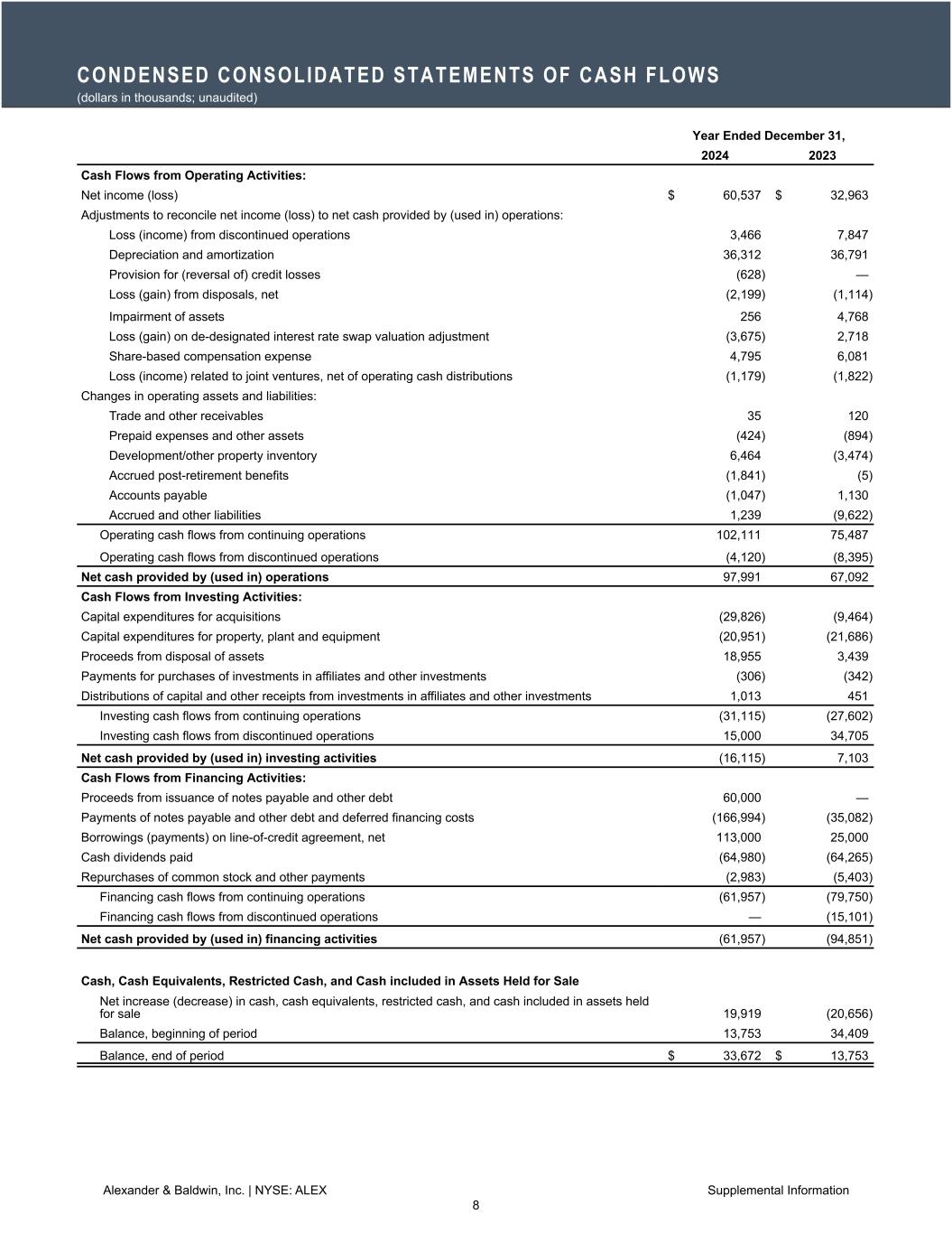 现金流量简明合并报表(单位:千美元;未经审计)截至2024年12月31日止年度2023年经营活动现金流量:净收入(亏损)60,537美元32,963美元调整以调节净收入(亏损)与经营提供(用于)的净现金:终止经营业务的损失(收入)3,4667,847折旧和摊销36,31236,791信用损失准备(转回)(628)——处置损失(收益)净额(2,199)(1,114)资产减值2564,768非指定利率掉期估值调整损失(收益)(3,675)2,718股份补偿费用4,7956,081与合营企业相关的损失(收益),经营现金分配净额(1,179)(1,822)经营资产和负债变动:贸易和其他应收款35120预付费用和其他资产(424)(894)开发/其他财产盘存6,464(3,474)应计退休后福利(1,841)(5)应付账款(1,047)1,130应计和其他负债1,239(9,622)持续经营产生的经营现金流量102,11175,487终止经营产生的经营现金流量(4,120)(8,395)经营提供(用于)的现金净额97,99167,092投资活动产生的现金流量:收购的资本支出(29,826)(9,464)财产的资本支出,厂房及设备(20,951)(21,686)处置资产所得款项18,9553,439购买联属公司投资款项及其他投资款项(306)(342)分配资本及对联属公司投资款项及其他投资款项1,013451持续经营产生的投资现金流量(31,115)(27,602)投资终止经营产生的现金流量15,00034,705投资活动提供(用于)的现金净额(16,115)7,103融资活动产生的现金流量:发行应付票据及其他债务所得款项60,000 —支付应付票据及其他债务款项及递延融资费用(166,994)(35,082)信贷额度协议借款(款项),已支付现金股利净额113,00025,000(64,980)(64,265)回购普通股及其他款项(2,983)(5,403)来自持续经营业务的筹资现金流量(61,957)(79,750)来自已终止经营业务的筹资现金流量—(15,101)筹资活动提供(用于)的现金净额(61,957)(94,851)现金、现金等价物、受限现金、以及计入持有待售资产的现金净增(减)额19,919(20,656)余额,期初13,75334,409余额,期末33,672美元13,753美元Alexander & Baldwin, Inc. |纽约证券交易所:ALEX补充信息8