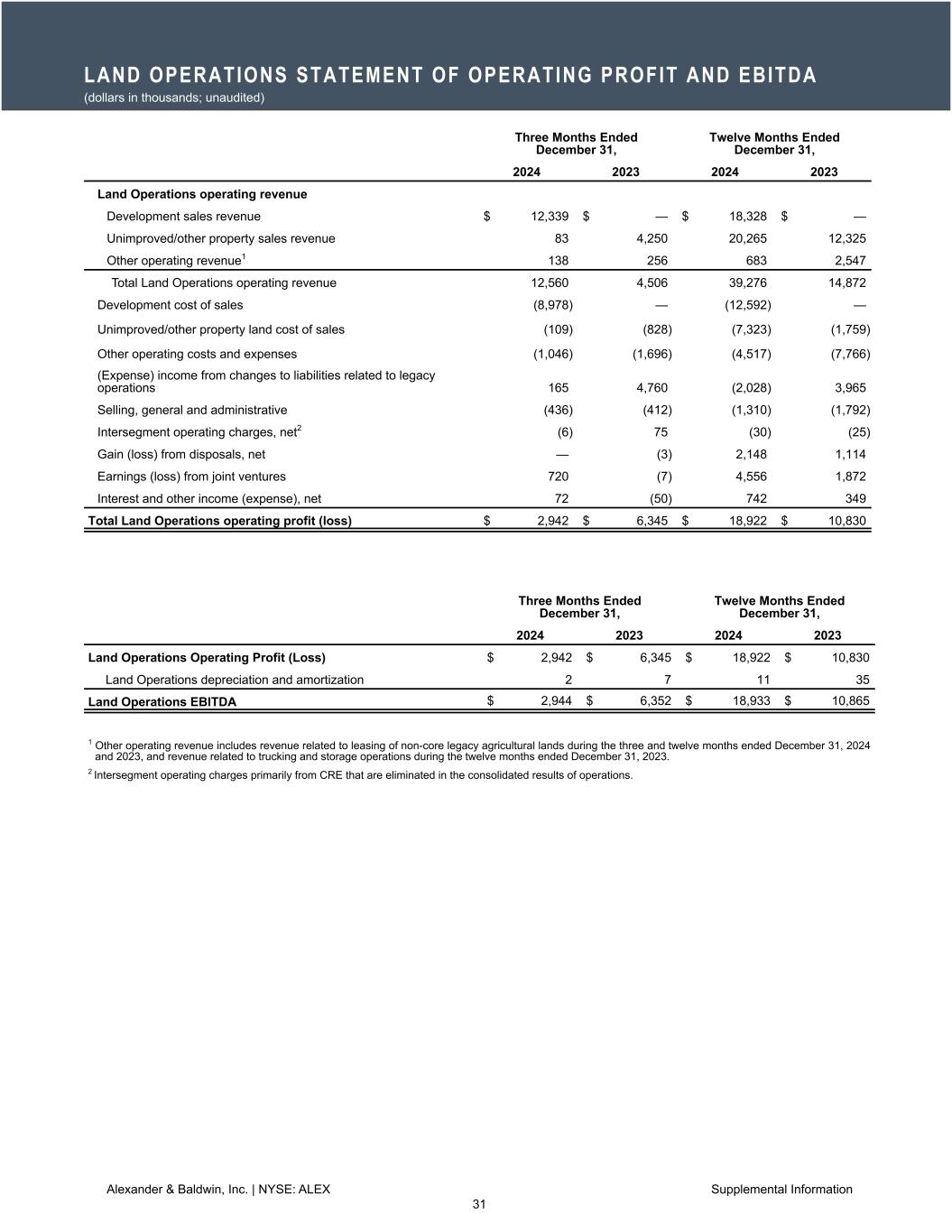 LAND Operations经营利润和EBITDA报表(单位:千美元;未经审计)截至12月31日止三个月,截至12月31日止十二个月,2024202320242023土地运营营业收入开发销售收入$ 12,339 $ — $ 18,328 $ —未改善/其他物业销售收入834,25020,26512,325其他运营收入11382566832,547土地运营营业总收入12,5604,50639,27614,872开发销售成本(8,978)—(12,592)—未改善/其他物业土地销售成本(109)(828)(7,323)(1,759)其他运营成本和费用(1,046)(1,696)(4,517)(7,766)(费用)与遗留业务相关的负债变动收入1654,760(2,028)3,965销售、一般和行政(436)(412)(1,310)净额2(6)75(30)(25)处置收益(亏损),净额——(3)21481114合联营企业收益(亏损)720(7)45561872利息和其他收入(费用),净额72(50)742349土地业务营业利润总额(亏损)2942美元6345美元18922美元10830美元截至12月31日的三个月,截至12月31日的十二个月,2024202320242023土地业务营业利润(亏损)2,942美元6,345美元18,922美元10,830美元土地业务折旧和摊销271135土地业务EBITDA 2,944美元6,352美元18,933美元10,865美元1其他营业收入包括截至2024年12月31日和2023年12月31日止三个月和十二个月期间与租赁非核心遗留农业用地相关的收入,以及截至2023年12月31日止十二个月期间与卡车运输和仓储业务相关的收入。2主要来自CRE的分部间运营费用在综合经营业绩中消除。Alexander & Baldwin, Inc. | NYSE:ALEX补充信息31