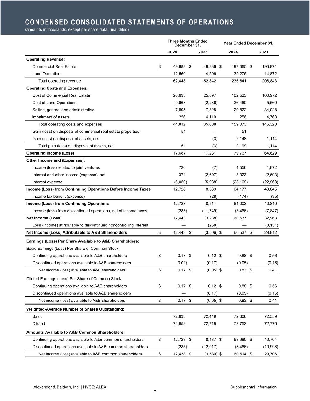 简明合并经营报表(金额以千为单位,每股数据除外;未经审计)截至12月31日止三个月,截至2024年12月31日止年度202320242023营业收入:商业地产$ 49,888 $ 48,336 $ 197,365 $ 193,971土地经营12,5604,50639,27614,872总营业收入62,44852,842236,641208,843营业成本和费用:商业地产成本26,69325,897102,535100,972土地经营成本9,968(2,236)26,4605,560出售,一般和行政7,8957,82829,82234,028资产减值2564,1192564,768营业成本和费用总额44,81235,608159,073145,328处置商业不动产收益(损失)51 — 51 —处置资产收益(损失)净额——(3)2,1481,114处置资产收益(损失)总额净额51(3)2,1991,114营业收入(亏损)17,68717,23179,76764,629其他收入和(费用):与合营企业相关的收益(损失)720(7)4,5561,872利息和其他收入(费用),净额371(2,697)3,023(2,693)利息支出(6,050)(5,988)(23,169)(22,963)所得税前持续经营收入(亏损)12,7288,53964,17740,845所得税优惠(费用)—(28)(174)(35)持续经营收入(亏损)12,7288,51164,00340,810终止经营收入(亏损),扣除所得税(285)(11,749)(3,466)(7,847)净收入(亏损)12,443(3,238)60,53732,963归属于已终止非控股权益的亏损(收入)—(268)—(3,151)归属于A & B股东的净收入(亏损)$ 12,443 $(3,506)$ 60,537 $ 29,812 A & B股东可获得的每股收益(亏损):A & B股东可获得的持续经营业务$ 0.18 $ 0.12 $ 0.88 $ 0.56 A & B股东可获得的已终止经营业务(0.01)(0.17)(0.05)(0.15)A & B股东可获得的净收入(亏损)$ 0.17 $(0.05)$ 0.83 $ 0.41摊薄后每股收益(亏损)普通股份额:A & B股东可获得的持续经营业务$ 0.17 $ 0.12 $ 0.88 $ 0.56 A & B股东可获得的终止经营业务—(0.17)(0.05)(0.15)A & B股东可获得的净收入(亏损)$ 0.17 $(0.05)$ 0.83 $ 0.41加权平均流通股数:基本72,63372,44972,60672,559稀释后72,85372,71972,75272,776 A & B普通股股东可获得的金额:A & B普通股股东可获得的持续经营业务$ 12,723 $ 8,487 $ 63,980 $ 40,704 A & B普通股股东可获得的终止经营业务(285)(12,017)(3,466)(10,998)A & B普通股股东可获得的净收入(亏损)$12,438美元(3,530)美元60,514美元29,706美元Alexander & Baldwin, Inc. |纽约证券交易所:ALEX补充信息7