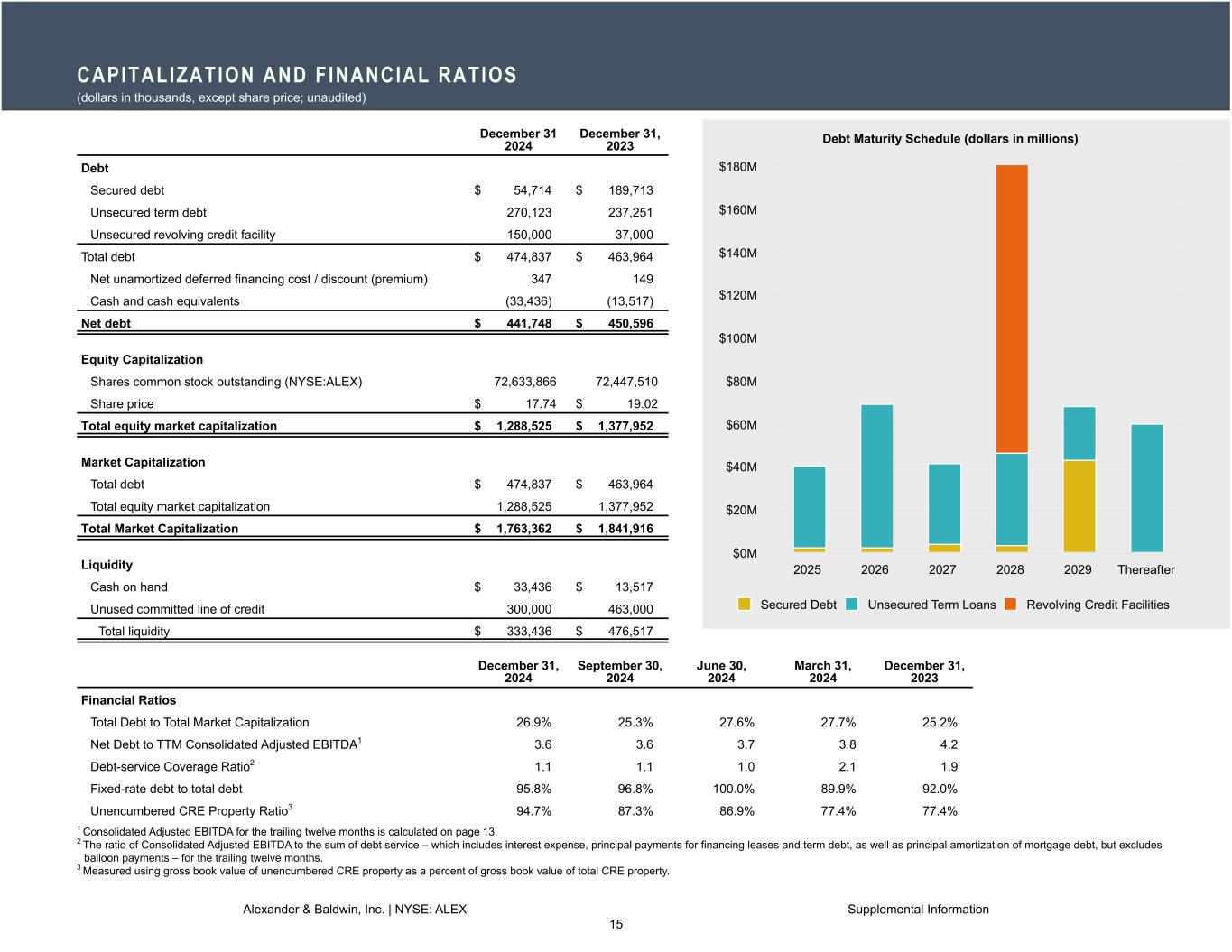 资本化和财务比率(千美元,股价除外;未经审计)2024年12月31日2024年12月31日,2023年债务担保债务54,714美元189,713美元无担保定期债务270,123237,251无担保循环信贷额度150,00037,000总债务474,837美元463,964美元未摊销递延融资成本净额/折扣(溢价)347149现金和现金等价物(33,436)(13,517)净债务$ 441,748 $ 450,596已发行普通股(NYSE:ALEX)72,633,86672,447,510股价$ 17.74 $ 19.02总股本市值$ 1,288,525 $ 1,377,952总市值$ 474,837 $ 463,964总股本市值$ 1,288,5251,377,952总市值$ 1,763,362 $ 1,841,916流动现金库存$ 33,436 $ 13,517未使用承诺信用额度300,000463,000总流动资金$ 333,436 $ 476,517 December 31,2024 September 30,2024 June 30,2024 March 31,2024 March 31,2023年财务比率总债务与总市值26.9% 25.3% 27.6% 27.7% 25.2%净债务与TTM合并调整后EBITDA 1 3.6 3.6 3.7 3.84.2偿债覆盖率21.1 1.11.0 2.1 1.9固定利率债务与总债务的比率95.8% 96.8% 100.0% 89.9% 92.0%未设押CRE财产比率3 94.7% 87.3% 86.9% 77.4% 77.4% 1过去12个月的合并调整后EBITDA在第13页计算。2过去12个月的合并调整后EBITDA与偿债总额的比率——包括利息支出、融资租赁和定期债务的本金支付,以及抵押债务的本金摊销,但不包括气球付款。3以未设押CRE财产的账面总值占CRE总财产账面总值的百分比计量。Alexander & Baldwin, Inc. | NYSE:ALEX补充信息15债务到期时间表(百万美元)有担保债务无担保定期贷款循环信贷便利20252026202720282029此后000万美元2000万美元4000万美元6000万美元8000万美元1亿美元1.2亿美元1.4亿美元1.6亿美元1.8亿美元