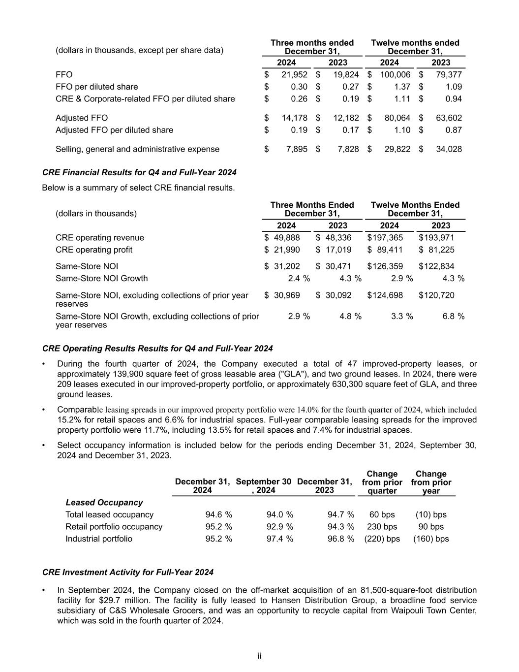 (以千美元计,每股数据除外)截至12月31日的三个月,截至12月31日的十二个月,2024202320242023 FFO $ 21,952 $ 19,824 $ 100,006 $ 79,377 FFO per diluted share $ 0.30 $ 0.27 $ 1.37 $ 1.09 CRE & corporate-related FFO per diluted share $ 0.26 $ 0.19 $ 1.11 $ 0.94调整后FFO $ 14,178 $ 12,182 $ 80,064 $ 63,602调整后FFO per diluted share $ 0.19 $ 0.17 $ 1.10 $ 0.87 selling,一般和管理费用7,895美元7,828美元29,822美元34,028美元CRE第四季度和2024年全年财务业绩以下是精选CRE财务业绩摘要。(单位:千美元)截至12月31日止三个月、截至2024年12月31日止十二个月202320242023 CRE营业收入$ 49,888 $ 48,336 $ 197,365 $ 193,971 CRE营业利润$ 21,990 $ 17,019 $ 89,411 $ 81,225同店NOI $ 31,202 $ 30,471 $ 126,359 $ 122,834同店NOI增长2.4% 4.3% 2.9%同店NOI,不包括上一年储备的收款$ 30,969 $ 30,092 $ 124,698 $ 120,720同店NOI增长,不包括上年储备的收款2.9% 4.8% 3.3% 6.8% CRE 2024年第四季度和全年经营业绩•在2024年第四季度,公司共执行了47项改善物业租赁,即约13.99万平方英尺的总可出租面积(“GLA”),以及两项地面租赁。2024年,我们改善后的物业组合中执行了209份租约,约合630,300平方英尺的GLA,以及三份地面租约。• 2024年第四季度,我们改善后的物业组合的可比租赁利差为14.0%,其中零售空间为15.2%,工业空间为6.6%。改善物业组合的全年可比租赁利差为11.7%,其中零售空间为13.5%,工业空间为7.4%。•以下包括截至2024年12月31日、2024年9月30日和2023年12月31日期间的选定入住信息。2024年12月31日2024年9月30日2023年12月31日与上季度相比的变化与上一年相比的变化租赁占用率总租赁占用率94.6% 94.0% 94.7% 60个基点(10)个基点零售组合占用率95.2% 92.9% 94.3% 230个基点90个基点工业组合占用率95.2% 97.4% 96.8%(220)个基点(160)个基点2024年全年CRE投资活动• 2024年9月,公司以2970万美元完成了对81,500平方英尺分销设施的场外收购。该设施已全部出租给Hansen Distribution Group,后者是C & S Wholesale Grocers的一家广义食品服务子公司,是一个从Waipouli Town Center回收资本的机会,该中心已于2024年第四季度出售。ii