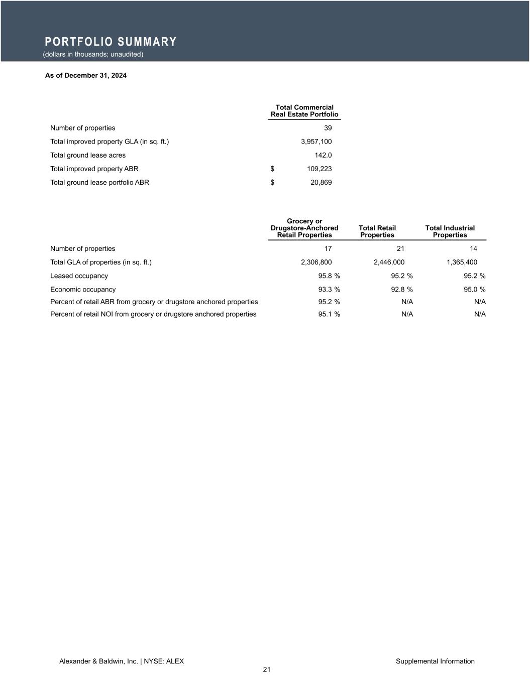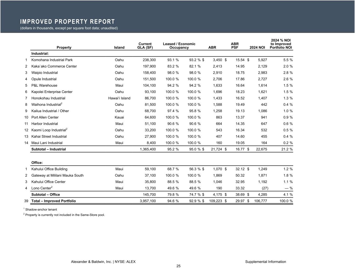 改善的财产报告(千美元,每平方英尺数据除外;未经审计)Industrial:1 Komohana Industrial Park Oahu 238,30093.1% 93.2% $ 3,450 $ 15.54 $ 5,9275.5% 2 Kaka ` ako Commerce Center Oahu 197,90083.2% 82.1% 2,41314.952,1292.0% 3 Waipio Industrial Oahu 158,40098.0% 98.0% 2,91018.752,9832.8% 4 Opule Industrial Oahu 151,500100.0% 100.0% 2,70617.86 2,7272.6% 5 P & L Warehouse Maui 104,10094.2% 94.2% 1,63316.641,6141.5% 6 Kapolei Enterprise Center Oahu 93,100100.0% 100.0% 1,696 18.231,6211.5% 7 Honok夏威夷岛86,700100.0% 100.0% 1,43316.521,4071.3% 8 Waihona Industrial2 Oahu 81,500100.0% 100.0% 1,588 19.494420.4% 9 Kailua Industrial/Other Oahu 68,70097.4% 95.8% 1,25819.13 1,0861.0% 10 Port Allen Center Kauai 64,600100.0% 100.0% 86313.379410.9% 11 Harbor Industrial Maui 51,10090.6% 90.6% 66414.356470.6% 12 Kaomi Loop Industrial2 Oahu 33,200100.0% 100.0% 54316.345320.5% 13 KAhai Street Industrial Oahu 27,900100.0% 100.0% 40714.604550.4% 14毛伊拉尼工业毛伊8,400100.0% 100.0% 16019.05 1640.2%小计–工业1,365,40095.2% 95.0% $ 21,724 $ 16.77 $ 22,67521.2%办公室:1 Kahului办公楼毛伊岛59,10068.7% 56.3% $ 1,070 $ 32.12 $ 1,2491.2% 2 Gateway at Mililani Mauka South Oahu 37,100100.0% 100.0% 1,86950.321,8711.8% 3 Kahului办公中心毛伊岛35,80088.5% 88.5% 1,04632.951,1921.1% 4 Lono Center2毛伊岛13,70049.6% 49.6% 19033.32(27)—%小计– Office 145,70079.8% 74.7% $ 4,175 $ 38.69 $ 4,2854.1% 39 Total – Improved Portfolio 3,957,10094.6% 92.9% $ 109,223 $ 29.97 $ 106,777100.0% 1 Shadow-anchor tenant 2 Property目前不包括在同店池中。Property Island Current GLA(SF)Leased/Economic Occupancy ABR ABR PSF 2024 NOI 2024% NOI to Improved Portfolio NOI Alexander & Baldwin, Inc. | NYSE:ALEX补充信息25