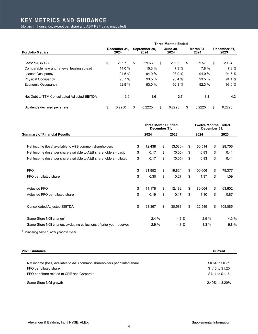 关键指标和指引(以千美元计,每股和ABR PSF数据除外;未经审计)截至三个月的投资组合指标2024年12月31日2024年9月30日、2024年6月30日、2024年3月31日、2024年12月31日,2023租赁ABR PSF $ 29.97 $ 29.66 $ 29.63 $ 29.57 $ 29.04可比新建和续租租赁价差14.0% 15.3% 7.3% 7.8% 7.8%租赁入住率94.6% 94.0% 93.9% 94.0% 94.7%实际入住率93.7% 93.5% 93.4% 93.5% 94.1%经济入住率92.9% 93.0% 92.8% 92.3% 93.0%净债务对TTM合并调整后EBITDA 3.6 3.6 3.7 3.84.2每股宣派股息$ 0.2250 $ 0.2225 $ 0.2225 $ 0.2225 $ 0.2225截至12月31日止三个月,截至12月31日的12个月,财务业绩摘要2024202320242023 A & B普通股股东可获得的净收入(亏损)$ 12,438 $(3,530)$ 60,514 $ 29,706 A & B股东可获得的每股净收益(亏损)-基本$ 0.17 $(0.05)$ 0.83 $ 0.41 A & B股东可获得的每股净收益(亏损)-稀释后$ 0.17 $(0.05)$ 0.83 $ 0.41 FFO $ 21,952 $ 19,824 $ 100,006 $ 79,377 FFO per dilated share $ 0.30 $ 0.27 $ 1.37 $ 1.09 adjusted FFO $ 14,178 $ 12,182 $ 80,064 $ 63,602 adjusted FFO per dilated share $ 0.190.17美元1.10美元0.87美元合并调整后EBITDA 28,367美元30,583美元122,589美元108,085美元同店NOI变化1 2.4% 4.3% 2.9% 4.3%同店NOI变化,不包括上年储备金的收款12.9% 4.8% 3.3% 6.8% 1同季度同比。2025年指导当前A & B普通股股东可获得的每股摊薄后净收益(亏损)0.64美元至0.71美元每股摊薄后FFO 1.13美元至1.20美元与CRE和企业相关的每股FFO 1.11美元至1.16美元同店NOI增长2.40%至3.20% Alexander & Baldwin, Inc. |纽约证券交易所代码:ALEX补充信息4