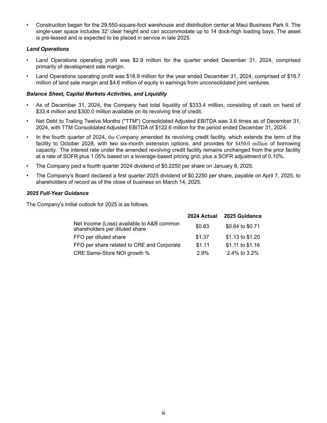 •毛伊岛商务园II的29,550平方英尺仓库和配送中心开始建设。单用户空间包括32 '净高,可容纳多达14个码头高的装货舱。该资产已预租,预计将于2025年底投入使用。土地运营•截至2024年12月31日的季度,土地运营运营利润为290万美元,主要包括开发销售利润率。•截至2024年12月31日止年度,土地运营运营利润为1890万美元,其中包括1870万美元的土地销售保证金和460万美元的未合并合资企业收益权益。资产负债表、资本市场活动和流动性•截至2024年12月31日,公司的流动资金总额为3.334亿美元,其中包括3340万美元的手头现金和循环信贷额度可用的3.00亿美元。•截至2024年12月31日,截至过去12个月的净债务(“TTM”)合并调整后EBITDA为3.6倍,截至2024年12月31日止期间,TTM合并调整后EBITDA为1.226亿美元。• 2024年第四季度,公司修改了循环信贷额度,将贷款期限延长至2028年10月,有两个六个月的延期选择,并提供了4.50亿美元的借贷能力。修订后的循环信贷安排下的利率与先前的安排保持不变,基于基于杠杆的定价网格的SOFR加1.05%的利率,加上0.10%的SOFR调整。•公司于2025年1月8日支付2024年第四季度股息每股0.2250美元。•公司董事会宣布,2025年第一季度股息为每股0.2250美元,将于2025年4月7日支付给截至2025年3月14日收盘时登记在册的股东。2025年全年指引公司对2025年的初步展望如下。A & B普通股股东每股摊薄收益(亏损)0.83美元0.64至0.71美元每股摊薄收益1.37美元1.13至1.20美元与CRE和企业相关的每股FFO 1.11美元1.11至1.16美元CRE同店NOI增长% 2.9% 2.4%至3.2% 2024年实际2025年指导三