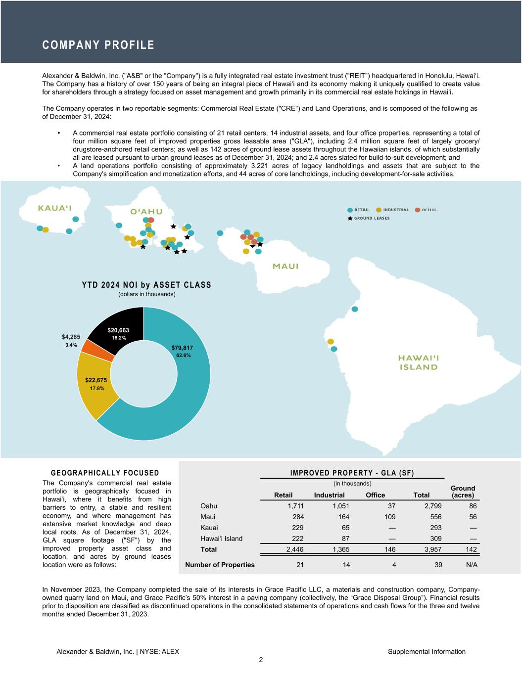 公司简介Alexander & Baldwin, Inc.(“A & B”或“公司”)是一家完全整合的房地产投资信托基金(“REIT”),总部位于夏威夷火奴鲁鲁。该公司拥有150多年的历史,是夏威夷及其经济不可或缺的一部分,这使其具有独特的资格,可以通过主要专注于其在夏威夷持有的商业房地产的资产管理和增长的战略为股东创造价值。该公司经营两个可报告分部:商业房地产(“CRE”)和土地业务,截至2024年12月31日由以下部分组成:•商业房地产投资组合,包括21个零售中心、14个工业资产和四个办公物业,代表总计400万平方英尺的改善后物业总可出租面积(“GLA”),其中包括240万平方英尺的主要由杂货店/药店锚定的零售中心;以及遍布夏威夷群岛的142英亩土地租赁资产,截至12月31日,其中基本上全部根据城市土地租赁出租,2024年;以及2.4英亩计划用于定制开发;•土地运营组合,包括约3,221英亩受公司简化和货币化努力影响的遗留土地所有权和资产,以及44英亩的核心土地所有权,包括开发出售活动。以地理为重点的改良物业-GLA(SF)(单位:千)地(英亩)零售工业办公室总计Oahu 1,7111,051372,79986 Maui 28416410955656 Kauai 22965 — 293 — Hawai'i Island 22287 — 309 —总计2,4461,3651463,957142物业数量2114439不适用于2023年11月,公司完成出售其于材料和建筑公司Grace Pacific LLC的权益、公司在毛伊岛拥有的采石场土地以及Grace Pacific在一家铺路公司的50%权益(统称“Grace处置集团”)。截至2023年12月31日止三个月和十二个月的综合经营和现金流量表将处置前的财务业绩分类为已终止经营业务。Alexander & Baldwin, Inc. | NYSE:ALEX Supplemental Information 2 $ 79,817 $ 22,675 $ 4,285 $ 20,663该公司的商业房地产投资组合地理位置集中在夏威夷,该地区受益于高准入门槛、稳定和有韧性的经济,并且该地区的管理层拥有广泛的市场知识和深厚的当地根基。截至2024年12月31日,按经改善的物业资产类别和地点划分的GLA面积(“SF”)、按地面租赁地点划分的英亩面积如下:3.4%年初至今2024年按资产类别划分的NOI(千美元)17.8% 16.2% 62.6%