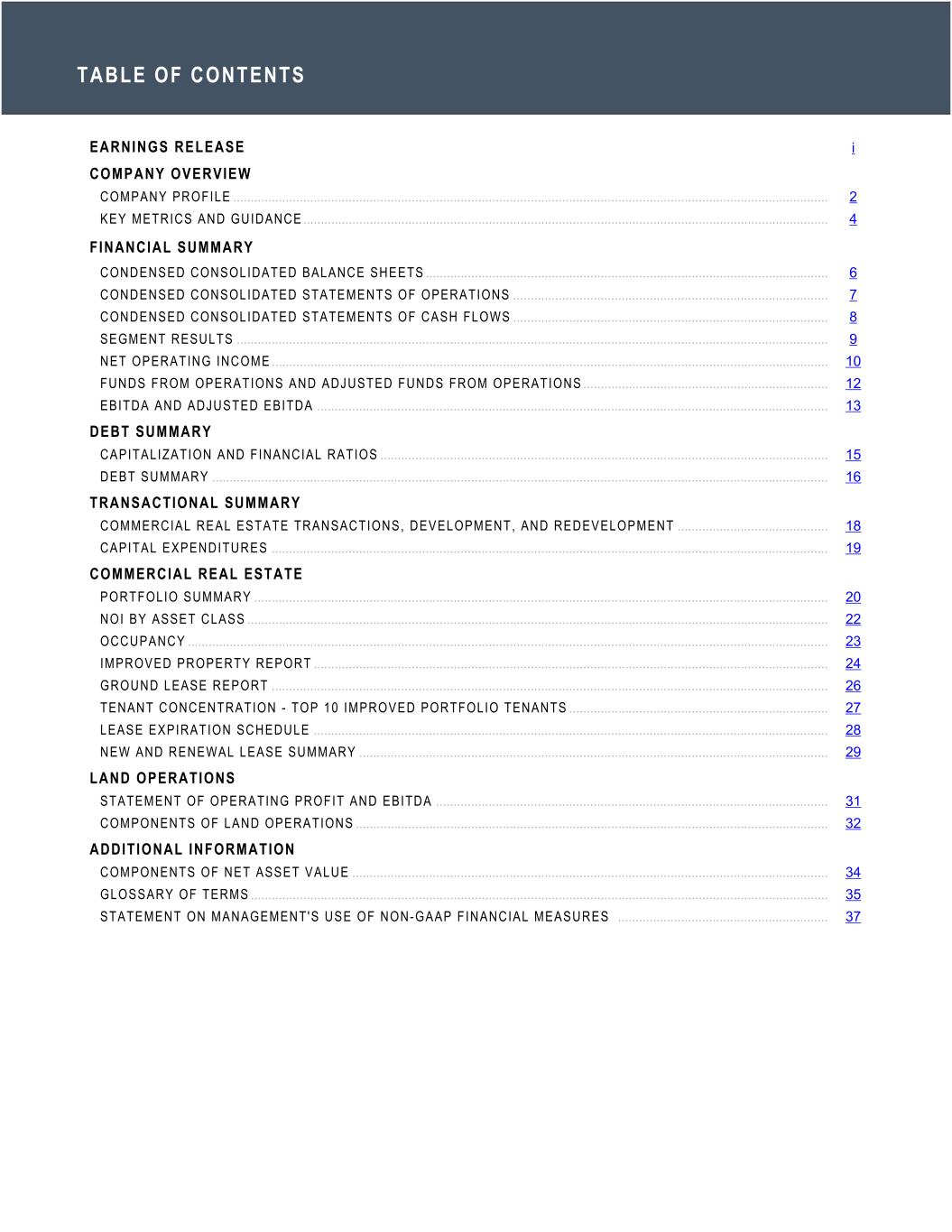 目录收益发布i公司概览公司概况......................................................................................................................................................................2个关键指标和指引......................................................................................................................................................4个财务摘要简明合并资产负债表....................................................................................................6个简明合并经营报表....................................................................................7个现金流量表简明合并报表.......................................................................................................8分部业绩........................................................................................................................。T,和再开发...................................................................18项资本支出.................................................................................................................................................... 19商业房地产投资组合概要.......................................................................................................................................20按资产类别划分的NOI....................................................................................................................................................................................22占用情况....................................................................................................................................................................23改善后的物业报告....................................................................................................................24地租报告....................................................................................................26租户集中-改善后的投资组合租户前10名.....................32资产净值的新增信息构成部分......................................................................................................................34项术语汇总表.......................................................................................................................................................35关于管理层使用非公认会计准则财务措施的说明.......................................................37