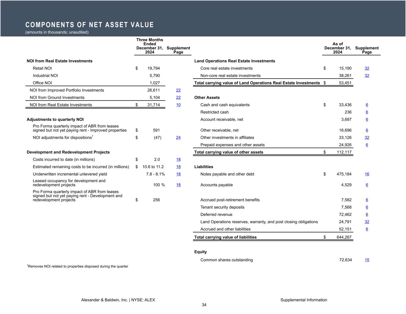 资产净值构成部分(金额以千为单位;未经审计)截至2024年12月31日止三个月补充页截至12月31日,2024年补充页NOI来自房地产投资土地运营房地产投资零售NOI 19,794美元核心房地产投资15,19032美元工业NOI 5,790非核心房地产投资38,26132办公室NOI 1,027土地运营房地产投资总账面价值53,451美元NOI来自改善的投资组合26,61122 NOI来自地面投资5,10422其他资产NOI来自房地产投资31,71410美元现金和现金等价物33,4366美元受限现金2366调整季度NOI应收账款,净额3,6976 ABR的预估季度影响来自已签订但尚未支付租金的租约-改善后的物业591美元其他应收款,净额16,6966处置的NOI调整1 $(47)24对关联公司的其他投资33,12632预付费用和其他资产24,9266开发和再开发项目其他资产的总账面价值112,117美元迄今已发生的成本(百万美元)2.018估计将发生的剩余成本(百万美元)10.6至11.218负债承保的增量无杠杆收益率7.8-8.1 % 18应付票据和其他债务475,18416开发的租赁占用和再开发项目100% 18应付账款4,5296 ABR对已签订但尚未支付租金的租赁的备考季度影响-开发和再开发项目256美元应计退休后福利7,5826租户保证金7,5686递延收入72,4626土地运营准备金、保修和结账后义务24,79132应计和其他负债52,1516负债账面价值总额644,267美元已发行普通股权益72,634151去除与本季度处置的物业相关的NOI Alexander & Baldwin, Inc. |纽约证券交易所代码:ALEX补充信息34