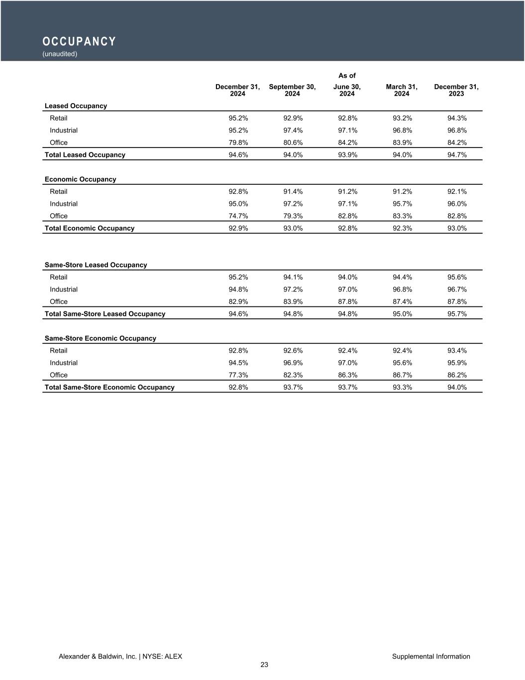 占用情况(未经审计)截至2024年12月31日2024年9月30日2024年6月30日2024年3月31日2024年12月31日,2023租赁占用零售95.2% 92.9% 92.8% 93.2% 94.3%工业95.2% 97.4% 97.1% 96.8% 96.8%办公79.8% 80.6% 84.2% 83.9% 84.2%租赁占用总量94.6% 94.0% 93.9% 94.0% 94.7%经济占用零售92.8% 91.4% 91.2% 92.1%工业95.0% 97.2% 97.1% 95.7% 96.0%办公74.7% 79.3% 82.8% 83.3% 82.8%经济占用总量92.9% 93.0% 92.8% 92.3% 93.0%同店租赁占用零售95.2% 94.1% 94.0% 94.4% 95.6%工业94.8% 97.2% 97.0% 96.8% 96.7%办公82.9% 83.9% 87.8% 87.8%95.6% 95.9%办公77.3% 82.3% 86.3% 86.7% 86.2%同店经济占用总额92.8% 93.7% 93.7% 93.3% 94.0% Alexander & Baldwin, Inc. | NYSE:ALEX补充信息23