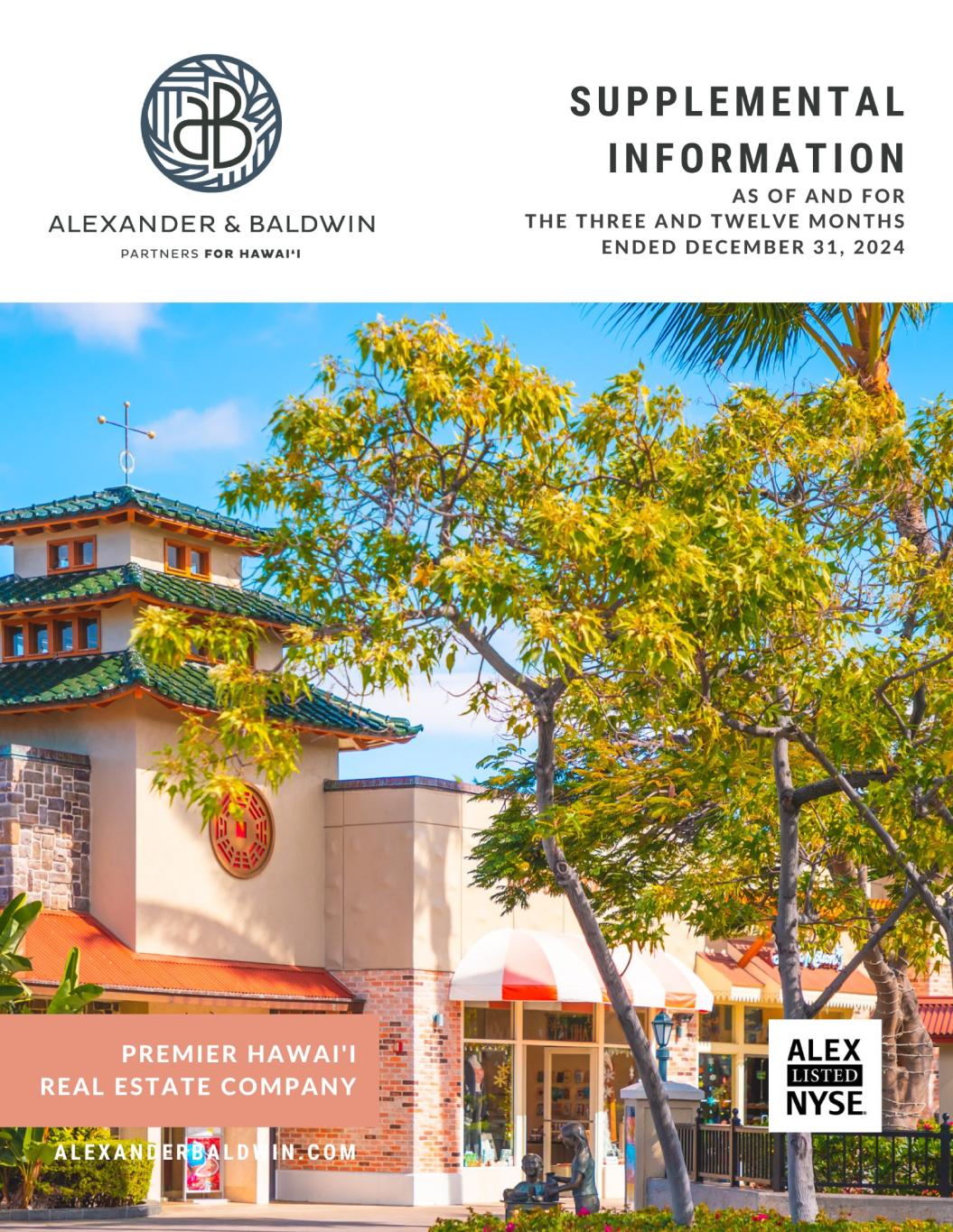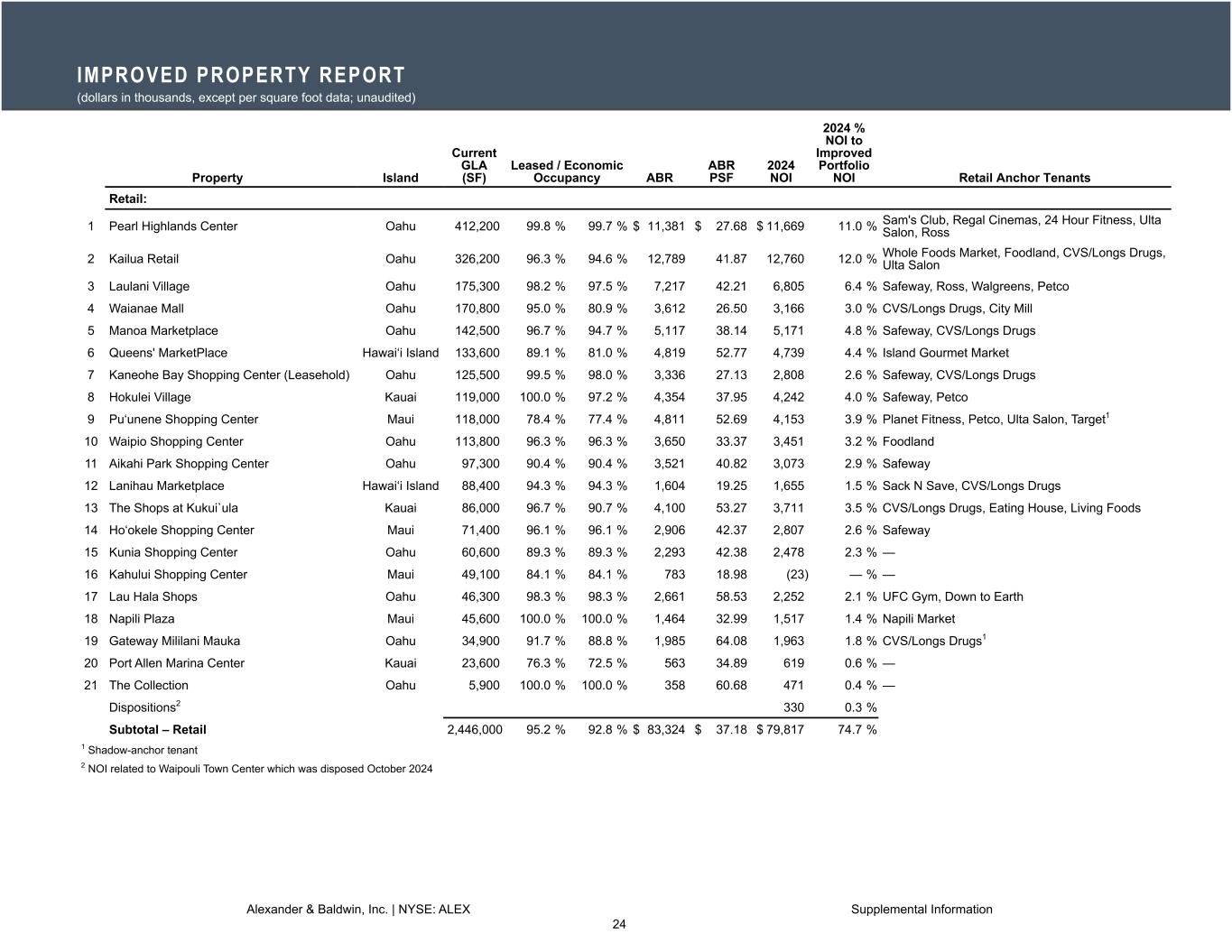 改进的财产报告(以千美元计,每平方英尺数据除外;未经审计)零售:1珍珠高地中心瓦胡岛412,20099.8% 99.7% $ 11,381 $ 27.68 $ 11,66911.0%山姆会员店、富豪电影院、24小时健身、Ulta沙龙、Ross 2 Kailua零售瓦胡岛326,20096.3% 94.6% 12,78941.87 12,76012.0% 全食超市、Foodland、CVS/Longs Drugs、Ulta Salon 3 Laurani Village Oahu 175,30098.2% 97.5% 7,21742.216,8056.4% Safeway,Ross,Walgreens,Petco 4 Waianae Mall Oahu 170,80095.0% 80.9% 3,61226.503,1663.0%City Mill 5 Manoa MarketPlace Oahu 142,50096.7% 94.7% 5,11738.145,1714.8% Safeway,CVS/Longs Drugs 6 Queens‘MarketPlace Hawai’i Island 133,60089.1% 81.0% 4,81952.774,7394.4% Island Gourmet Market 7 Kaneohe Bay Shopping Center(leasehold)Oahu 125,50099.5% 98.0% 3,33627.13 2,8082.6% Safeway,CVS/Longs Drugs 8 Hokulei Village Kauai 119,000100.0% 97.2% 4,35437.954,2424.0% Safeway,Petco 9 Pu'unene Shopping Center Maui 118,00078.4% 77.4% 4,81152.694,1533.9% 星球健身,PetTarget110 Waipio购物中心Oahu 113,80096.3% 96.3% 3,65033.373,4513.2% Foodland 11 Aikahi Park购物中心Oahu 97,30090.4% 90.4% 3,52140.82 3,0732.9% Safeway 12 Lanihau Marketplace Hawai'i Island 88,40094.3% 94.3% 1,60419.251,6551.5% Sack N Save,CVS丨/long drugs 13 the shops at Kukui ` ula Kauai 86,00096.7% 90.7% 4,10053.273,7113.5%丨CAVS丨/long drugs,eating house,Living Foods 14 Ho‘okele购物中心毛伊岛71,40096.1% 96.1% 2,90642.372,8072.6% Safeway 15 Kunia购物中心瓦胡岛60,60089.3% 89.3% 2,29342.382,478 2.3% — 16 Kahului购物中心毛伊岛49,10084.1% 84.1% 78318.98(23)—% — 17 Lau Hala Shops Oahu 46,30098.3% 98.3% 98.3% 2,66158.53 2,2522.1% UFC健身房,脚踏实地18 Napili Plaza Maui 45,600100.0% 100.0% 1,46432.991,5171.4% Napili Market 19 Gateway Mililani Mauka Oahu 34,90091.7% 88.8% 1,98564.081,9631.8% CVS/Longs Drugs120 Port Allen Marina Center Kauai 23,60076.3% 72.5% 56334.89 6190.6% — 21 The Collection Oahu 5,900100.0% 100.0% 35860.68 4710.4% — Dispositions23300.3%小计–零售2,446,00095.2% 92.8% $ 83,324 $ 37.18 $ 79,81774.7% 1 Shadow-anchor tenant 2 NOI related to Waipouli Town Center which was2024年10月出售Property Island当前GLA(SF)租赁/经济占用ABR ABR PSF 2024 NOI 2024% NOI以改善投资组合NOI零售锚定租户Alexander & Baldwin, Inc. | NYSE:ALEX补充信息24