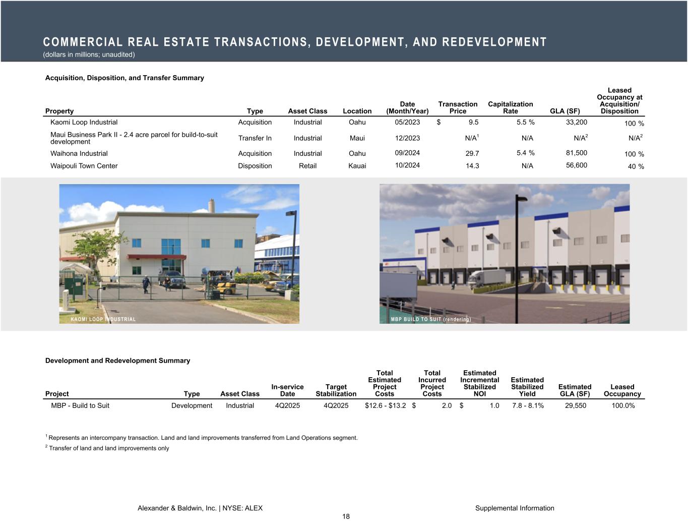 商业房地产交易、开发、再开发(百万美元;未经审计)收购、处置、和转让摘要物业类型资产类别地点日期(月/年)交易价格资本化率GLA(SF)收购/处置时租赁占用KAOMI Loop Industrial Acquisition Industrial Oahu 05/2023 $ 9.5 5.5% 33,200100% Maui Business Park II-2.4英亩地块,用于在Industrial Maui进行定制开发转让12/2023 N/A1 N/A N/A2 N/A2 Waihona Industrial Acquisition Industrial Oahu 09/202429.75.4% 81,500100% Waipouli Town Center Disposition Retail Kauai 10/202414.3 N/A 56,60040% Development和重建摘要项目类型资产类别在役日期目标稳定总估计项目成本总已发生项目成本估计增量稳定NOI估计稳定收益率估计GLA(SF)租赁占用MBP-建造以适应发展工业4Q2025 4Q2025 $ 12.6-$ 13.2 $ 2.0 $ 1.07.8-8.1% 29,550100.0% 1代表公司间交易。土地营运分部转自的土地及土地改良。2转让土地和土地改良仅Alexander & Baldwin, Inc. | NYSE:ALEX补充资料18 KAOMI Loop Industrial MBP Build to SUIT(render ing)