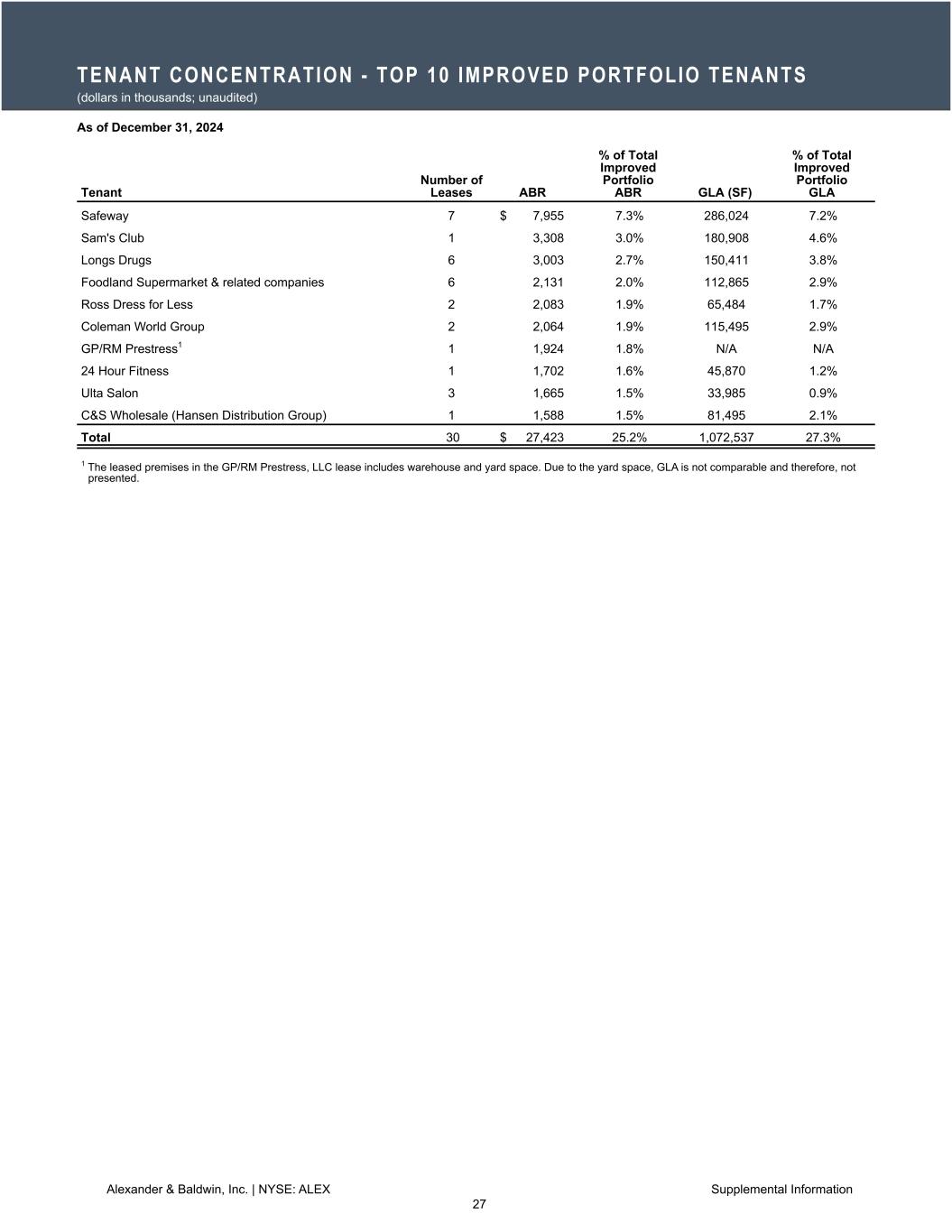 租户集中-截至12月31日,排名前10的改善投资组合租户(单位:千美元;未经审计),2024年租户租赁数量ABR占总改善投资组合的百分比ABR GLA(SF)占总改善投资组合的百分比GLA Safeway 7 $ 7,9557.3% 286,0247.2%山姆会员店13,3083.0% 180,9084.6% Longs Drugs 63,0032.7% 150,4113.8% Foodland Supermarket & related companies 62,1312.0% 112,8652.9% Ross DressFor less 22,0831.9% 65,4841.7% Coleman World Group 22,0641.9% 115,4952.9% GP/RM Prestress11,9241.8% N/A N/A 24小时健身11,7021.6% 45,8701.2% Ulta Salon 31,6651.5% 33,9850.9% C & S Wholesale(Hansen Distribution Group)11,5881.5% 81,4952.1% Total 30 $ 27,42325.2% 1,072,53727.3% 1 GP/RM Prestress,LLC租赁中的租赁房地包括仓库和堆场空间。由于院子空间的原因,GLA不具有可比性,因此,不呈现。Alexander & Baldwin, Inc. | NYSE:ALEX补充信息27