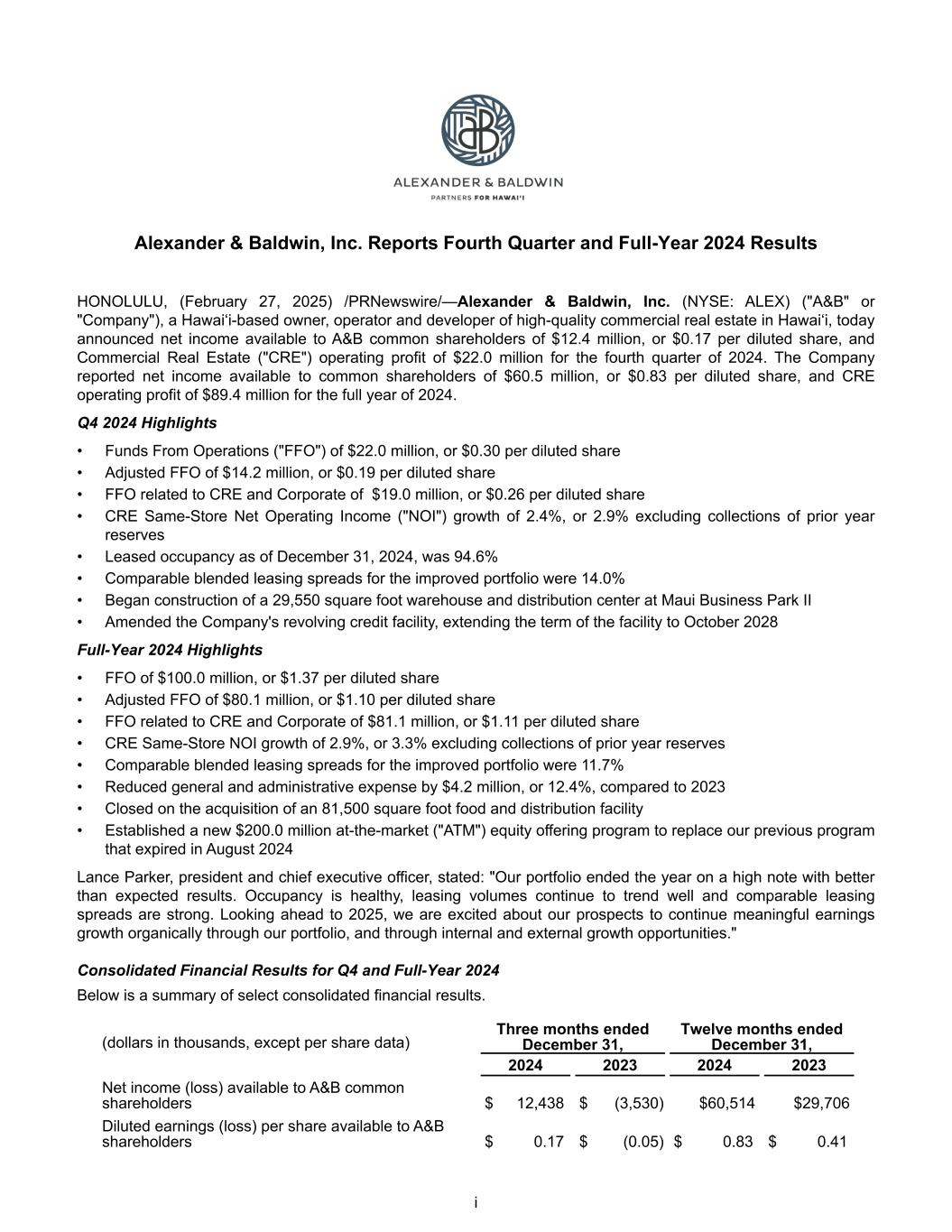 Alexander & Baldwin, Inc.公布2024年第四季度和全年业绩HONOLULU,(2025年2月27日)/美通社/— Alexander & Baldwin, Inc.(NYSE:ALEX)(“A & B”或“公司”)是一家位于夏威夷的夏威夷优质商业地产的所有者、运营商和开发商,该公司今天宣布,2024年第四季度A & B普通股股东可获得的净收入为1240万美元,即稀释后每股收益0.17美元,商业地产(“CRE”)的营业利润为2200万美元。该公司公布的2024年全年普通股股东可获得的净收入为6050万美元,合稀释后每股0.83美元,CRE营业利润为8940万美元。2024年第四季度亮点•运营资金(“FFO”)为2200万美元,或稀释后每股0.30美元•调整后FFO为1420万美元,或稀释后每股0.19美元•与CRE和企业相关的FFO为1900万美元,或稀释后每股0.26美元• CRE同店净营业收入(“NOI”)增长2.4%,或2.9%,不包括上一年储备的收款•截至2024年12月31日的租赁入住率,为94.6% •改善后的投资组合的可比混合租赁利差为14.0% •开始在毛伊岛商业园II建造一个29,550平方英尺的仓库和配送中心•修订了公司的循环信贷额度,将贷款期限延长至2028年10月2024年全年亮点• FFO为1.00亿美元,或稀释后每股1.37美元•调整后FFO为8010万美元,或稀释后每股1.10美元•与CRE和Corporate相关的FFO为8110万美元,或稀释后每股1.11美元• CRE同店NOI增长2.9%,或3.3%,不包括上一年储备的收款•改进后的投资组合的可比混合租赁价差为11.7% •与2023年相比,一般和行政费用减少了420万美元,即12.4% •完成了对81,500平方英尺食品和分销设施的收购•建立了一个新的2亿美元的市场上(“ATM”)股票发行计划,以取代我们在2024年8月到期的先前计划,总裁兼首席执行官兰斯·帕克表示:“我们的投资组合在今年结束时表现出色,业绩好于预期。入住率健康,租赁量继续保持良好趋势,可比租赁利差强劲。展望2025年,我们对通过我们的投资组合,以及通过内部和外部增长机会,继续有机地实现有意义的盈利增长的前景感到兴奋。”以下是选定的合并财务业绩摘要,其中包括第四季度和2024年全年的合并财务业绩。(单位:千美元,每股数据除外)截至12月31日的三个月,截至2024年12月31日的十二个月202320242023 A & B普通股股东可获得的净收入(亏损)$ 12,438 $(3,530)$ 60,514 $ 29,706 A & B股东可获得的稀释每股收益(亏损)$ 0.17 $(0.05)$ 0.83 $ 0.41 i