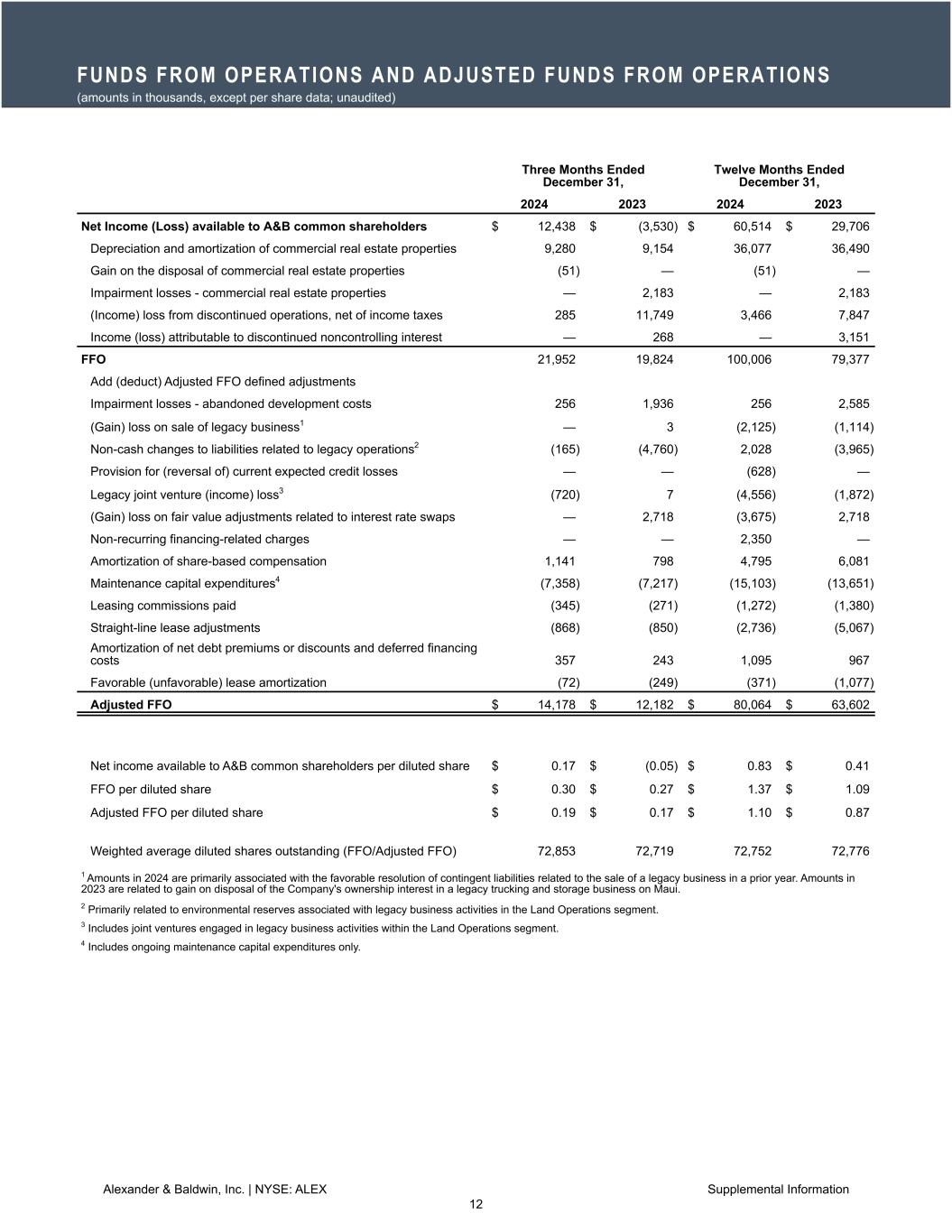 来自运营的资金和调整后的运营资金(金额以千为单位,每股数据除外;未经审计)截至12月31日的三个月,截至2024年12月31日的十二个月202320242023 A & B普通股股东可获得的净收入(亏损)$ 12,438 $(3,530)$ 60,514 $ 29,706商业房地产物业折旧和摊销9,2809,15436,07736,490商业房地产物业处置收益(51)—(51)—减值损失-商业房地产物业— 2,183 — 2,183(收入)终止经营损失,扣除所得税后28511,7493,4667,847归属于已终止非控股权益的收入(亏损)— 268 — 3,151 FFO 21,95219,824100,00679,377加(减)调整后FFO定义调整减值损失-放弃开发成本2561,9362562,585(收益)出售遗留业务的损失1 — 3(2,125)(1,114)与遗留业务相关的负债的非现金变动2(165)(4,760)2,028(3,965)拨备为(转回)当期预期信用损失——(628)—遗留合营企业(收益)损失3(720)7(4,556)(1,872)(收益)与利率掉期相关的公允价值调整损失— 2,718(3,675)2,718非经常性融资相关费用—— 2,350 —股份补偿摊销1,1417984,7956,081维持资本支出4(7,358)(7,217)(15,103)(13,651)支付的租赁佣金(345)(271)(1,272)(1,380)直线租赁调整(868)(850)(2,736)(5,067)净负债溢价或折价摊销和递延融资成本3572431,095967有利(不利)租赁摊销(72)(249)(371)(1,077)调整后FFO $ 14,178 $ 12,182 $ 80,064 $ 63,602 A & B普通股股东可获得的每股摊薄收益$ 0.17 $(0.05)$ 0.83 $ 0.41 FFO每股摊薄收益$ 0.30 $ 0.27 $ 1.37 $ 1.09调整后FFO每股摊薄收益$ 0.19 $ 0.17 $ 1.10 $ 0.87加权平均摊薄流通股(FFO/调整后FFO)72,85372,71972,75272,7761 2024年的金额主要与有利解决与出售A前一年的遗留业务。2023年的金额与处置公司在毛伊岛遗留卡车运输和仓储业务的所有权权益的收益有关。2主要涉及与土地运营部门遗留业务活动相关的环境储备。3包括在土地运营部门内从事遗留业务活动的合资企业。4仅包括持续维护资本支出。Alexander & Baldwin, Inc. | NYSE:ALEX补充信息12