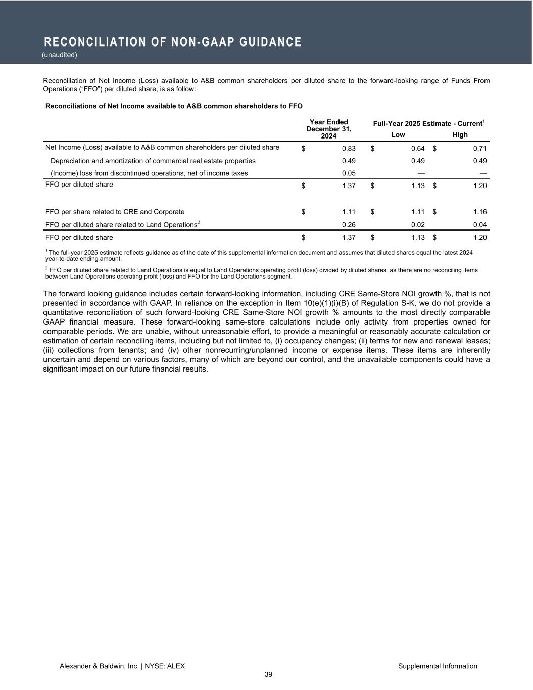 非公认会计准则准则对账(未经审计)A & B普通股股东可获得的每股摊薄净收益(亏损)与每股摊薄收益的前瞻性运营资金(“FFO”)范围的对账如下:A & B普通股股东可获得的净收入与截至2024年12月31日止年度的FFO的对账2025年全年估计-当前1 A & B普通股股东可获得的每股摊薄净收益(亏损)0.83美元0.64美元0.71美元商业房地产物业的折旧和摊销0.49 0.49 0.49(收入)终止经营的亏损,扣除所得税0.05 ——与CRE和企业相关的每股FFO 1.37美元1.13美元1.20美元与CRE和企业相关的每股FFO 1.11美元1.11美元1.16美元与土地运营相关的每股摊薄FFO 20.26 0.02 0.04每股摊薄后的FFO 1.37美元1.13美元1.20 1 2025年全年估计数反映了截至本补充信息文件日期的指导,并假设稀释后的股份等于最新的2024年年初至今期末金额。与土地运营相关的每股摊薄FFO为2,等于土地运营运营利润(亏损)除以稀释后的股份,因为土地运营部门的土地运营运营利润(亏损)与FFO之间没有调节项目。前瞻性指引包括某些前瞻性信息,包括CRE同店NOI增长%,这些信息不是按照公认会计原则提出的。根据S-K条例第10(e)(1)(i)(b)项中的例外情况,我们没有提供此类前瞻性CRE同店NOI增长%与最直接可比的GAAP财务指标的数量对账。这些前瞻性的同店计算仅包括可比期间所拥有物业的活动。如无不合理的努力,我们无法就某些调节项目提供有意义或合理准确的计算或估计,包括但不限于:(i)占用变化;(ii)新租约和续租租约的条款;(iii)向租户收取款项;以及(iv)其他非经常性/非计划收入或支出项目。这些项目本质上是不确定的,取决于各种因素,其中许多因素超出了我们的控制范围,无法获得的组成部分可能会对我们未来的财务业绩产生重大影响。Alexander & Baldwin, Inc. | NYSE:ALEX补充信息39