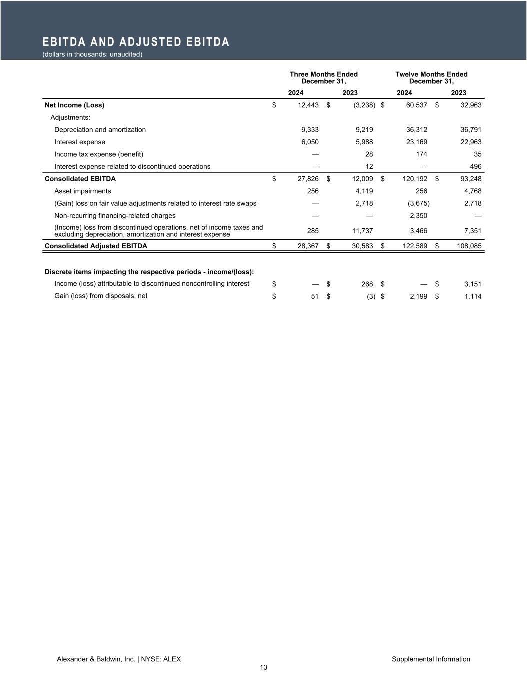 EBITDA和调整后EBITDA(千美元;未经审计)截至12月31日的三个月,截至12月31日的十二个月,2024202320242023净收益(亏损)$ 12,443 $(3,238)$ 60,537 $ 32,963调整:折旧和摊销9,3339,21936,31236,791利息支出6,0505,98823,16922,963所得税支出(收益)— 2817435与终止经营相关的利息支出— 12 — 496合并EBITDA $ 27,826 $ 12,009 $ 120,192 $ 93,248资产减值2564,1192564,768(收益)与利率掉期相关的公允价值调整损失— 2,718(3,675)2,718与非经常性融资相关的费用—— 2,350 —(收入)终止经营的亏损,扣除所得税,不包括折旧,摊销和利息费用28511,7373,4667,351合并调整后EBITDA 28,367美元30,583美元122,589美元108,085美元影响相应期间的离散项目-收入/(亏损):归属于已终止非控股权益的收入(亏损)$ — 268美元— 3,151美元处置收益(亏损),净额51美元(3)2,199美元1,114美元Alexander & Baldwin, Inc. |纽约证券交易所:ALEX补充信息13