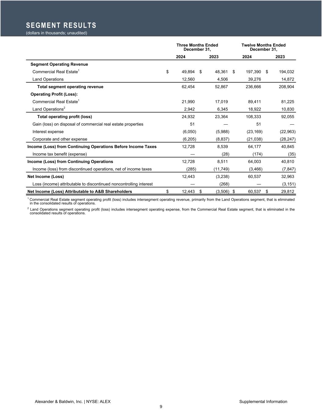 分部业绩(千美元;未经审计)截至12月31日止三个月,截至12月31日止十二个月,2024202320242023分部营业收入商业地产1 $ 49,894 $ 48,361 $ 197,390 $ 194,032土地经营12,5604,50639,27614,872分部营业总收入62,45452,867236,666208,904营业利润(亏损):商业地产1 21,99017,01989,41181,225土地经营22,9426,34518,92210,830总营业利润(亏损)24,93223,364108,33392,055处置商业地产收益(亏损)51 — 51 —利息支出(6,050)(5,988)(23,169)(22,963)公司及其他费用(6,205)(8,837)(21,038)(28,247)所得税前持续经营收入(亏损)12,7288,53964,17740,845所得税收益(费用)—(28)(174)(35)持续经营收入(亏损)12,7288,51164,00340,810终止经营收入(亏损),扣除所得税(285)(11,749)(3,466)(7,847)净收益(亏损)12,443(3,238)60,53732,963归属于已终止非控股权益的亏损(收入)—(268)—(3,151)归属于A & B股东的净利润(亏损)$ 12,443 $(3,506)$ 60,537 $ 29,8121商业地产分部营业利润(主要来自土地运营部门,这在综合运营业绩中被剔除。2土地经营分部经营利润(亏损)包括来自商业地产分部的分部间经营费用,该费用在综合经营业绩中消除。Alexander & Baldwin, Inc. | NYSE:ALEX补充信息9