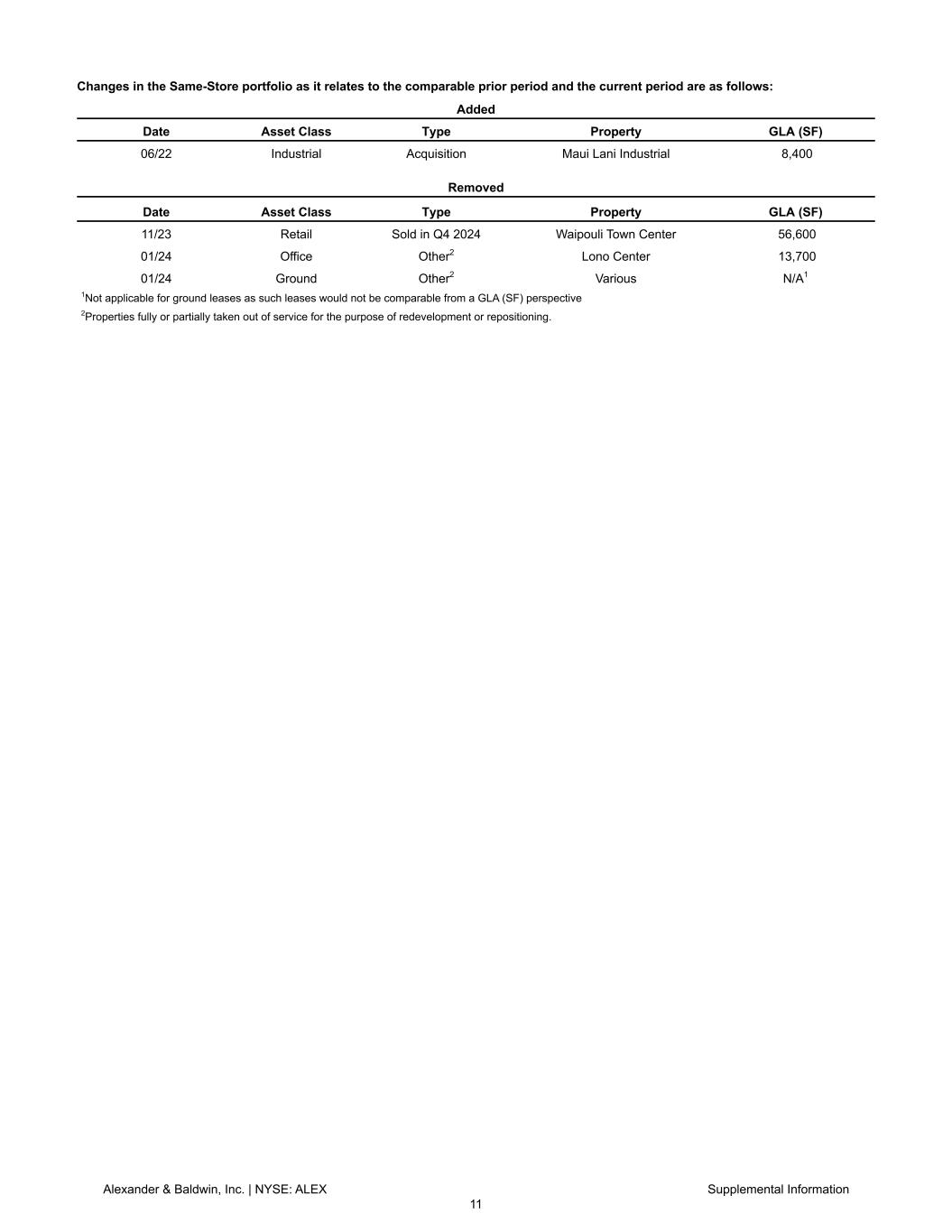 与可比的上一期间和本期相关的同店组合变化如下:新增日期资产类别类型物业GLA(SF)06/22工业收购Maui Lani Industrial 8,400移除日期资产类别类型物业GLA(SF)11/23 2024年Q4出售的零售外埔里镇中心56,60001/24办公室其他2 Lono中心13,7001/24地面其他2各种N/A1 1不适用于地面租赁,因为从GLA(SF)的角度来看,此类租赁不具有可比性2为重建或重新定位目的全部或部分停止服务的物业。Alexander & Baldwin, Inc. | NYSE:ALEX补充信息11