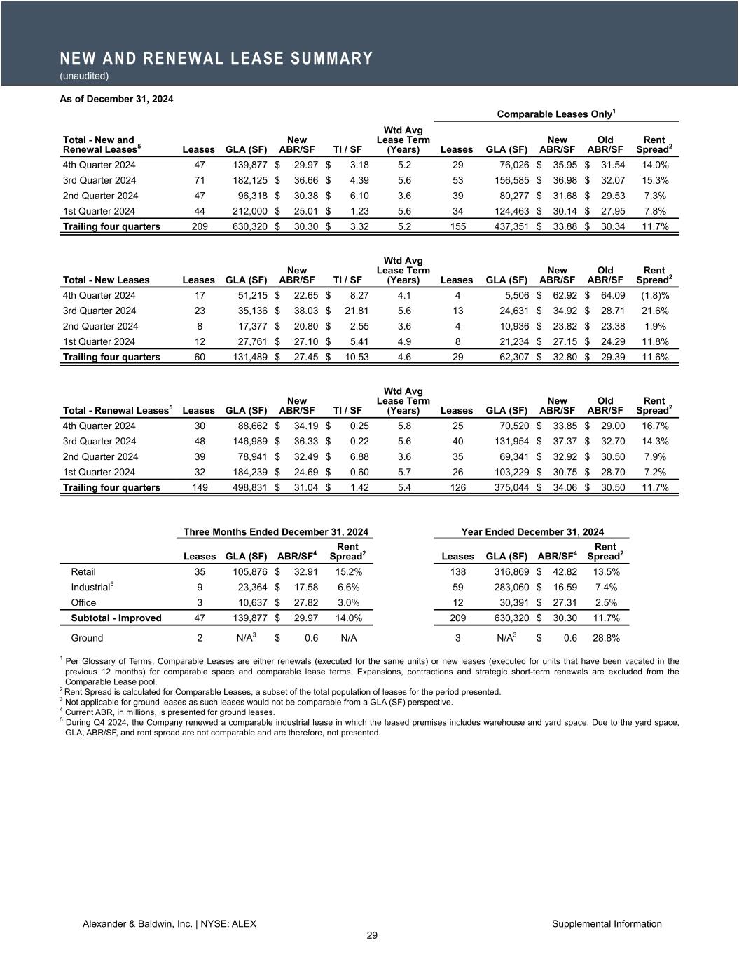 截至12月31日的新租及续租租约概要(未经审核),仅2024年可比租赁1总计-新and Renewal Leases5 Leases GLA(SF)New ABR/SF TI/SF WTD Avg Lease Term(Years)Leases GLA(SF)New ABR/SF Old ABR/SF Rent Spread2 4th Quarter 202447139,877 $ 29.97 $ 3.185.22 976,026 $ 35.95 $ 31.54 14.0% 3rd Quarter 202471182,125 $ 36.66 $ 4.395.65 3156,585 $ 36.98 $ 32.07 15.3% 2nd Quarter 20244796,318 $ 30.38 $ 6.10 3.63980,277 $ 31.68 $ 29.5 37.3% 1st Quarter 202444212,000 $ 25.01 $ 1.235.63 4124,463 $$ 3.325.2155437,351 $ 33.88 $ 30.34 11.7% total-new leases leases GLA(SF)new ABR/SF TI/SF WTD avg lease term(years)leases GLA(SF)new ABR/SF old ABR/SF rent spread2 4th Quarter 20241751,215 $ 22.65 $ 8.27 4.145,506 $ 62.92 $ 64.09(1.8)% 3rd Quarter 20242335,136 $ 38.03 $ 21.81 5.6 1324,631 $ 34.92 $ 28.71 21.6% 2nd Quarter 2024817,377 $ 20.80 $ 2.55 3.64 10,936 $ 23.82 $ 23.38 1.9% 1st Quarter 20241227$ 27.15 $ 24.29 11.8% trailing four quarters 60131,489 $ 27.45 $ 10.53 4.6 2962,307 $ 32.80 $ 29.39 11.6% total-renewal leases5 leases GLA(SF)new ABR/SF TI/SF WTD avg lease term(years)leases GLA(SF)new ABR/SF old ABR/SF rent spread2 Q4 20243088,662 $ 34.19 $ 0.255.8 2570,520 $ 33.85 $ 29.00 16.7% Q3 202448146,989 $ 36.33 $ 0.225.6 40131,954 $ 37.37 $ 32.70 14.3% Q2 20243978,941 $ 32.49 $ 6.88 3.63569,341 $ 32.92024年第一季度32184,239美元24.69美元0.605.7 26103,229美元30.75美元28.70 7.2%过去四个季度149498,831美元31.04美元1.425.4 126375,044美元34.06美元30.50美元11.7%截至2024年12月31日的三个月截至12月31日的三个月,2024 Leases GLA(SF)ABR/SF4 Rent Spread2 Leases GLA(SF)ABR/SF4 Rent Spread2 Retail 35105,876 $ 32.91 15.2% 138316,869 $ 42.82 13.5% Industrial5 923,364 $ 17.586.6% 59283,060 $ 16.59 7.4% Office 310,637 $ 27.82 3.0% 1230,391 $ 27.31 2.5%小计-改善47139,877 $ 29.97 14.0% 209630,320 $ 30.30 11.7% Ground 2 N/A3 $ 0.6 N/A3 N/A3 $ 0.628.8% 1每个术语表,可比租赁为续租(针对相同单元执行)或新租赁(针对过去12个月内已腾出的单元执行)的可比空间和可比租赁条款。可比租赁池中不包括扩张、收缩和战略性短期续租。2租金价差是针对可比租赁计算的,该租赁是所示期间租赁总数的子集。3不适用于地面租赁,因为从GLA(SF)的角度来看,这类租赁无法进行比较。4目前的ABR,以百万计,用于地面租赁。5在2024年第四季度,公司续签了一份可比的工业租赁,其中租赁的房地包括仓库和堆场空间。由于院子空间,GLA、ABR/SF、租金价差不具有可比性,因此,不呈现。Alexander & Baldwin, Inc. | NYSE:ALEX补充信息29