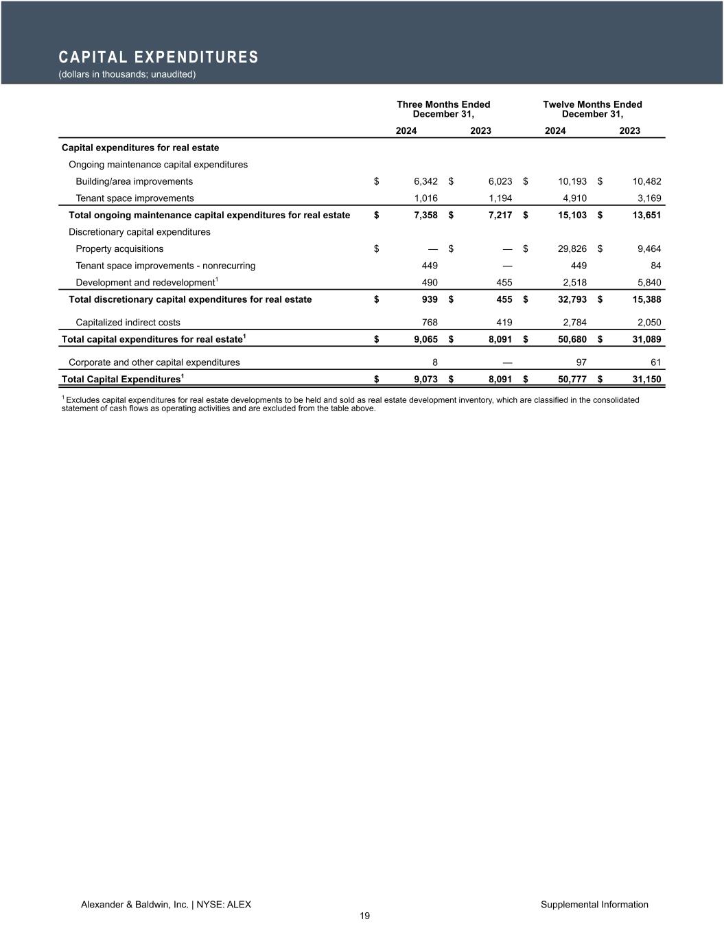 资本支出(千美元;未经审计)截至12月31日止三个月,截至12月31日止十二个月,2024202320242023房地产持续维护资本支出建筑/面积改善$ 6,342 $ 6,023 $ 10,193 $ 10,482租户空间改善1,0161,1944,9103,169房地产持续维护资本支出总额$ 7,358 $ 7,217 $ 15,103 $ 13,651可自由支配资本支出物业收购$ — $ — $ 29,826 $ 9,464租户空间改善-非经常性449 — 44984开发和再开发14904552,5185,840房地产可自由支配资本支出总额939美元455美元32,793美元15,388资本化间接成本768 4192,7842,050房地产资本支出总额1美元9,065美元8,091美元50,680美元31,089公司和其他资本支出8 — 9761资本支出总额1美元9,073美元8,091美元50,777美元31,150美元1不包括作为房地产开发库存而持有和出售的房地产开发的资本支出,在合并现金流量表中分类为经营活动的,不包括在上表中。Alexander & Baldwin, Inc. | NYSE:ALEX补充信息19