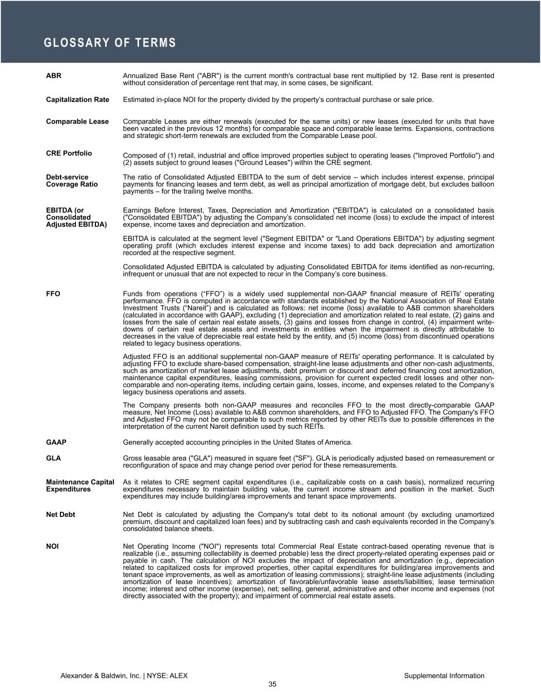 期限汇总表ABR年化基本租金(“ABR”)为当月合同基本租金乘以12。基本租金的列报没有考虑在某些情况下可能很重要的百分比租金。资本化率物业的估计到位NOI除以物业的合同购买或销售价格。可比租赁可比租赁是续租(针对相同单元执行)或新租赁(针对过去12个月内已腾出的单元执行),用于可比空间和可比租赁条款。可比租赁池中不包括扩张、收缩和战略性短期续租。CRE投资组合由CRE分部内的(1)受经营租赁约束的零售、工业和办公改善物业(“改善投资组合”)和(2)受地面租赁约束的资产(“地面租赁”)组成。偿债覆盖率过去12个月的合并调整后EBITDA与偿债总额的比率——包括利息支出、融资租赁和定期债务的本金支付,以及抵押债务的本金摊销,但不包括气球付款。EBITDA(或合并调整后EBITDA)利息、税项、折旧及摊销前利润(“EBITDA”)是在合并基础上(“合并EBITDA”)通过调整公司的合并净收益(亏损)以排除利息费用、所得税和折旧及摊销的影响而计算的。EBITDA是在分部层面(“分部EBITDA”或“土地运营EBITDA”)计算的,方法是调整分部营业利润(不包括利息费用和所得税),以加回在相应分部记录的折旧和摊销。合并调整后EBITDA的计算方法是对公司核心业务中预计不会再次发生的被确定为非经常性、不经常或不寻常项目的合并EBITDA进行调整。FFO运营资金(简称“FFO”)是REITs运营业绩的一种广泛使用的补充性非GAAP财务指标。FFO根据美国房地产投资信托协会(“Nareit”)制定的标准计算,计算如下:A & B普通股股东可获得的净收入(亏损)(按照公认会计原则计算),不包括(1)与房地产相关的折旧和摊销,(2)出售某些房地产资产的损益,(3)控制权变更的损益,(4)减值减记-当减值直接归因于实体持有的可折旧房地产价值下降时,某些房地产资产和对实体的投资,(5)与遗留业务运营相关的已终止经营业务的收入(亏损)。调整后的FFO是REITs经营业绩的额外补充非GAAP衡量标准。通过调整FFO计算得出,不包括以股份为基础的薪酬、直线租赁调整和其他非现金调整,例如市场租赁调整的摊销、债务溢价或折价和递延融资成本摊销、维持资本支出、租赁佣金、当期预期信用损失准备金和其他不可比和非经营性项目,包括与公司遗留业务运营和资产相关的某些收益、损失、收入和费用。该公司提出了非GAAP衡量标准,并将FFO与最直接可比的GAAP衡量标准、A & B普通股股东可获得的净收入(亏损)以及FFO与调整后的FFO进行了核对。公司的FFO和调整后的FFO可能无法与其他REITs报告的此类指标进行比较,原因是此类REITs使用的当前Nareit定义的解释可能存在差异。美国公认会计原则公认会计原则。GLA总可出租面积(“GLA”),单位为平方英尺(“SF”)。GLA根据空间的重新测量或重新配置进行定期调整,并且对于这些重新测量,可能会随着时间的推移而变化。维持性资本支出,因为它涉及CRE部门的资本支出(即以现金为基础的可资本化成本)、维持建筑价值所必需的正常化经常性支出、当前的收入流和在市场中的地位。此类支出可能包括建筑/面积改善和租户空间改善。净负债净负债的计算方法是将公司的总债务调整至其名义金额(不包括未摊销的溢价、贴现和资本化的贷款费用),并减去公司合并资产负债表中记录的现金和现金等价物。NOI净营业收入(“NOI”)指可变现的基于商业地产合同的营业收入总额(即 假设可收回性被认为是可能的)减去以现金支付或应付的直接与财产相关的运营费用。NOI的计算不包括折旧和摊销的影响(例如,与改善物业的资本化成本相关的折旧、用于建筑物/面积改善和租户空间改善的其他资本支出,以及租赁佣金的摊销);直线租赁调整(包括租赁奖励的摊销);有利/不利租赁资产/负债的摊销;租赁终止收入;利息和其他收入(费用),净额;销售、一般、行政和其他收入和费用(不与物业直接相关);以及商业房地产资产的减值。Alexander & Baldwin, Inc. | NYSE:ALEX补充信息35