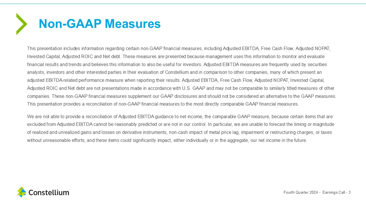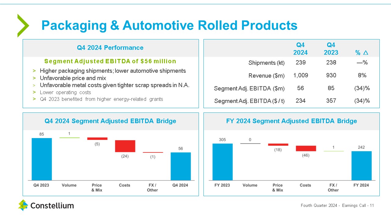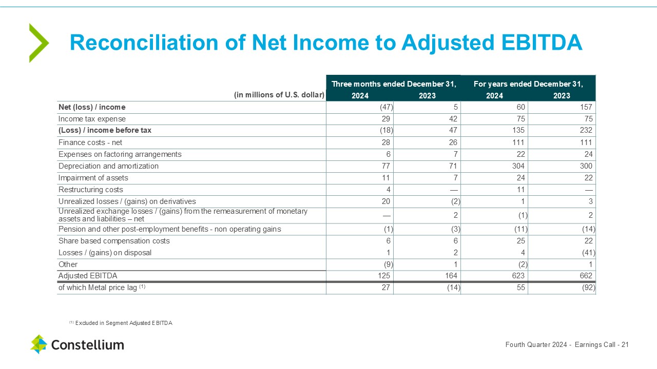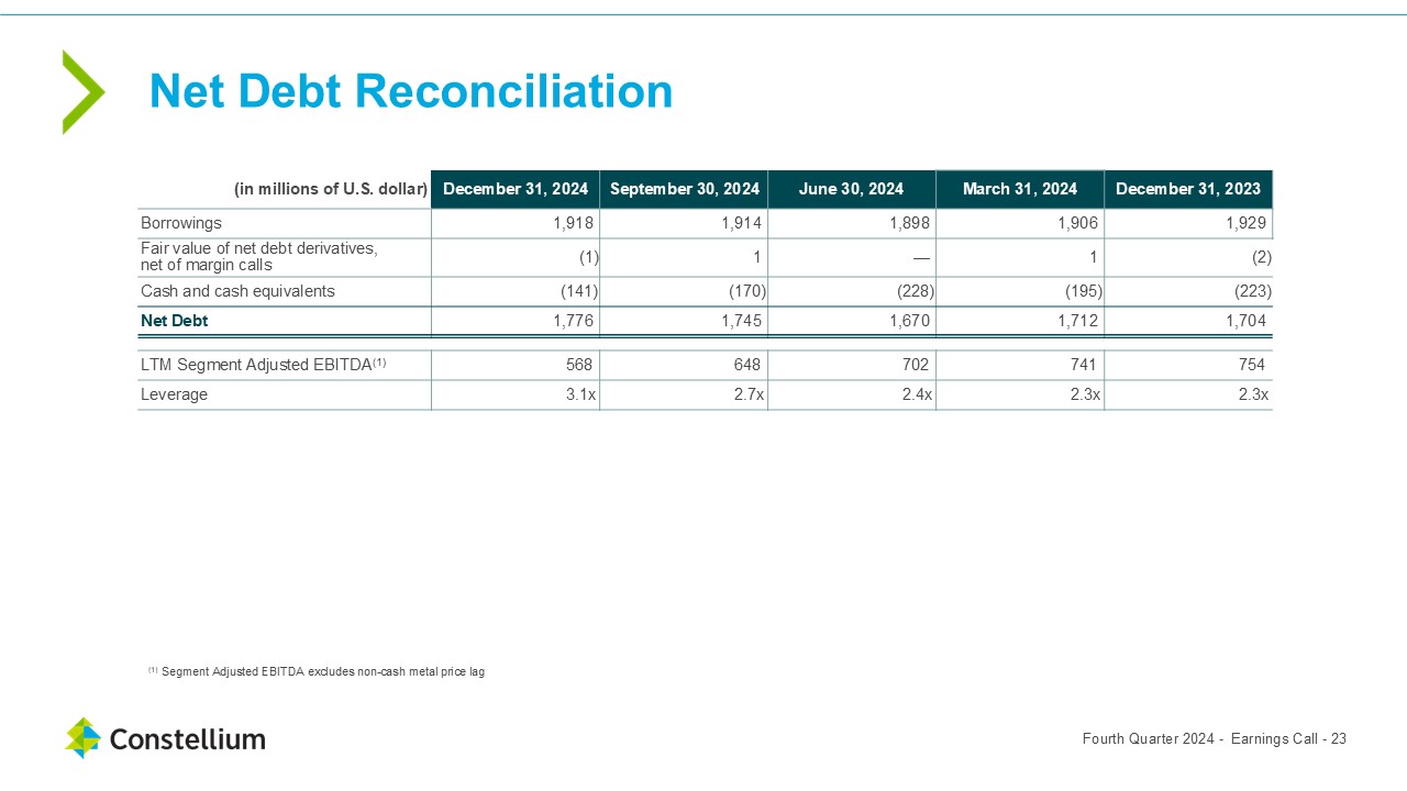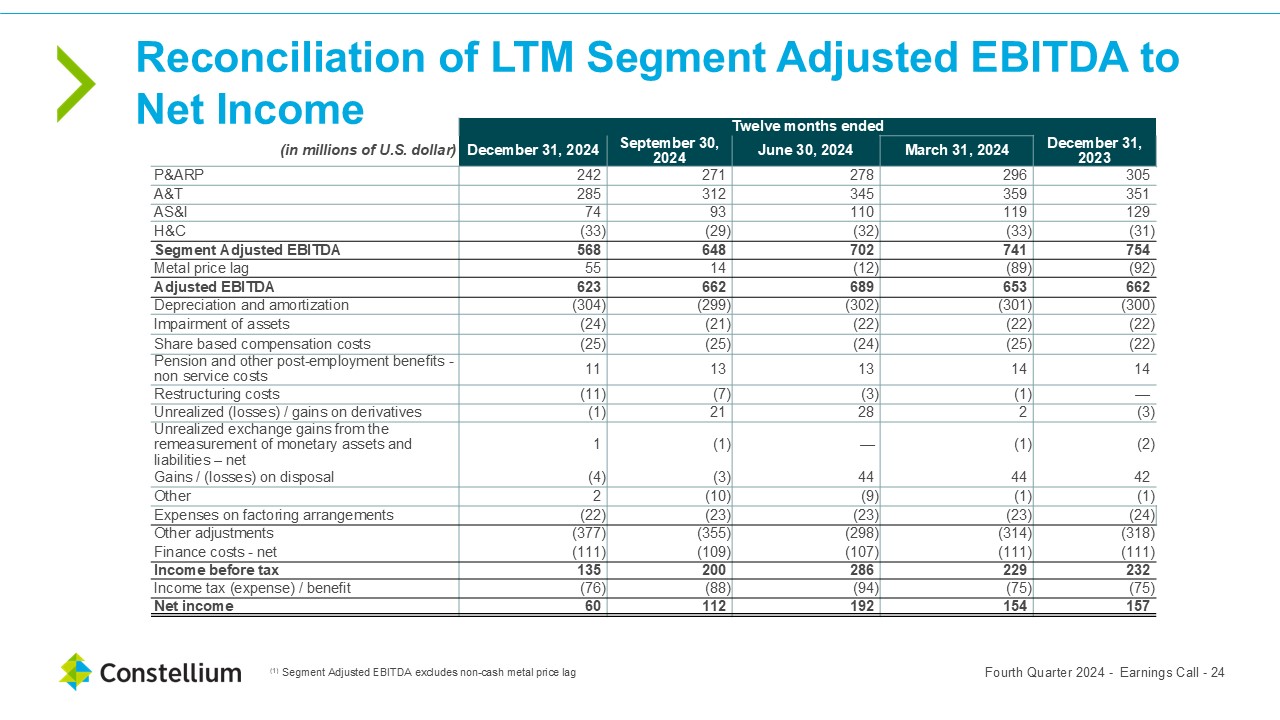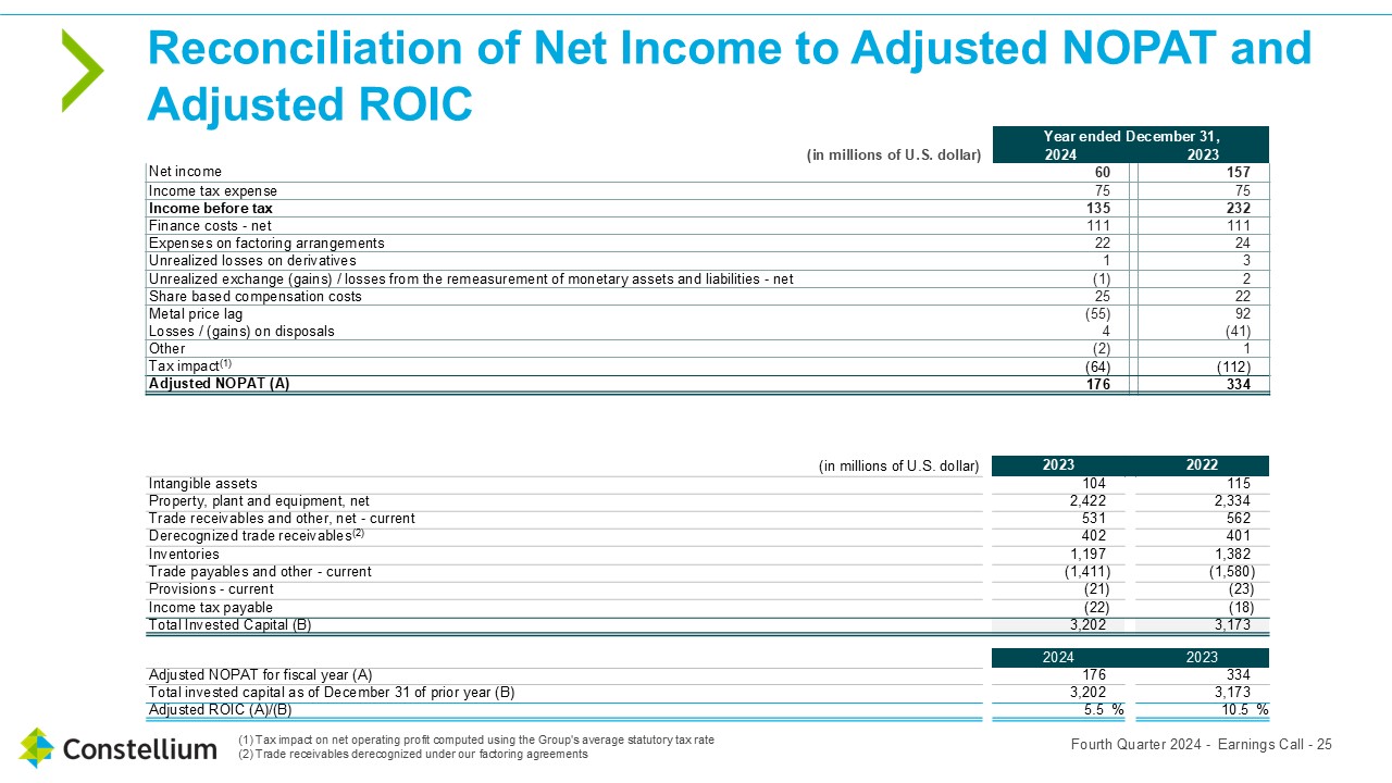 净收入与调整后NOPAT和调整后ROIC ≥ 130的对账2024年第四季度-财报电话会议-截至12月31日的25年,(百万美元)20242023净收入60157所得税费用7575税前收入135232财务成本-净额111111保理安排费用2224衍生工具未实现损失13重新计量货币资产和负债产生的未实现汇兑(收益)/损失-净额(1)2基于股份的补偿成本2522金属价格滞后(55)92处置损失/(收益)4(41)其他(2)1税收影响(1)(64)(112)调整后NOPAT(A)176334(百万美元)20232022无形资产104115财产,厂房及设备净额2,4222,334应收贸易账款及其他,净额-当期531562终止确认的贸易应收款项(2)402401存货1,1971,382贸易应付款项及其他-当期(1,411)(1,580)拨备-当期(21)(23)应付所得税(22)(18)总投资资本(b)3,2023,17320242023调整后的会计年度NOPAT(a)176334截至上一年度12月31日的总投资资本(b)3,2023,173调整后的ROIC(a)/(b)5.5% 10.5%(1)使用集团平均法定税率计算的对净营业利润的税务影响(2)根据我们的保理协议终止确认的贸易应收款项