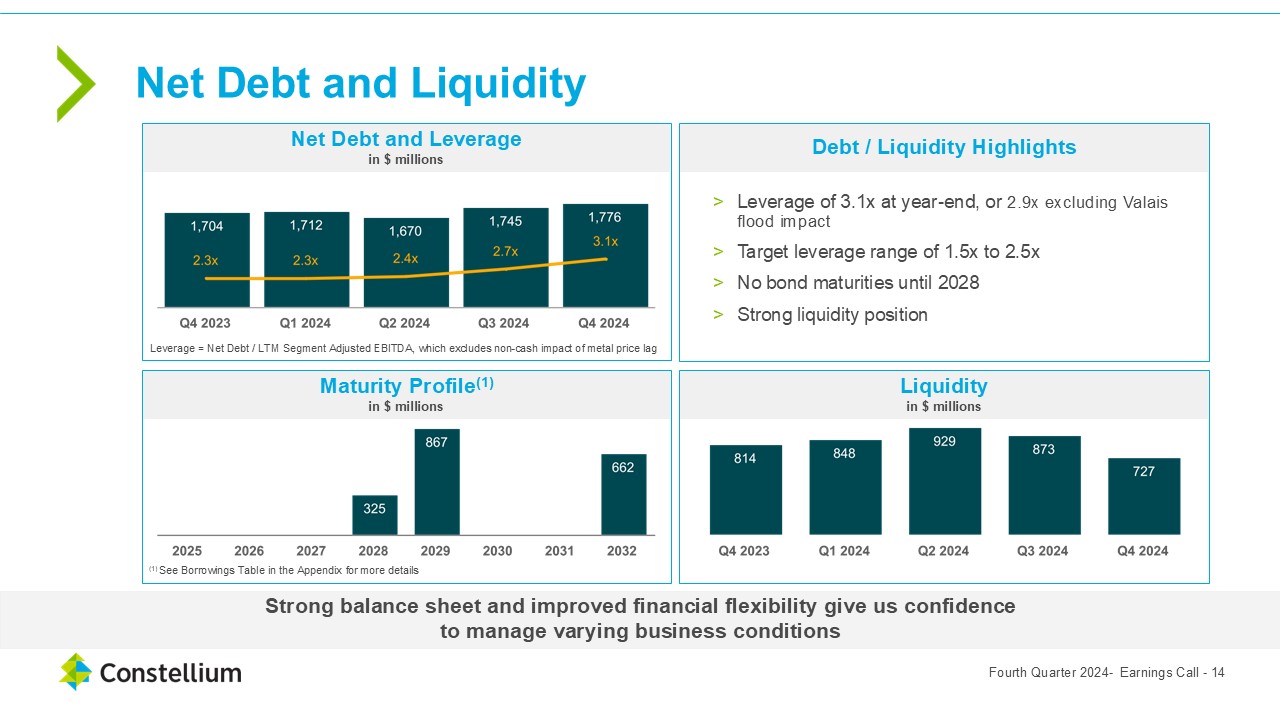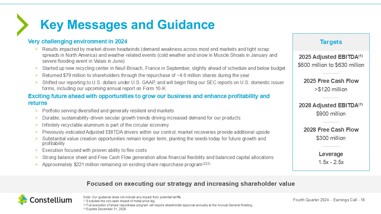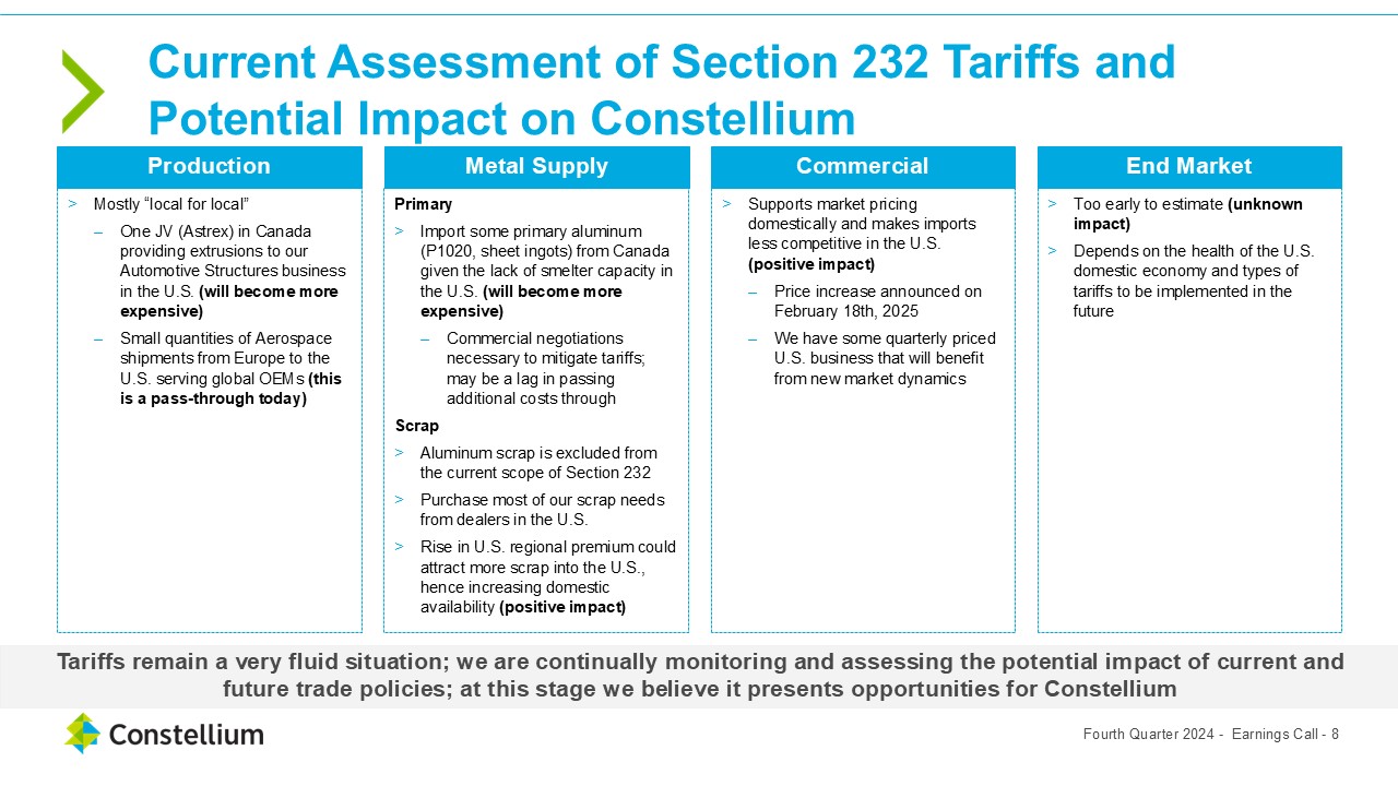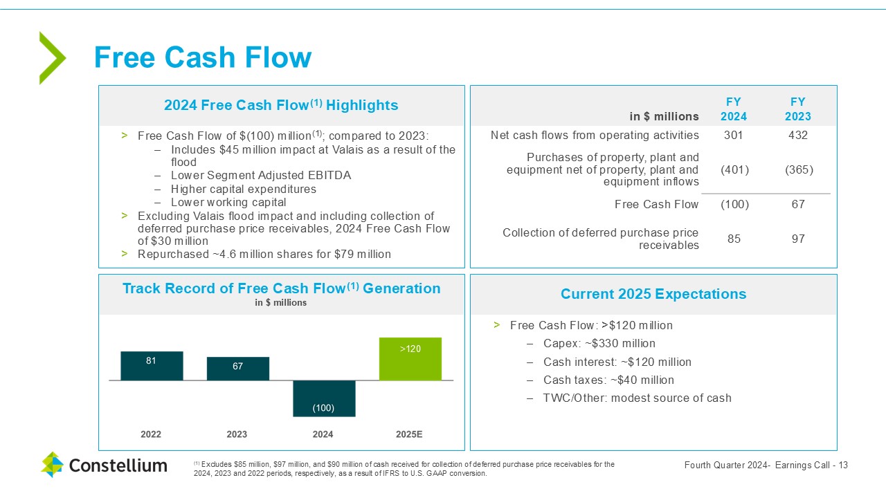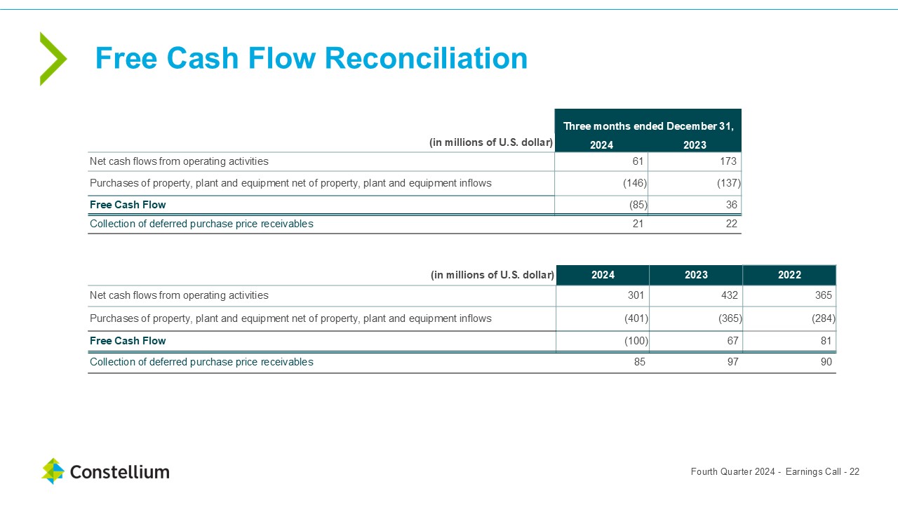 净收入与调整后NOPAT和调整后ROIC ≥ 130的对账2024年第四季度-财报电话会议-截至12月31日的25年,(百万美元)20242023净收入60157所得税费用7575税前收入135232财务成本-净额111111保理安排费用2224衍生工具未实现损失13重新计量货币资产和负债产生的未实现汇兑(收益)/损失-净额(1)2基于股份的补偿成本2522金属价格滞后(55)92处置损失/(收益)4(41)其他(2)1税收影响(1)(64)(112)调整后NOPAT(A)176334(百万美元)20232022无形资产104115财产,厂房及设备净额2,4222,334应收贸易账款及其他,净额-当期531562终止确认的贸易应收款项(2)402401存货1,1971,382贸易应付款项及其他-当期(1,411)(1,580)拨备-当期(21)(23)应付所得税(22)(18)总投资资本(b)3,2023,17320242023调整后的会计年度NOPAT(a)176334截至上一年度12月31日的总投资资本(b)3,2023,173调整后的ROIC(a)/(b)5.5% 10.5%(1)使用集团平均法定税率计算的对净营业利润的税务影响(2)根据我们的保理协议终止确认的贸易应收款项