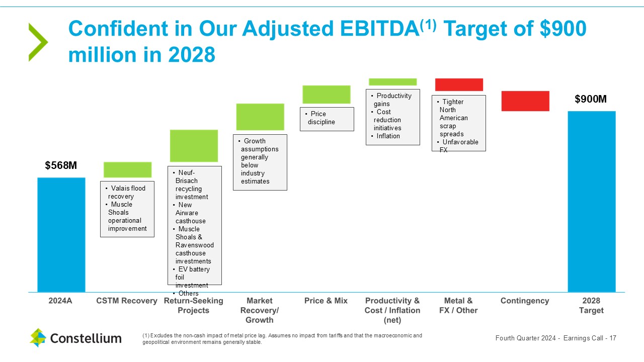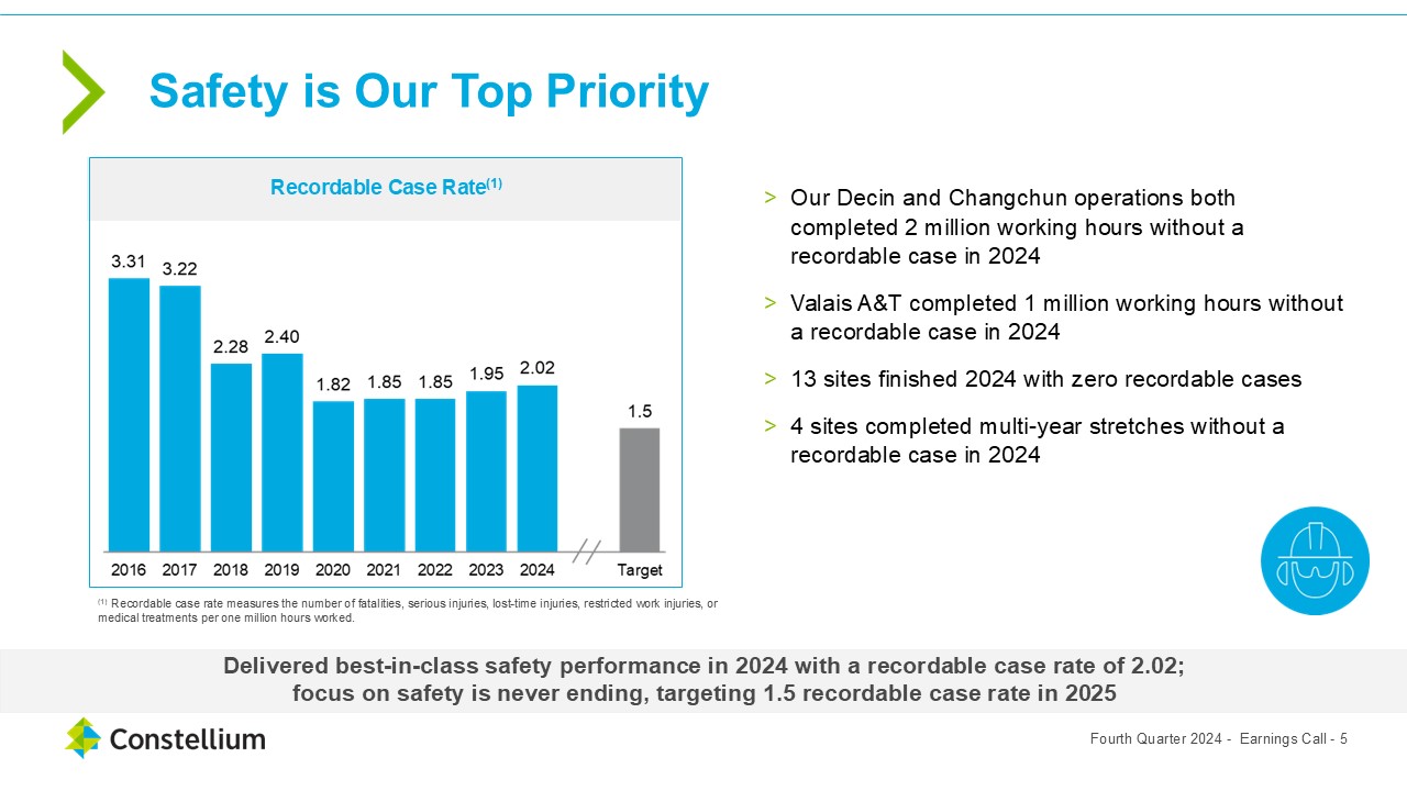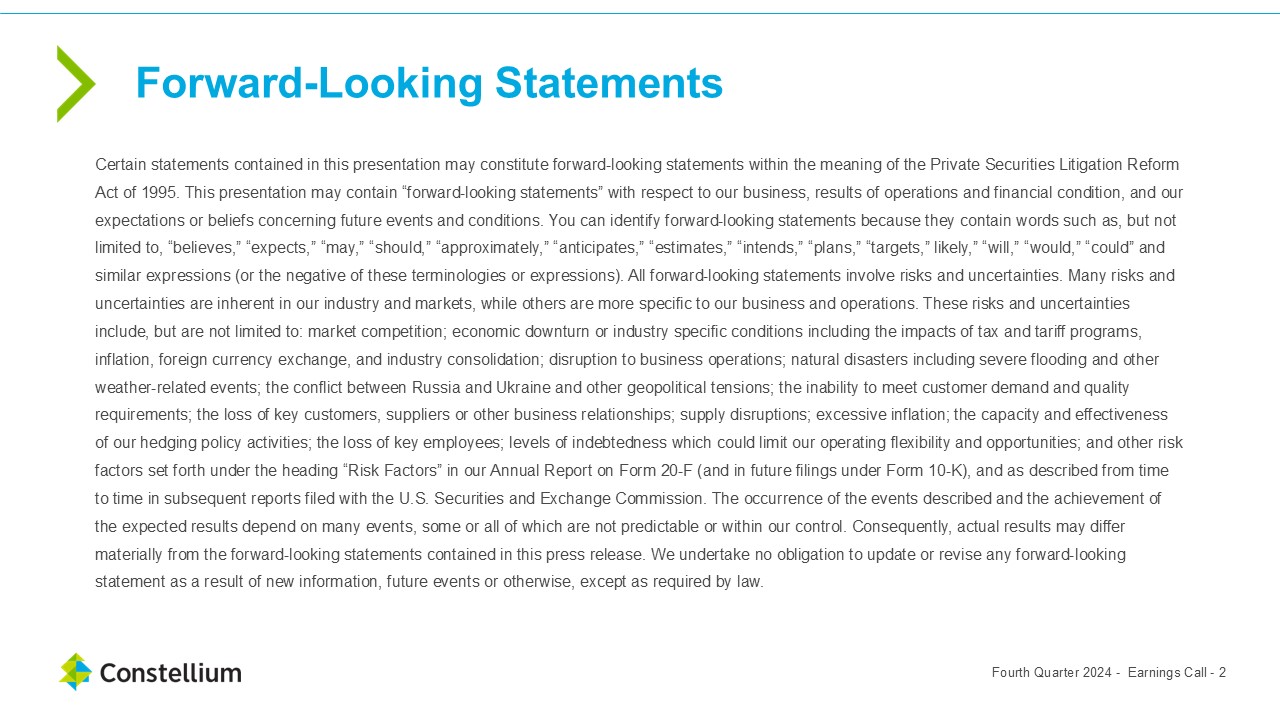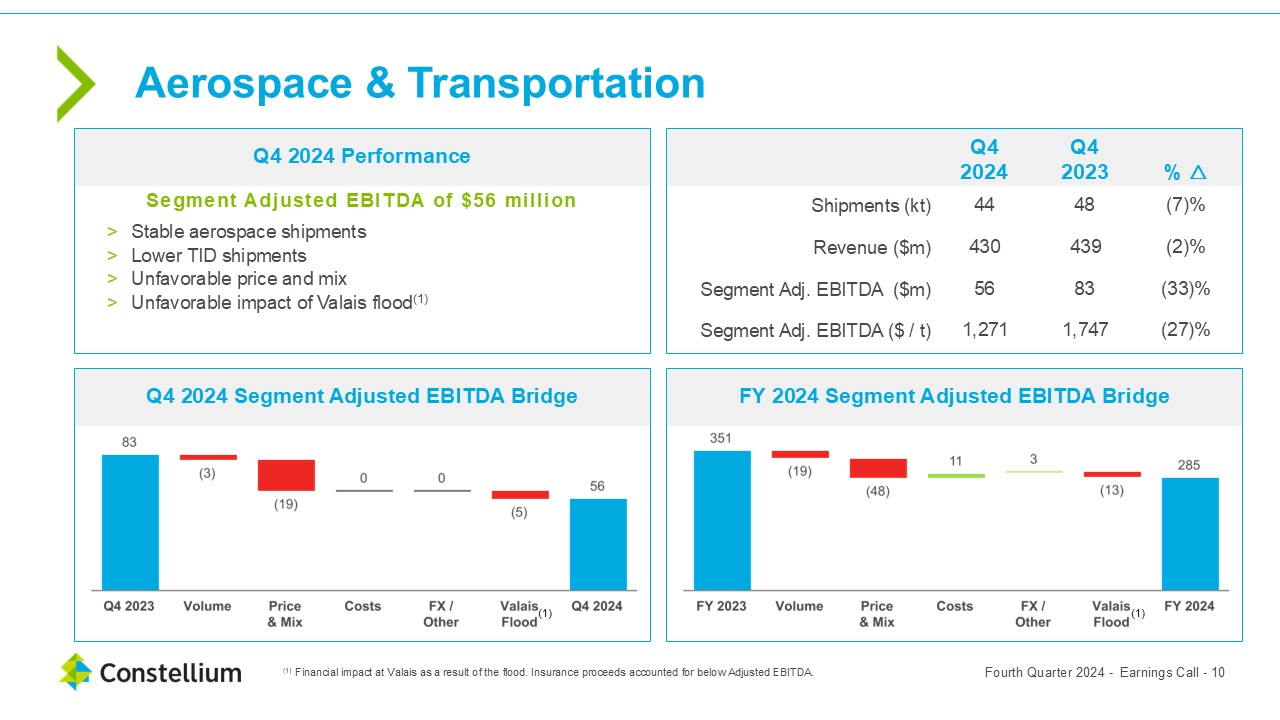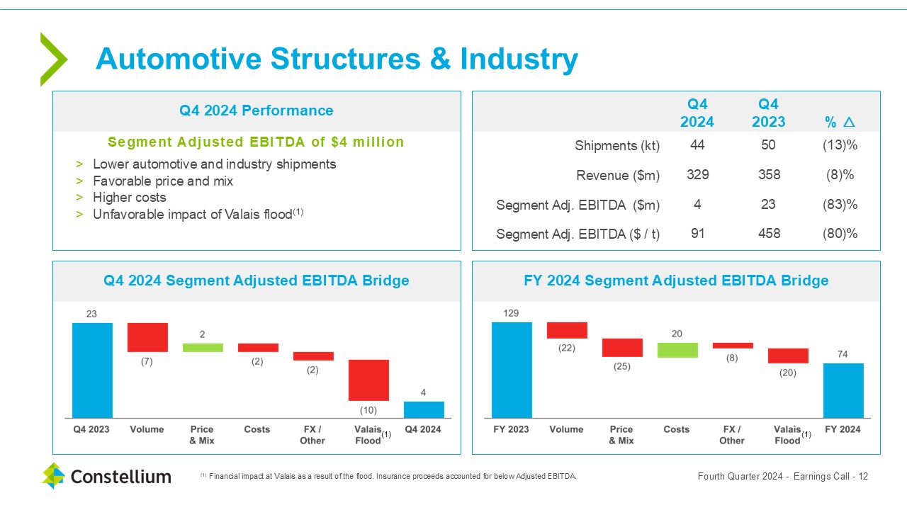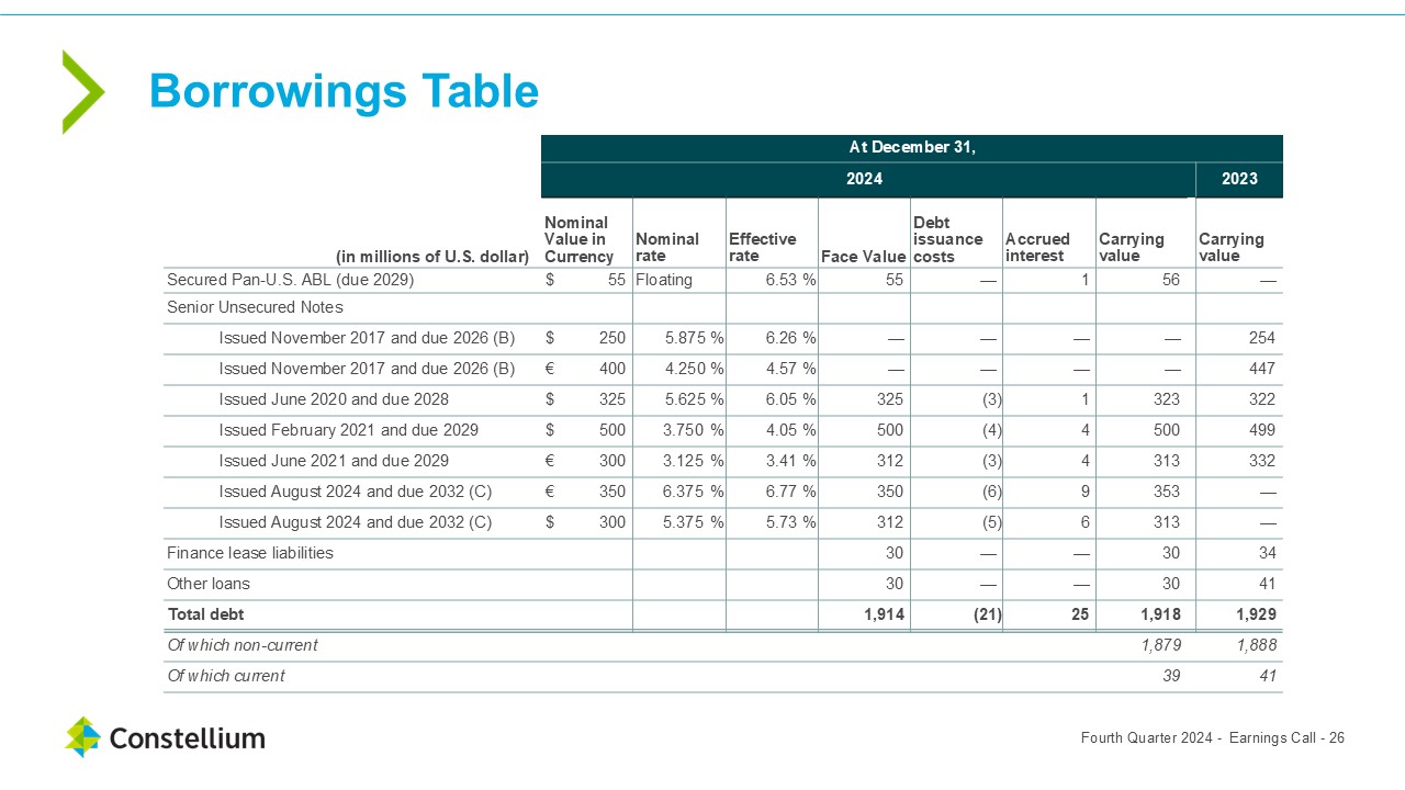 净收入与调整后NOPAT和调整后ROIC ≥ 130的对账2024年第四季度-财报电话会议-截至12月31日的25年,(百万美元)20242023净收入60157所得税费用7575税前收入135232财务成本-净额111111保理安排费用2224衍生工具未实现损失13重新计量货币资产和负债产生的未实现汇兑(收益)/损失-净额(1)2基于股份的补偿成本2522金属价格滞后(55)92处置损失/(收益)4(41)其他(2)1税收影响(1)(64)(112)调整后NOPAT(A)176334(百万美元)20232022无形资产104115财产,厂房及设备净额2,4222,334应收贸易账款及其他,净额-当期531562终止确认的贸易应收款项(2)402401存货1,1971,382贸易应付款项及其他-当期(1,411)(1,580)拨备-当期(21)(23)应付所得税(22)(18)总投资资本(b)3,2023,17320242023调整后的会计年度NOPAT(a)176334截至上一年度12月31日的总投资资本(b)3,2023,173调整后的ROIC(a)/(b)5.5% 10.5%(1)使用集团平均法定税率计算的对净营业利润的税务影响(2)根据我们的保理协议终止确认的贸易应收款项