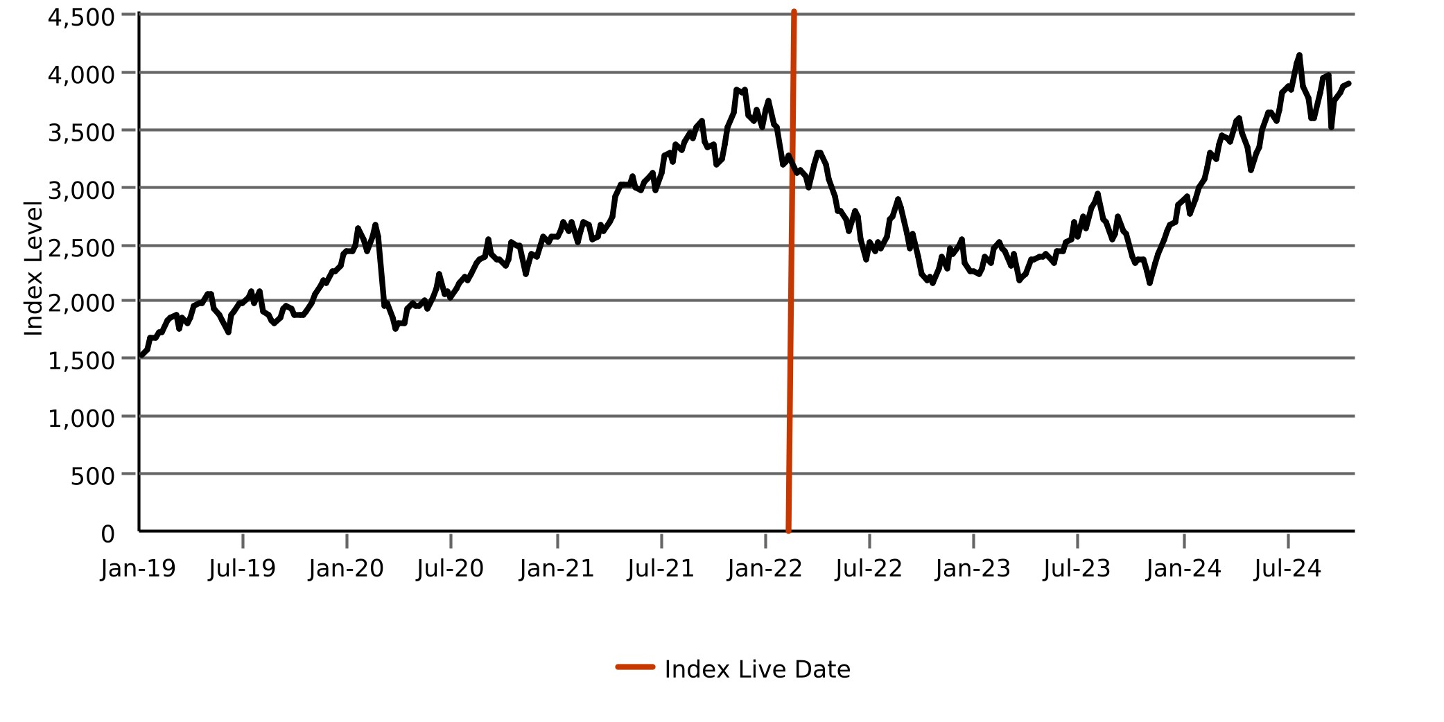 下图列出了基于2019年1月4日至2022年2月4日指数假设回测的每周收盘水平的指数假设回测表现,以及基于2022年2月11日至2024年10月11日指数每周历史收盘水平的指数历史表现。该指数成立于2022年2月11日,如下图竖线所示。垂直线左侧的所有数据都反映了该指数的假设回测表现。该竖线右侧的所有数据均反映了该指数的实际历史表现。2024年10月15日指数收盘水平为3,972.07。我们从Bloomberg Professional获得了收盘水平的上、下®服务(“彭博”),未经独立核实。