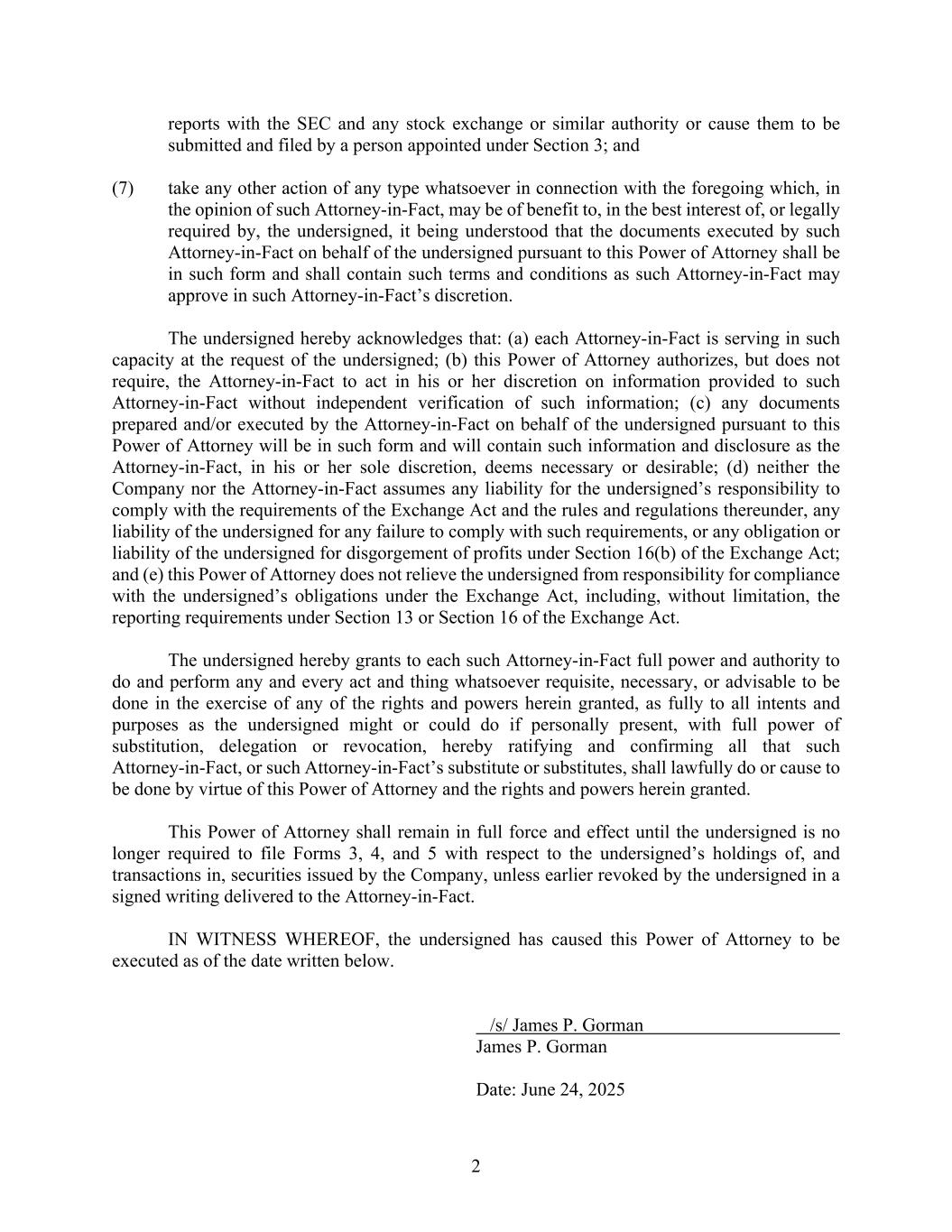 向SEC和任何证券交易所或类似机构提交2份报告,或促使其由根据第3条指定的人提交和归档;(7)就上述事项采取任何其他任何类型的行动,而该实际律师认为,这些行动可能有利于、符合以下签署人的最佳利益或法律要求,据了解,该实际代理人根据本授权书代表以下签署人签署的文件应采用该实际代理人酌情批准的格式,并应包含该实际代理人可能批准的条款和条件。下列签署人在此确认:(a)每一位实际律师是应以下签署人的请求以该身份任职的;(b)本授权书授权但不要求实际律师对提供给该实际律师的信息行使其酌处权,而无需对该信息进行独立核实;(c)实际律师根据本授权书代表以下签署人准备和/或签立的任何文件将采用该形式,并将包含实际律师全权酌情决定的信息和披露,认为必要或可取;(d)公司或实际代理人均不对以下签署人遵守《交易法》及其规则和条例的责任承担任何责任,以下签署人因未能遵守此类要求而承担的任何责任,或以下签署人根据《交易法》第16(b)节对利润的追缴承担的任何义务或责任;(e)本授权书并不免除以下签署人遵守《交易法》规定的义务的责任,包括但不限于,《交易法》第13条或第16条规定的报告要求。下列签署人特此授予每一名该等实际代理人全权和授权,在行使本协议授予的任何权利和权力时,完全按照以下签署人在亲自出席时可能或可能做的所有意图和目的,做和执行任何必要、必要或可取的任何行为和事情,并具有完全的替代、转授或撤销权,特此批准和确认该等实际代理人或该等实际代理人的替代人或替代人的所有行为和事情,应凭藉本授权书及本授权书所授予的权利和权力合法地作出或促使作出。本授权书应保持完全有效,直至以下签署人不再需要就以下签署人持有和交易公司发行的证券提交表格3、4和5,除非以下签署人以交付给实际代理人的签署书面形式提前撤销。下列签署人已促使本授权书自下述日期起获签立,以作为证明。/s/James P. GormanJames P. Gorman日期:2025年6月24日