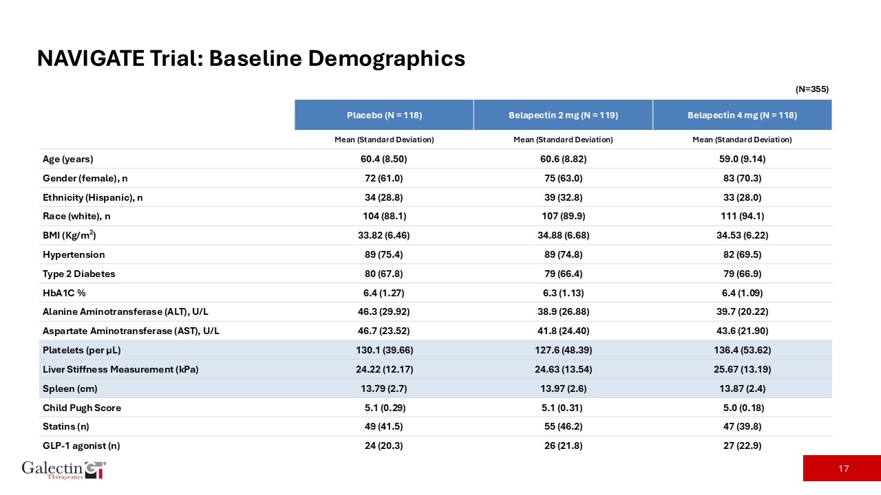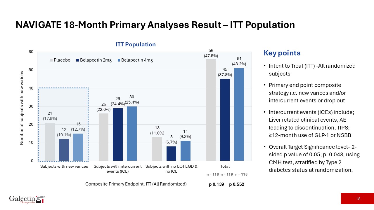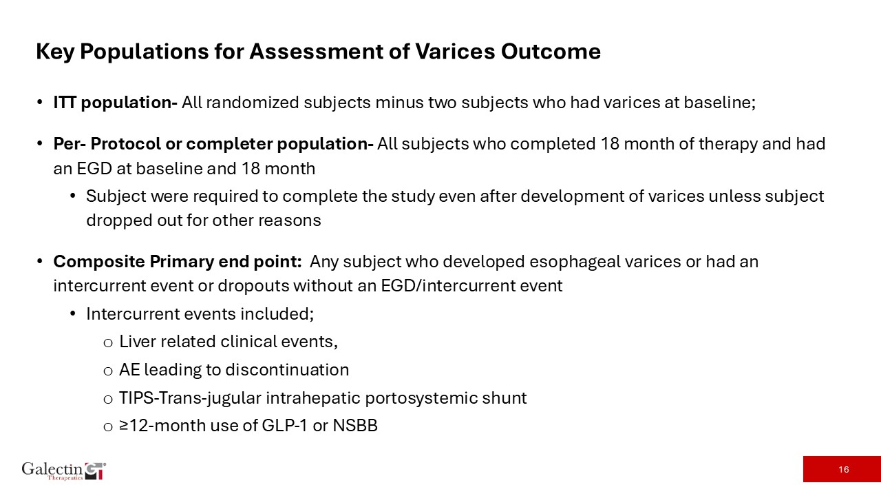 15NAVIGATE研究:患者群体和疗效终点MASH肝硬化无静脉曲张EGD CTP评分< 7门静脉高压证据:血小板计数< 150,000/mm3。或以下AST/ALT中至少两种> 1脾≥ 14cm经成像硬度≥ 20kPA复合主要终点在ITT人群中每个方案人群(完成者)发生静脉曲张的发生率肝失代偿事件全因死亡率大静脉曲张或红壁征静脉曲张需要治疗的患者比例MELD ≥ 15肝移植ALT =丙氨酸氨基转移酶;AST =天冬氨酸转氨酶;CTP = Child-Turcotte-Pugh;EGD =食管胃十二指肠镜;MELD =终末期肝病模型。*同时发生的事件包括:肝脏相关临床事件、导致停药的任何AE、TIPS经颈静脉肝内门体分流术;≥ 12个月使用GLP-1或NSBB ITT-意向治疗关键纳入标准主要终点复合次要终点