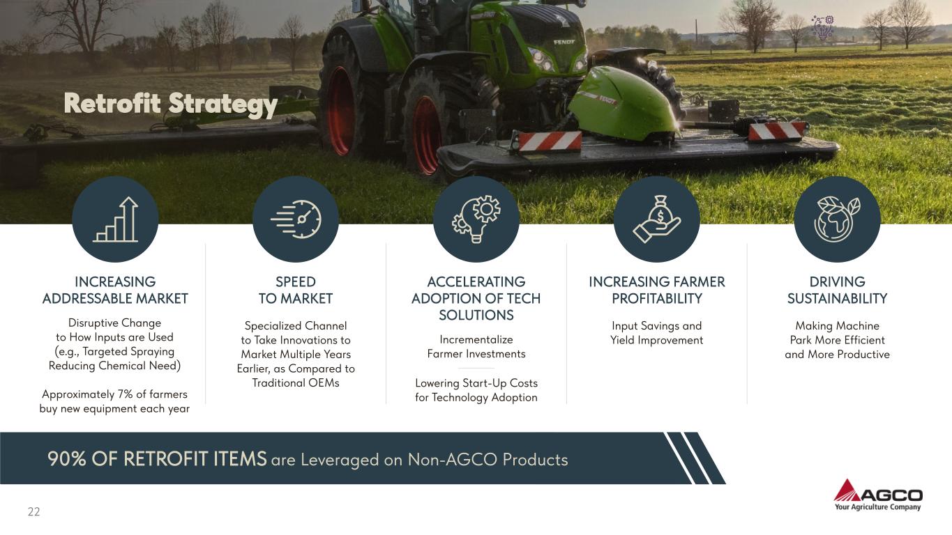 越来越多可处理的市场对投入使用方式的颠覆性改变(例如,有针对性地喷洒以减少化学品需求)大约7%的农民每年购买新设备,从而推动可持续性制造机器园更高效、更有生产力地提高农民的盈利能力投入节约和产量提高专业化渠道将创新产品提前数年推向市场,与传统主机厂相比,加快采用技术解决方案的速度增加了农民投资,从而降低了技术采用改造战略的启动成本90%的再改造项目被用于非爱科公司产品22